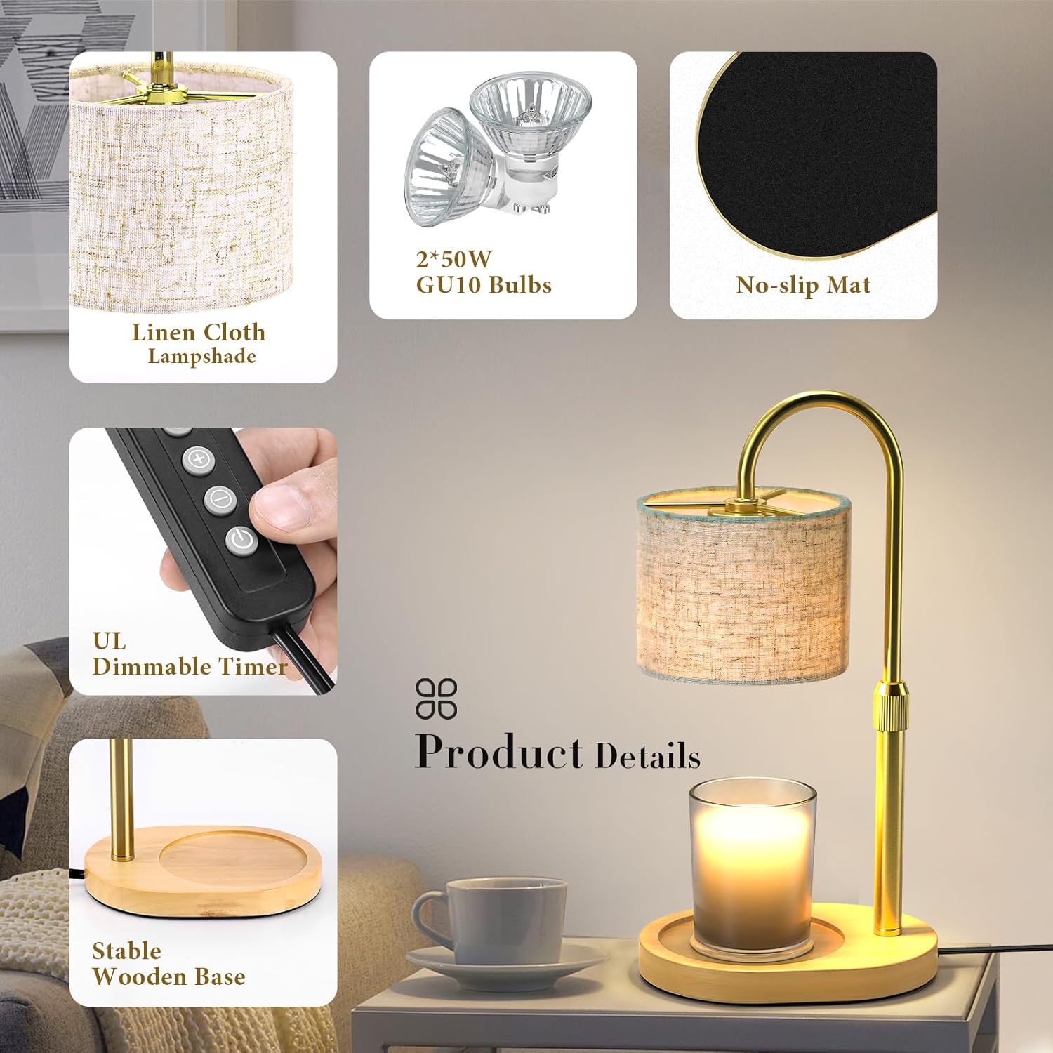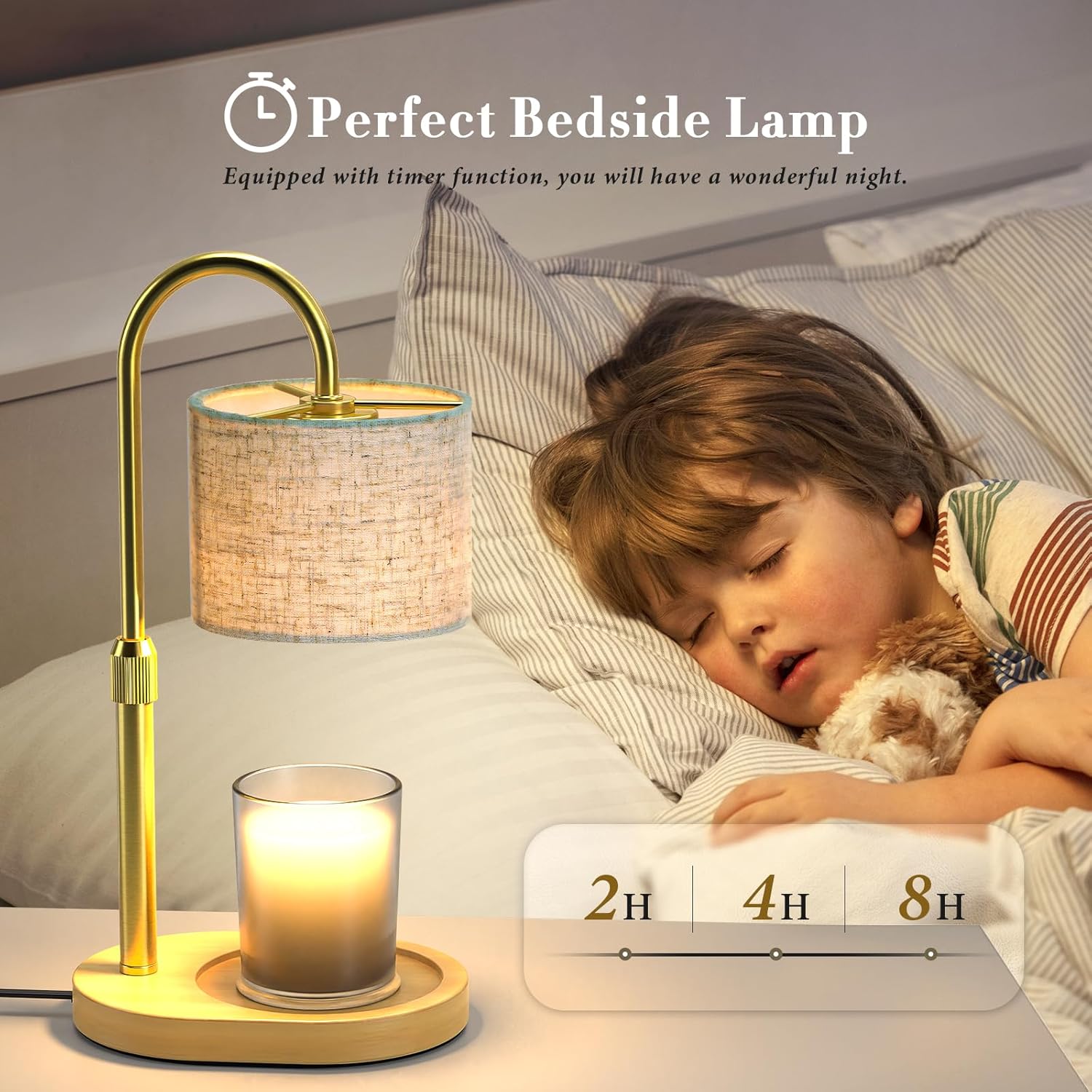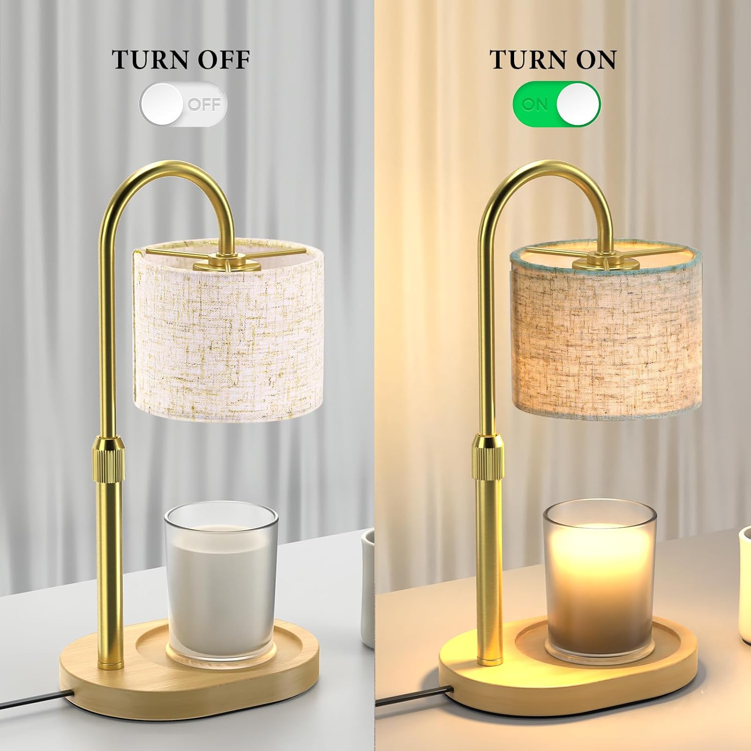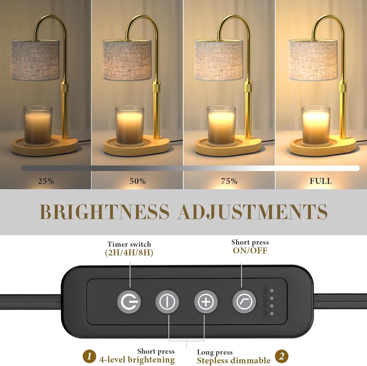 Golden Candle Warmer Lamp with Timer Dimmer, Height Adjustable Electric Candle Warmer Wax Heater with Wooden Base 2 Bulbs, Birthday Gifts for Women Her, Mom, House Warming Gifts New Home