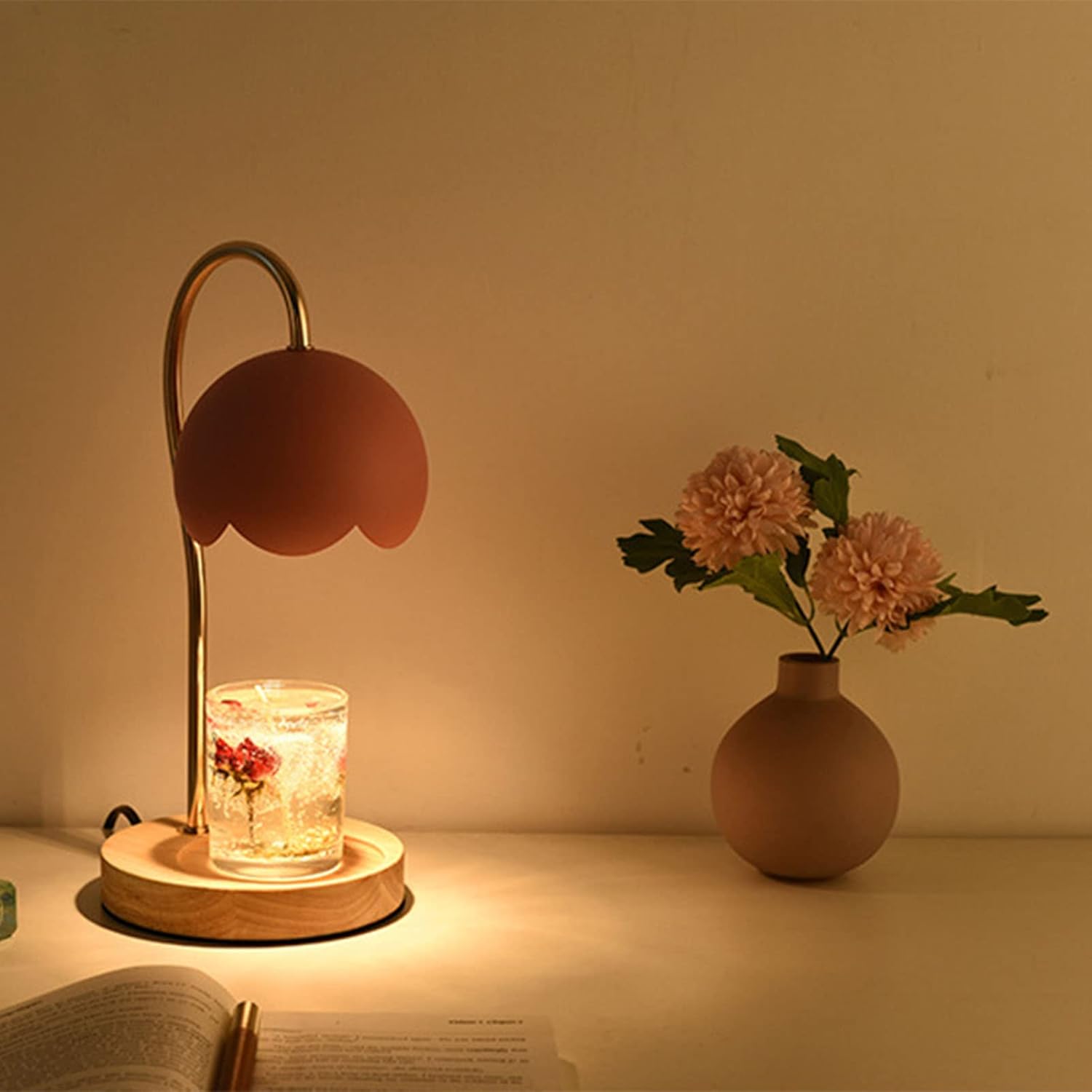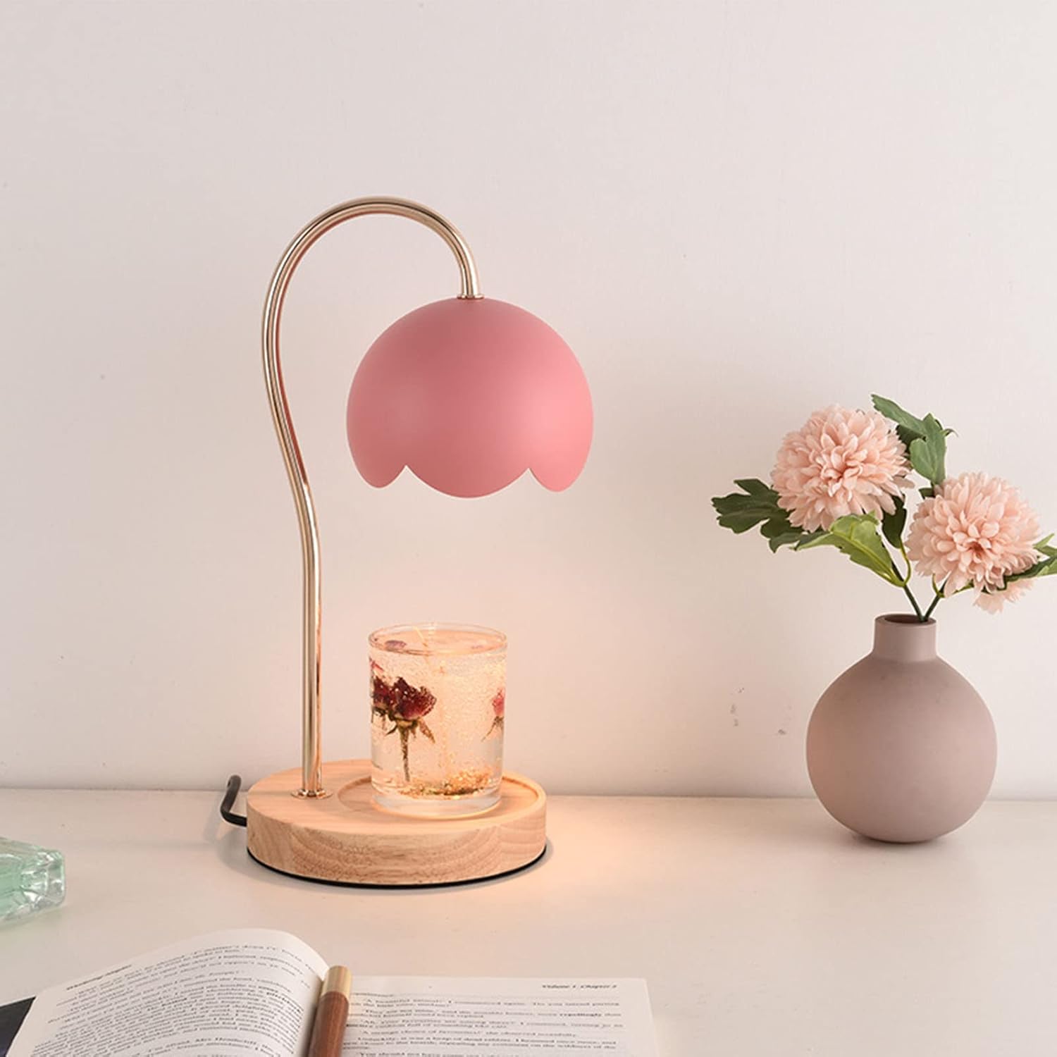 MOTUZP Fragrance Candle Warmer Lamp Electric Candle Warmer Wax Warmer Lamp Dimmable Metal Candle Warmer Lantern with Wood Base for Bedroom EU Plug(Pink)