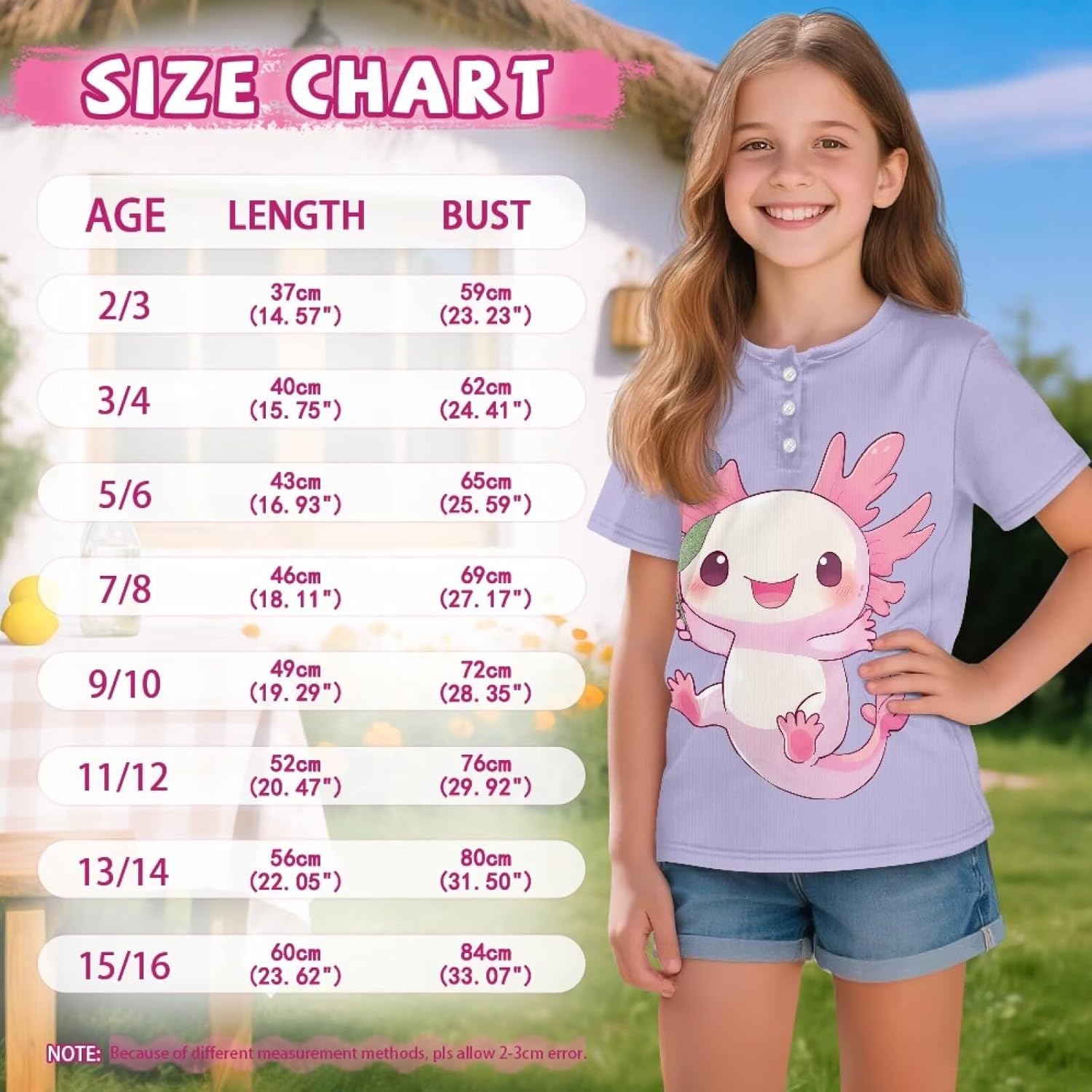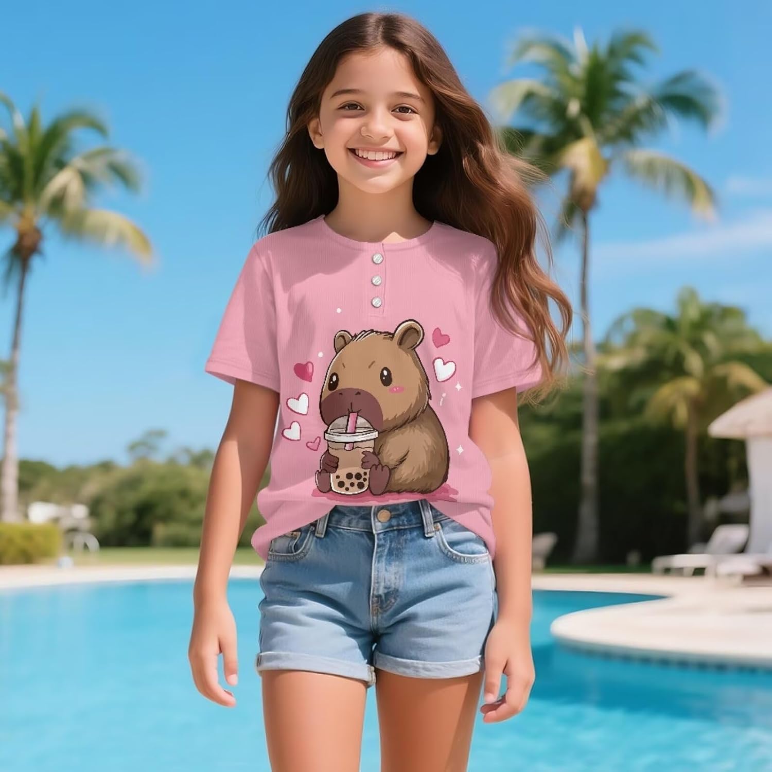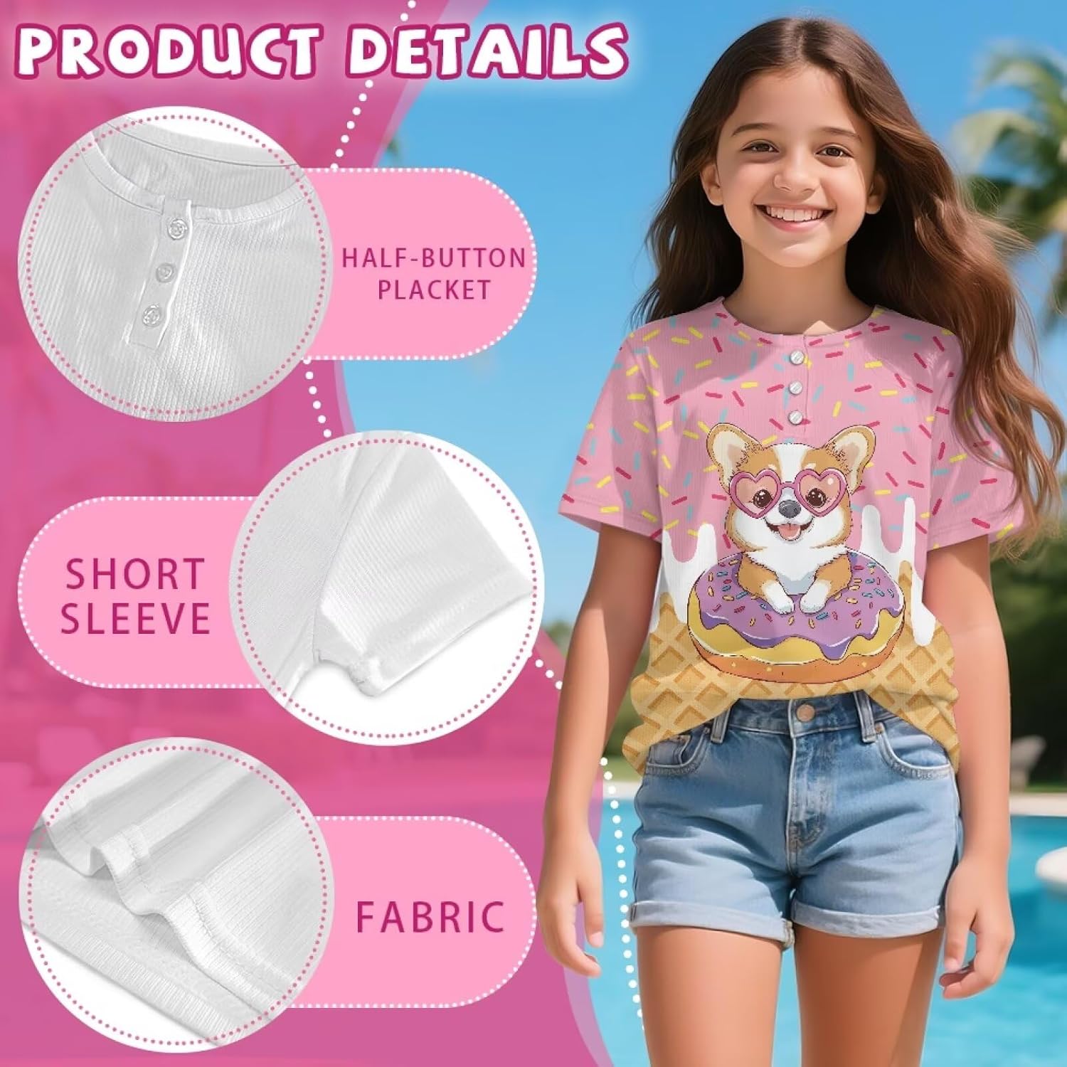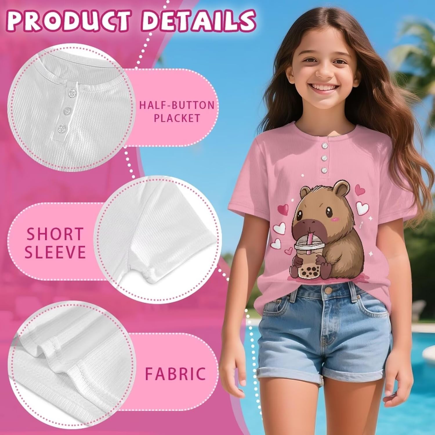 Girls Shirt Short Sleeve T-Shirt Henley Casual Basic Summer Tee Tops for Kids Teen 2-12 Years