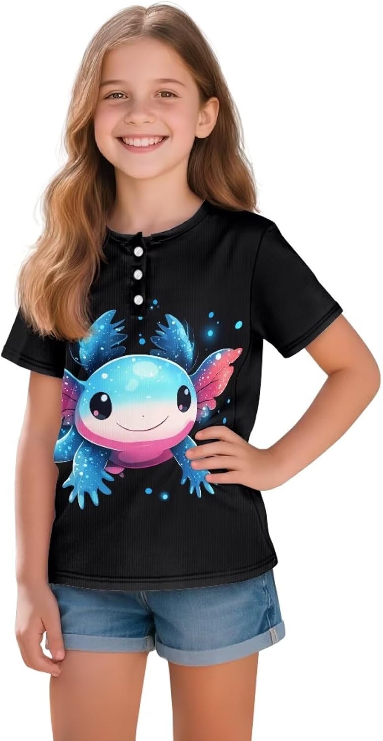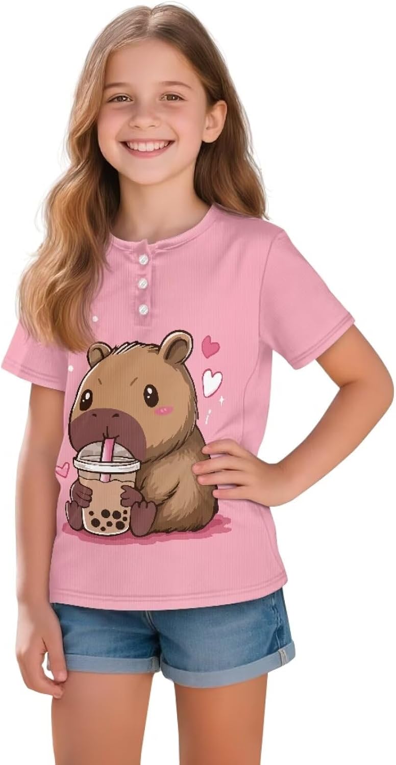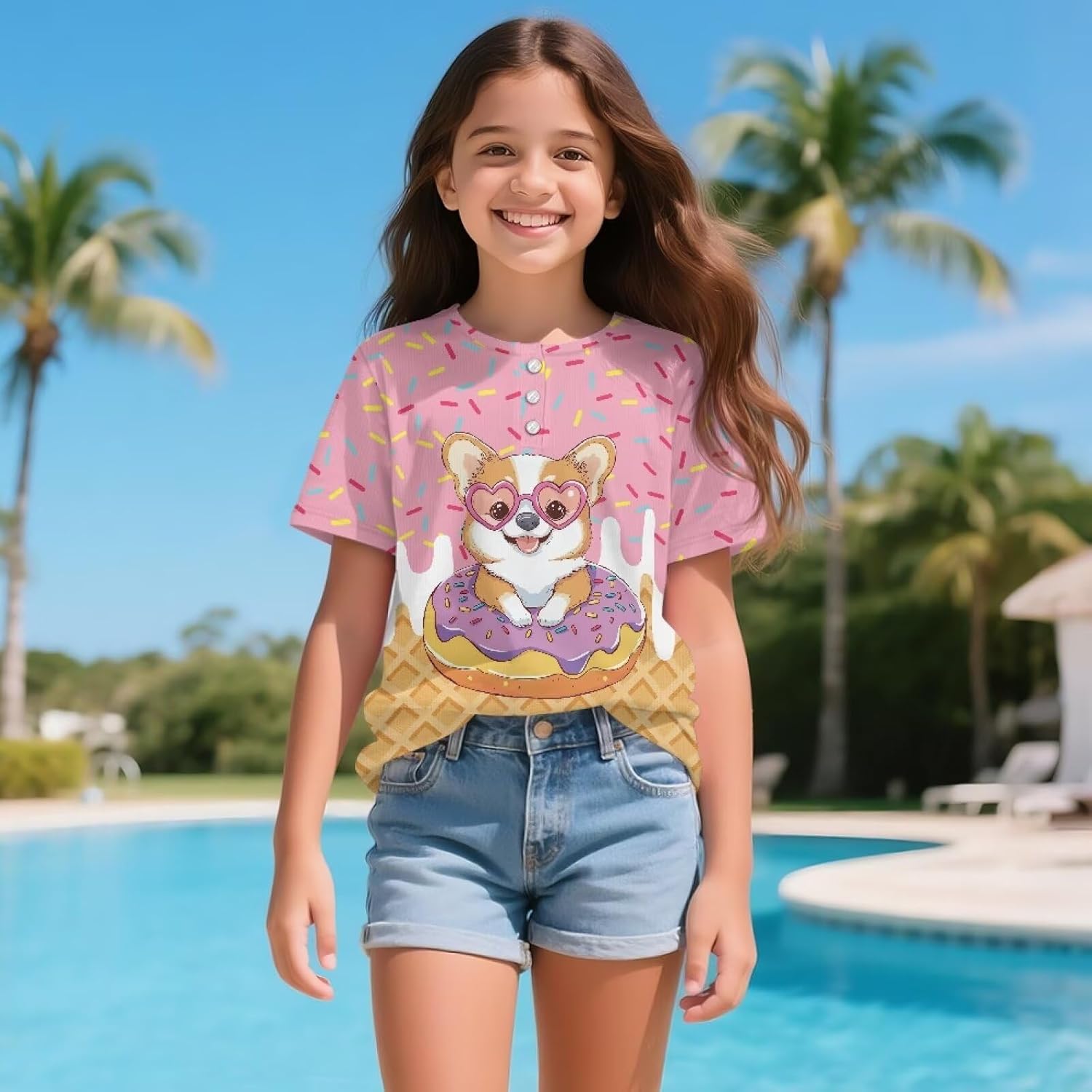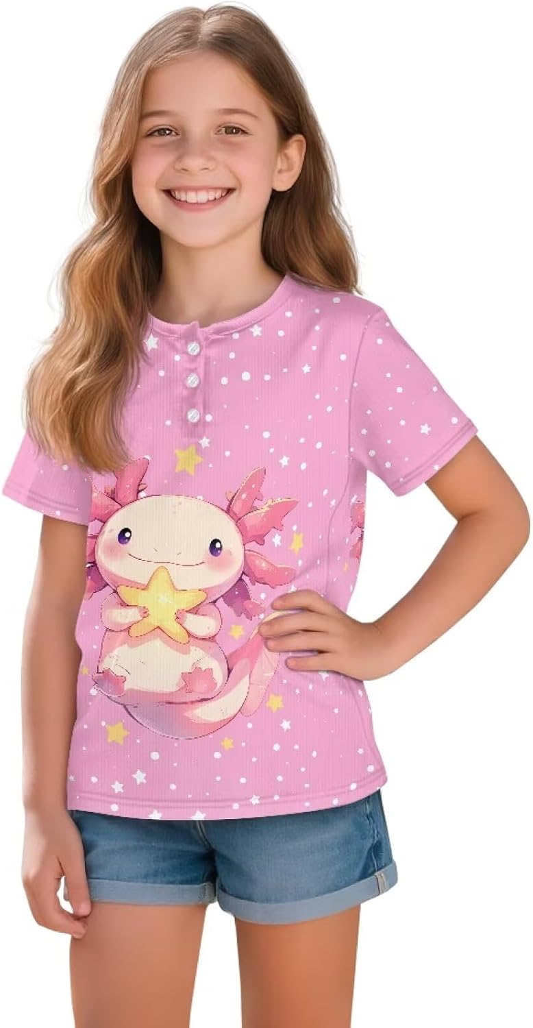Girls Shirt Short Sleeve T-Shirt Henley Casual Basic Summer Tee Tops for Kids Teen 2-12 Years