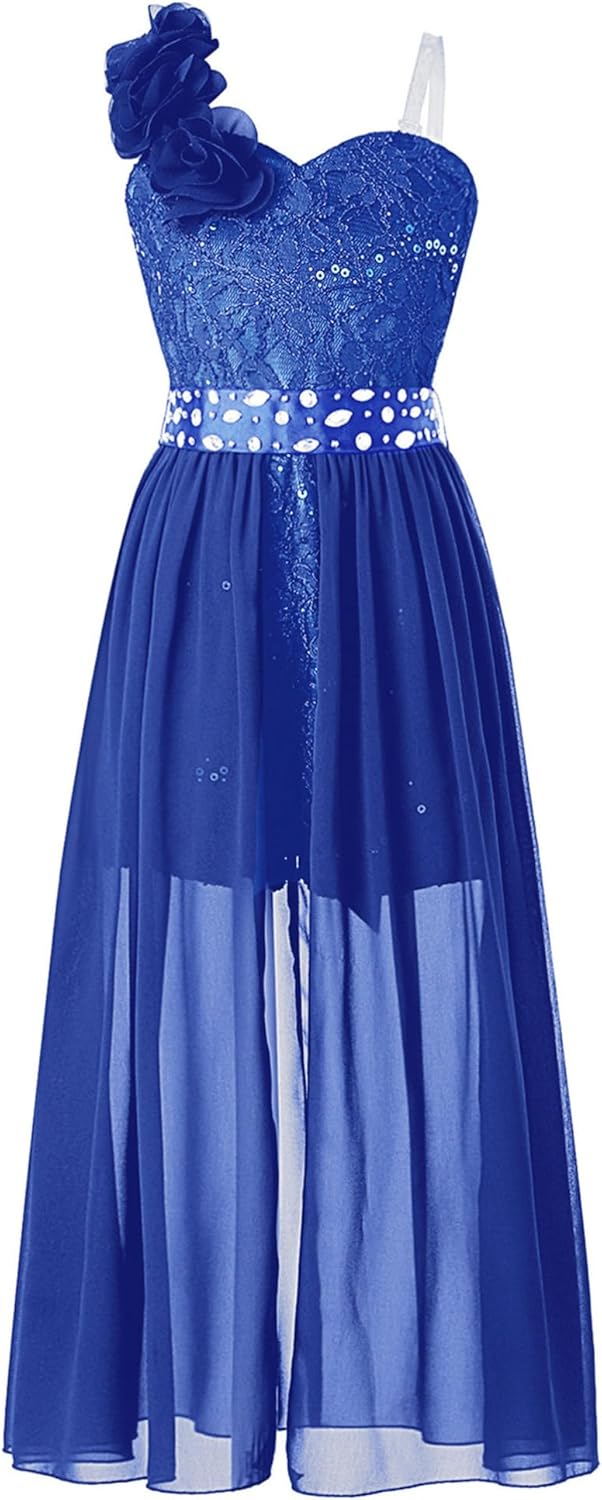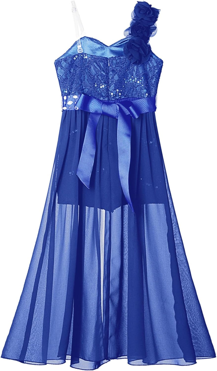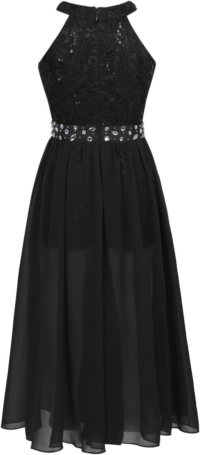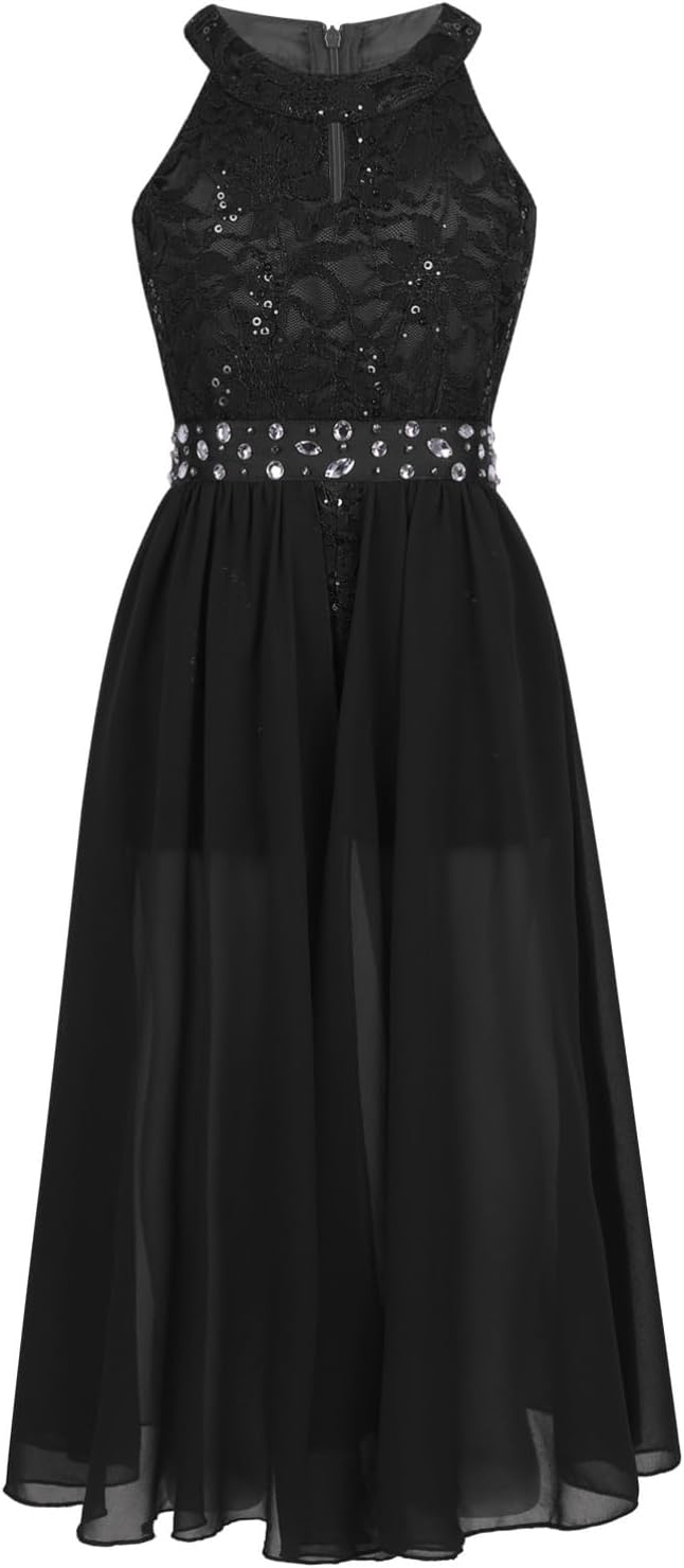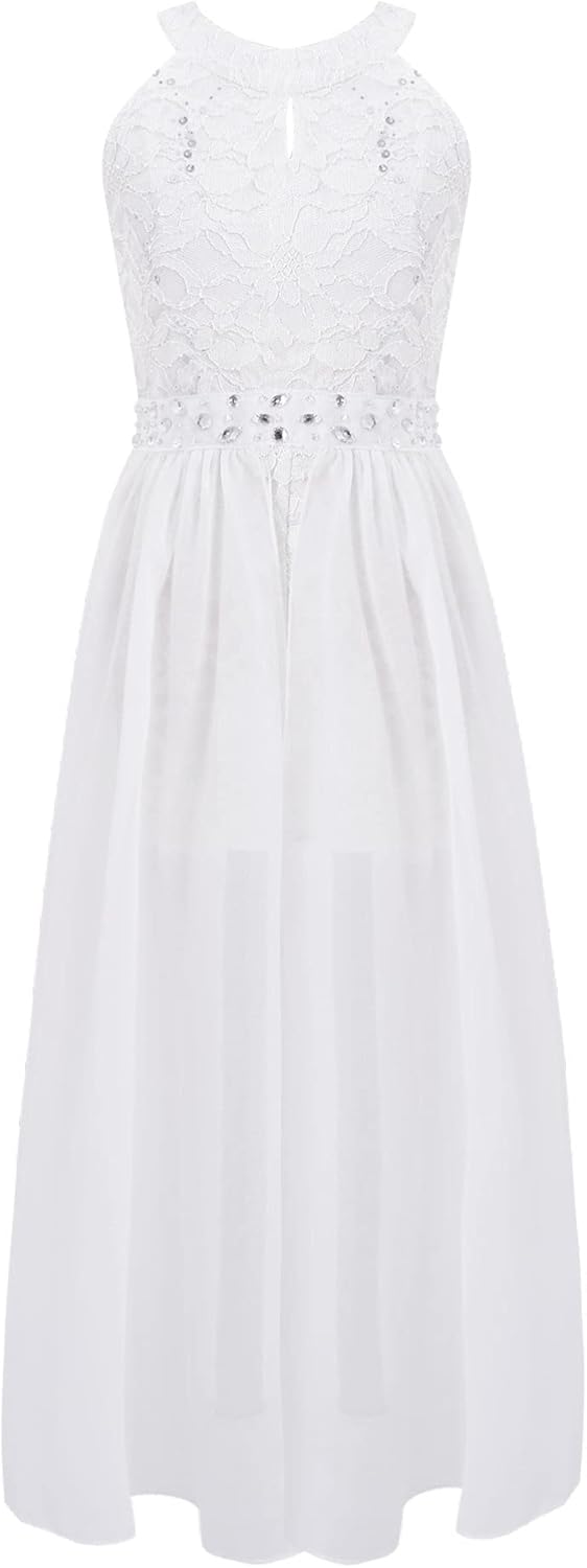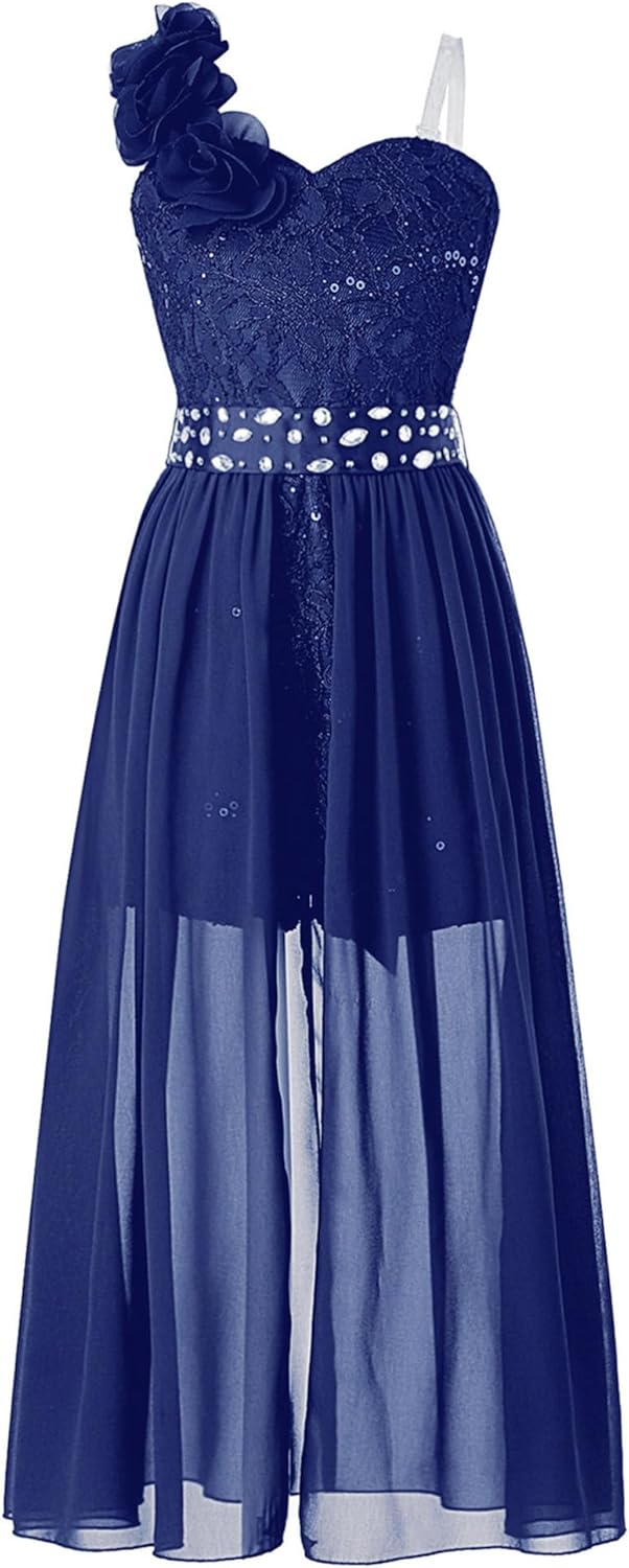 Kids Girls Sleeveless Floral Lace Shiny Rhinestones Birthday Party Maxi Dress Pageant Dancing Romper Gowns