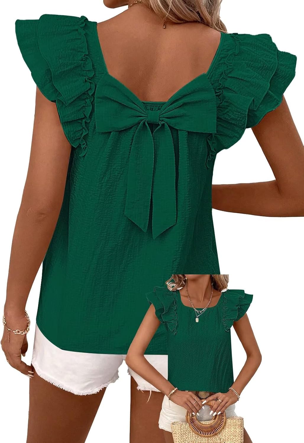 Womens Bow Tie Back Tops Round Neck Ruffle Short Sleeve Shirts Cute Babydoll Chiffon Tee Women Summer Trendy Tunic