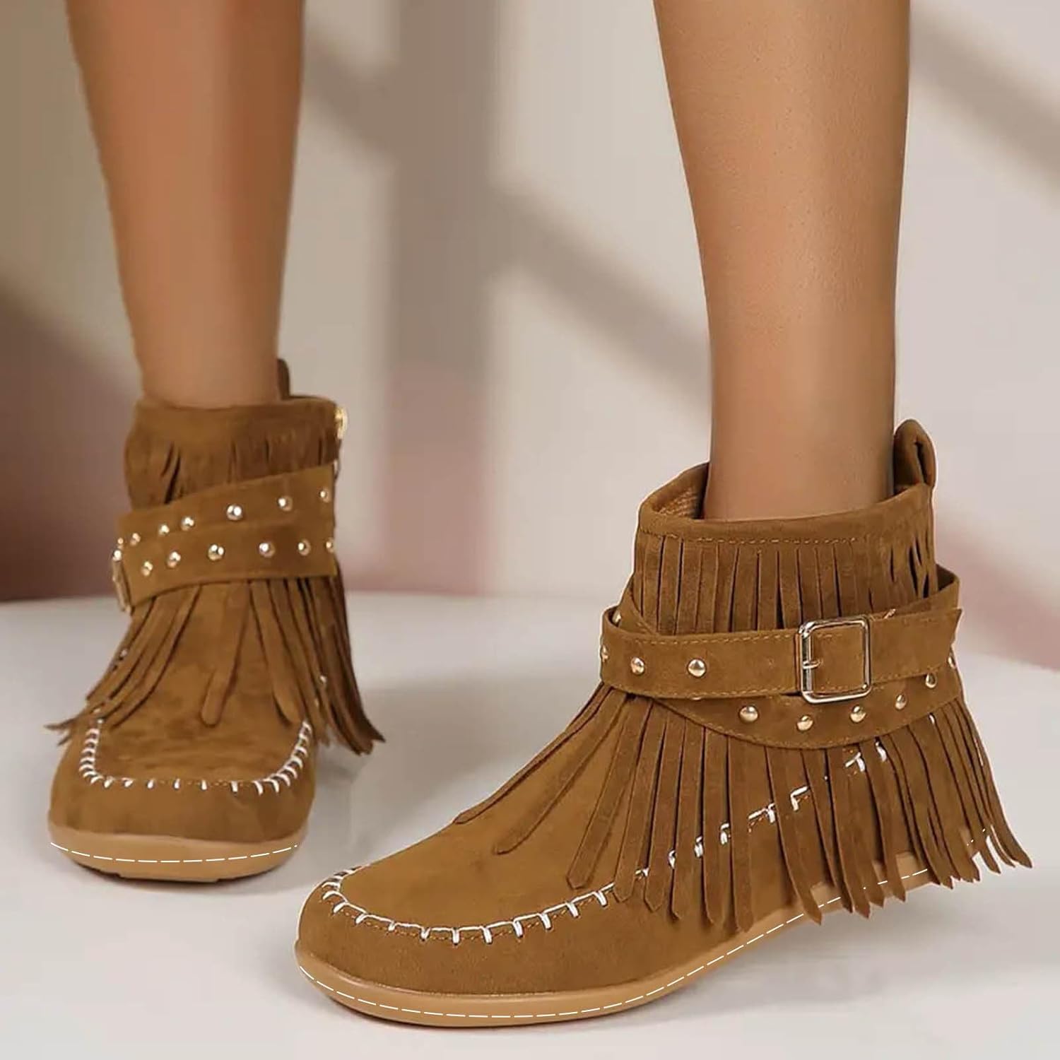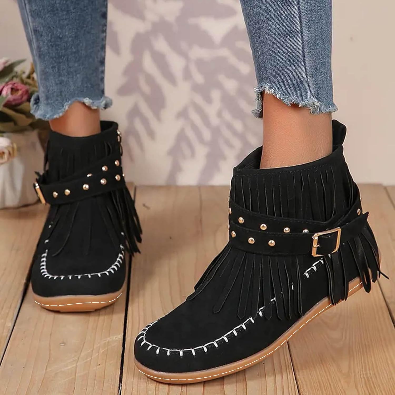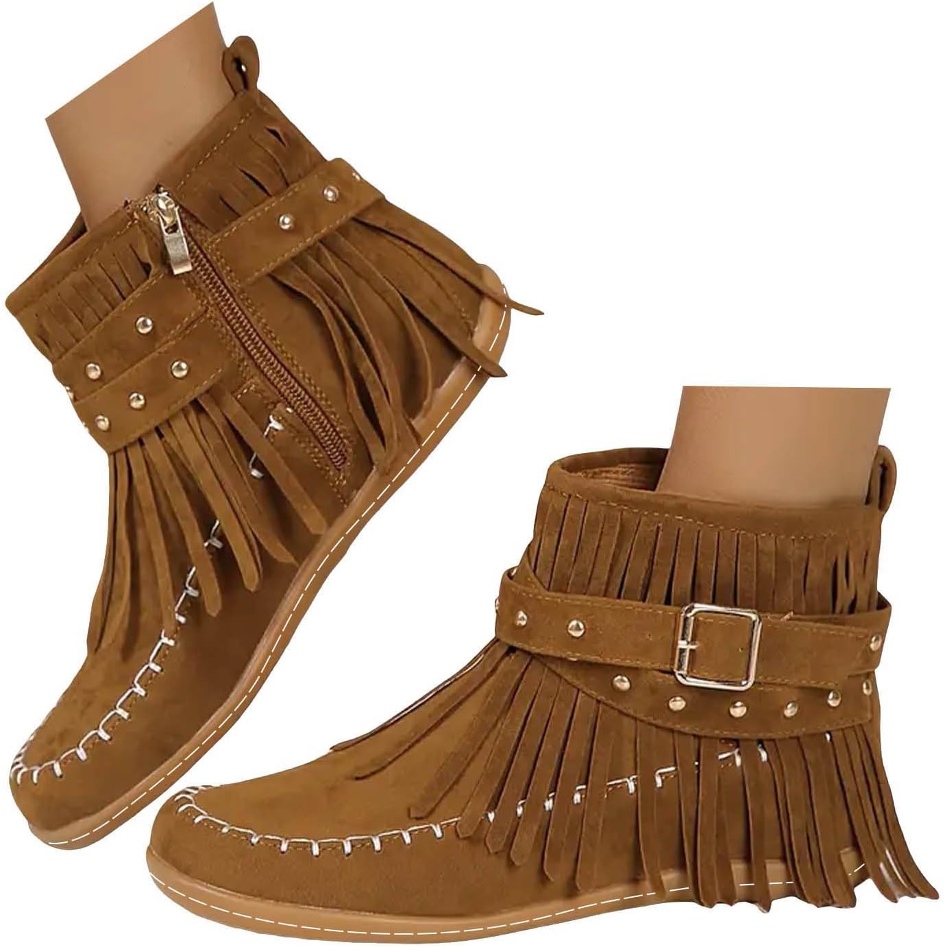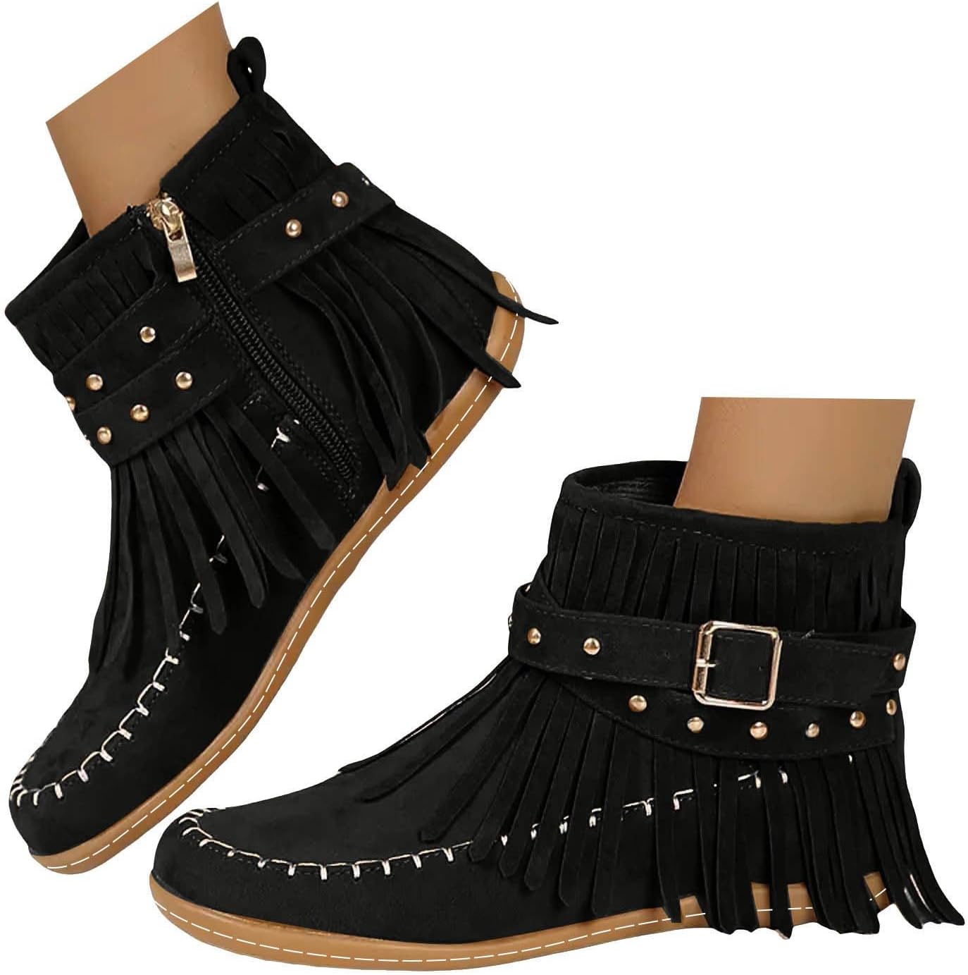 Cowboy Boots for Women Fringe Studded Stitched Ankle Booties 2025 Roman Retro Round Toe Side Zipper Flock Cowgirl Boots