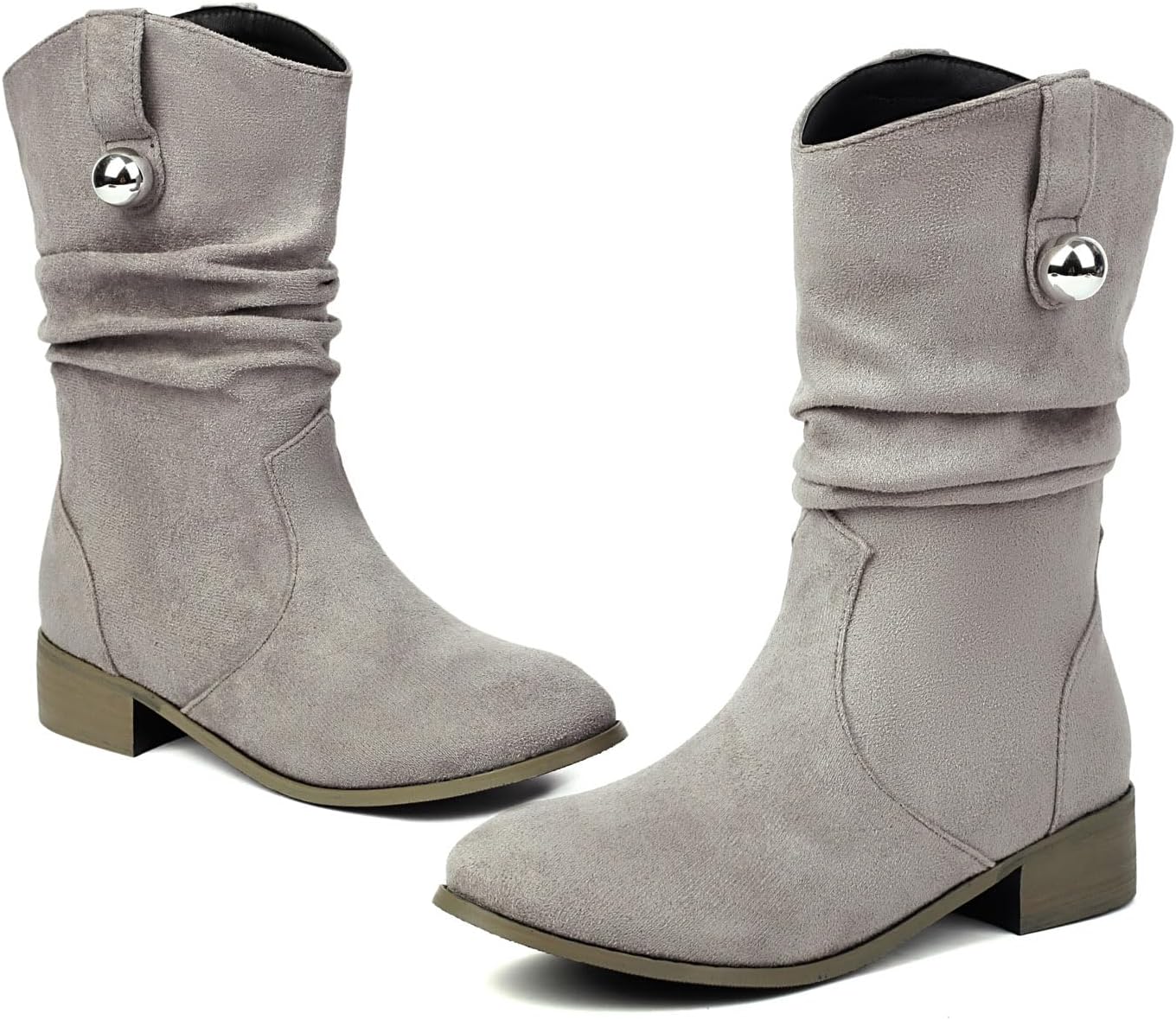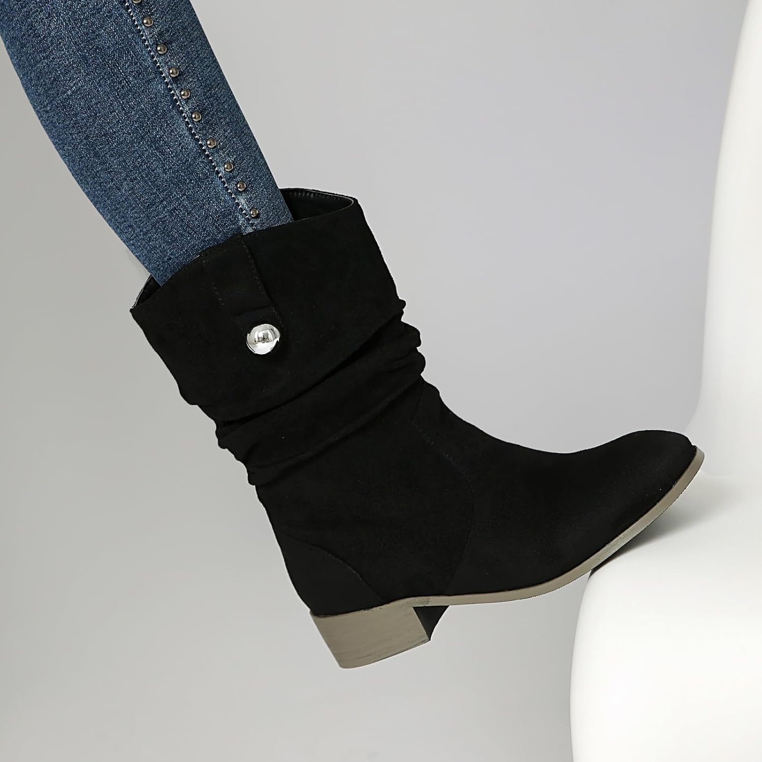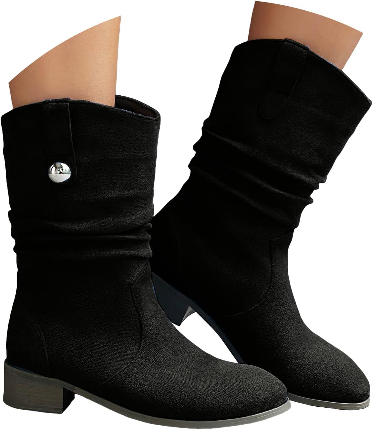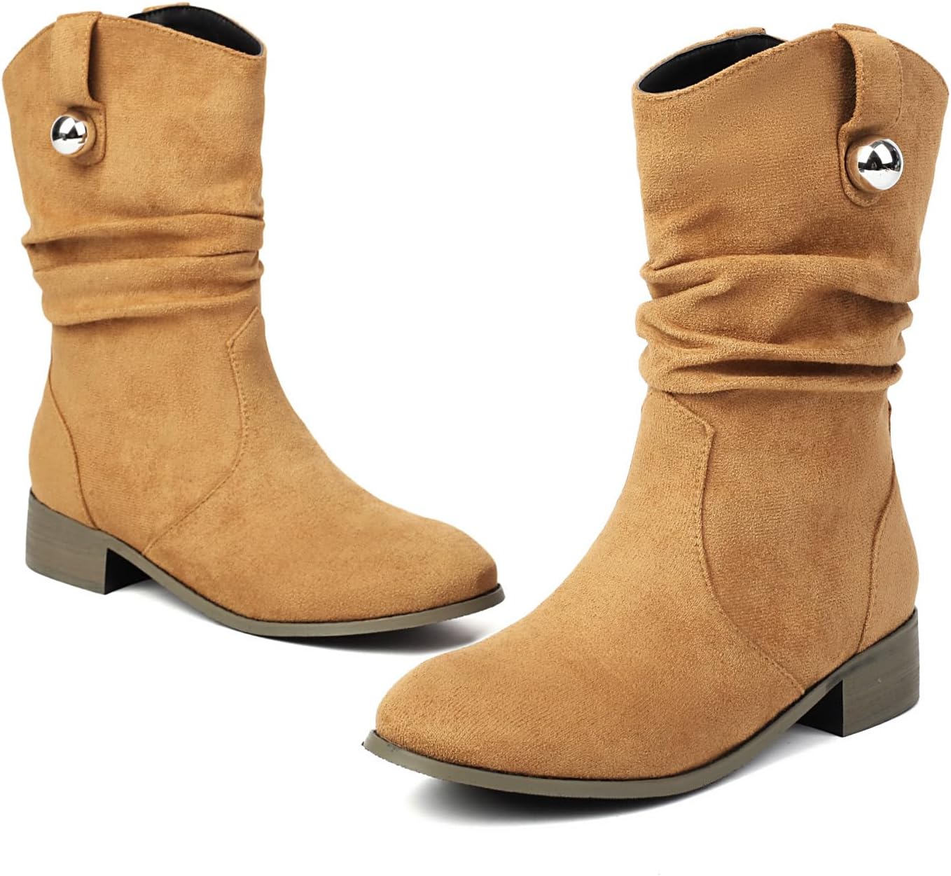 Crzidha Womens Western Suede Wide Width Boots Casual Round Toe Solid Color Pull on Shoes Fashion Slouchy Pleated Tall Shoes with Chunky Low Heel Fall Comfortable Lightweight Mid-Calf Short Booties