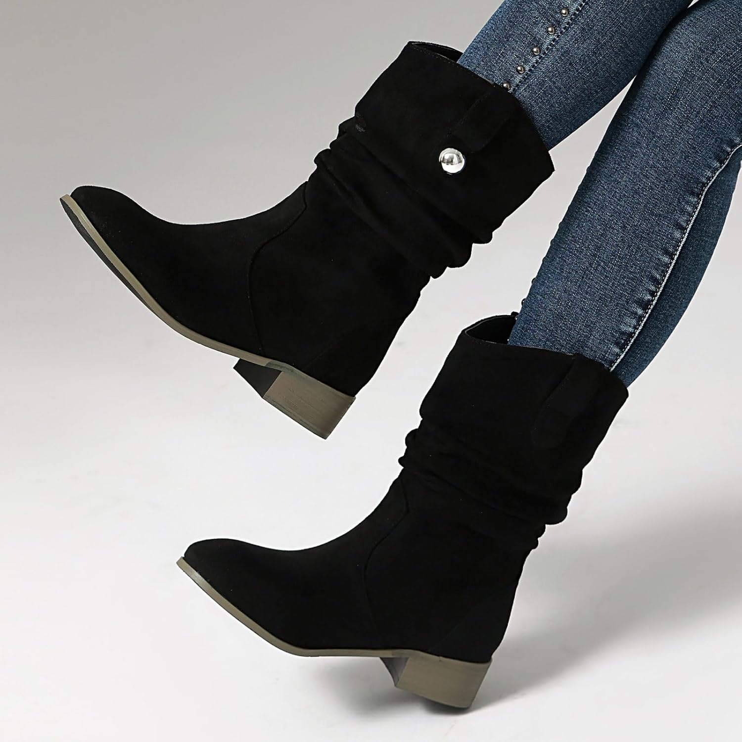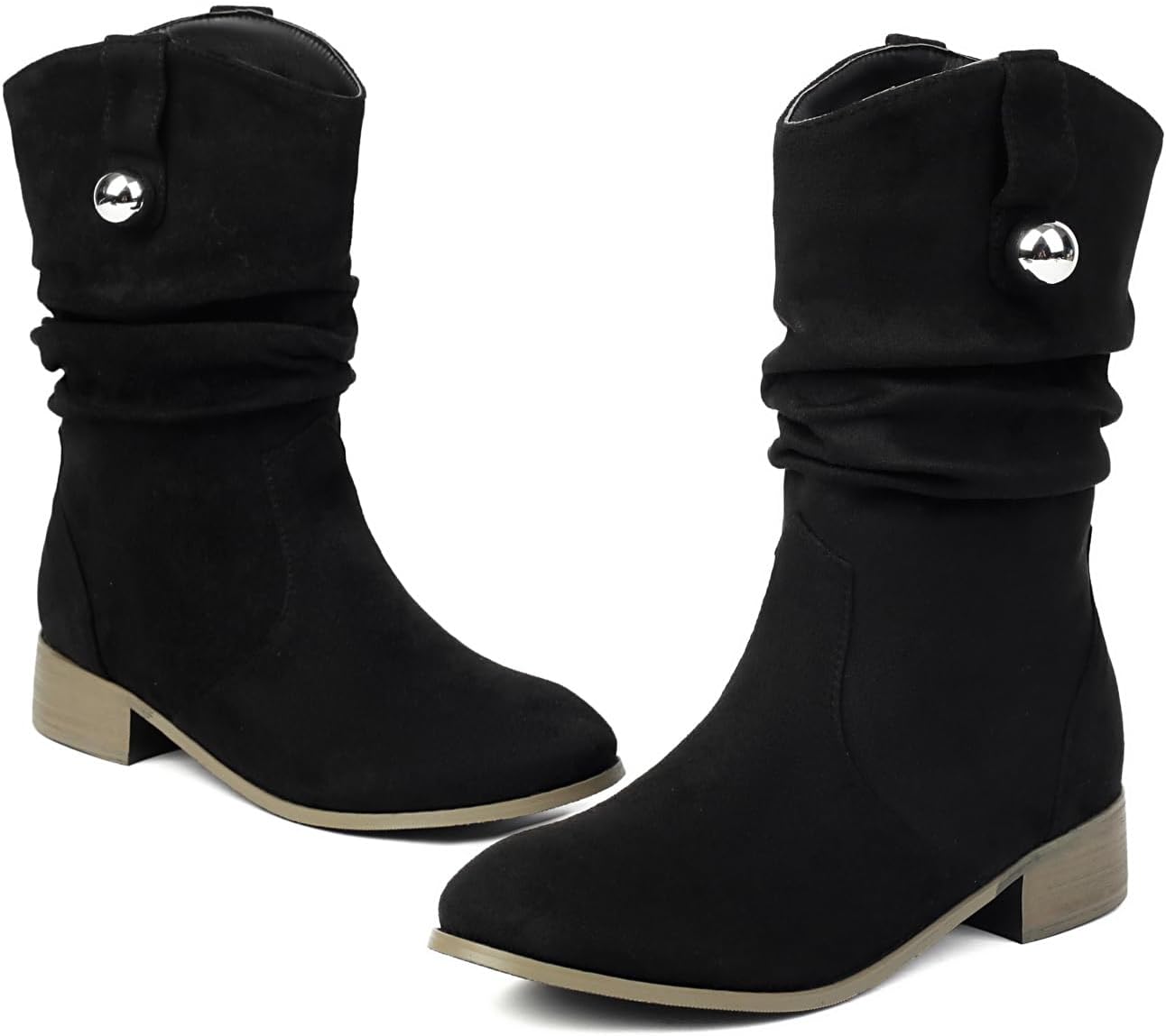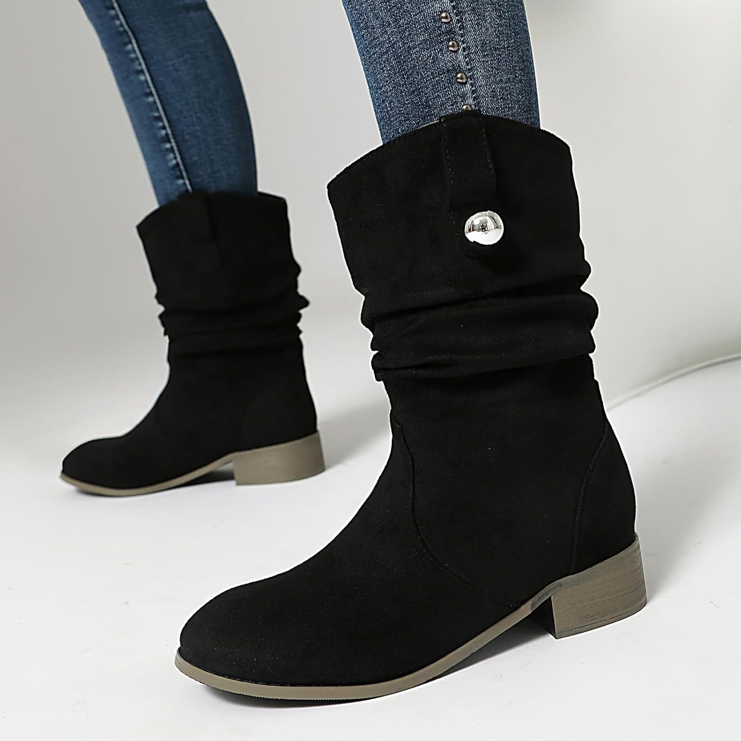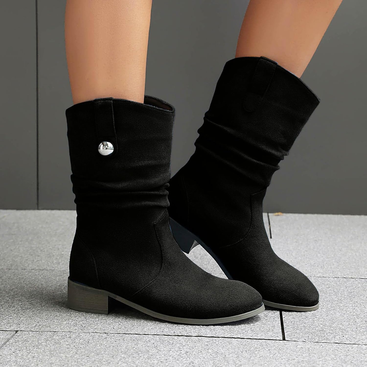 Crzidha Womens Western Suede Wide Width Boots Casual Round Toe Solid Color Pull on Shoes Fashion Slouchy Pleated Tall Shoes with Chunky Low Heel Fall Comfortable Lightweight Mid-Calf Short Booties