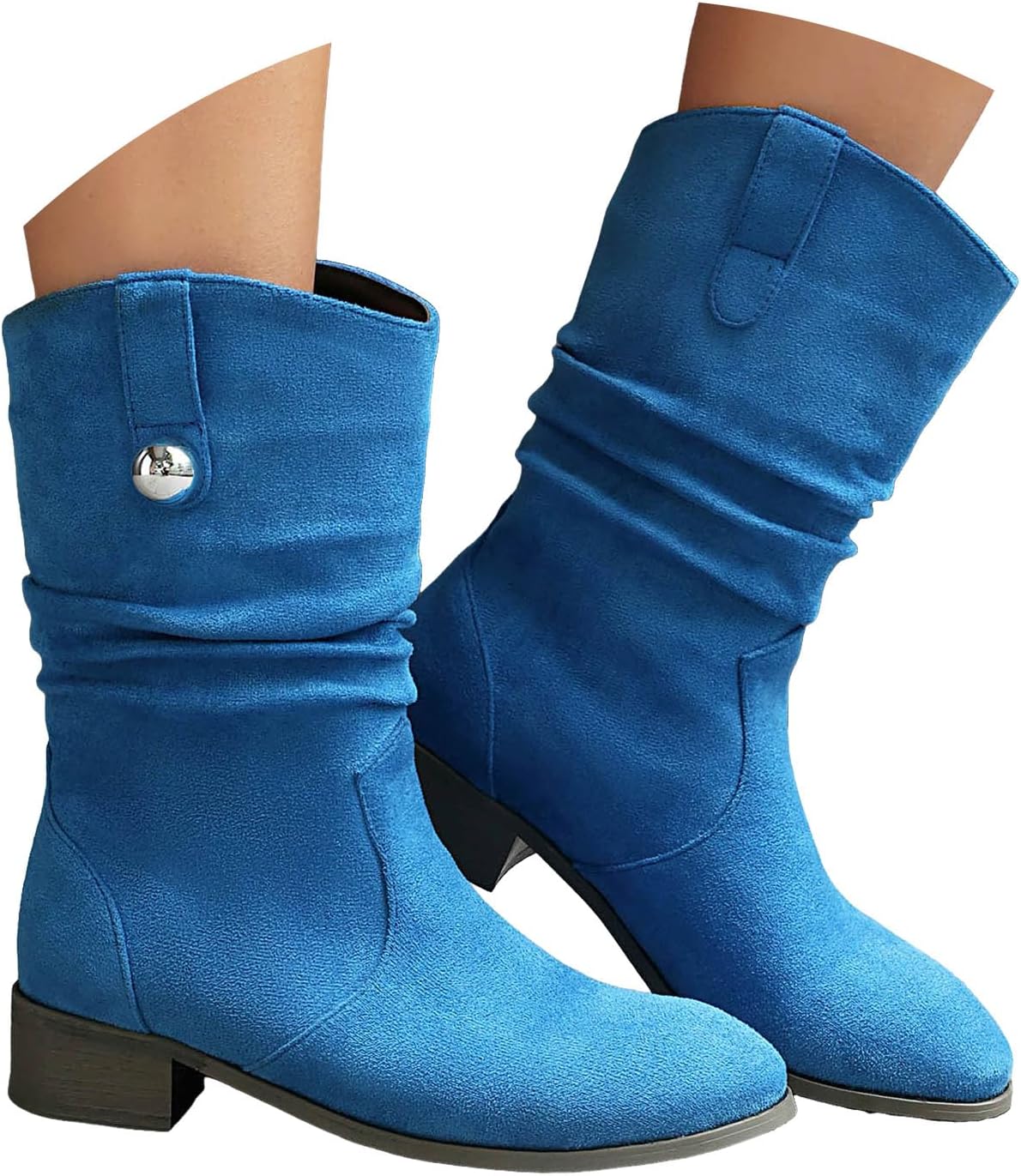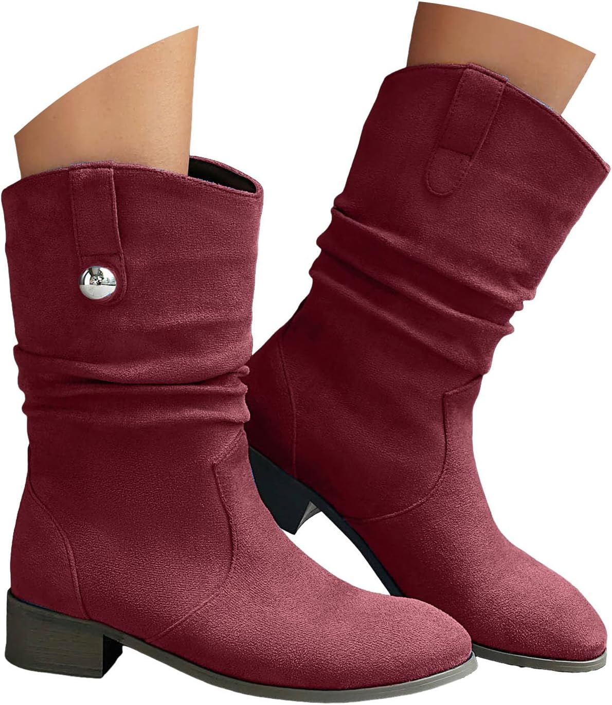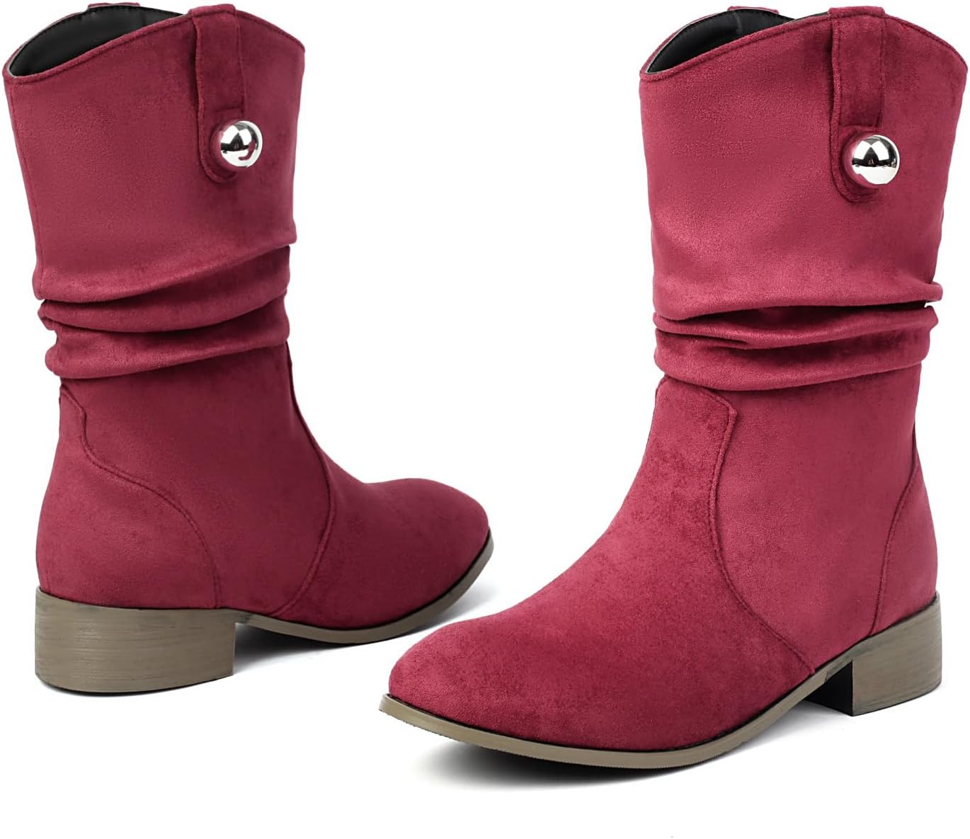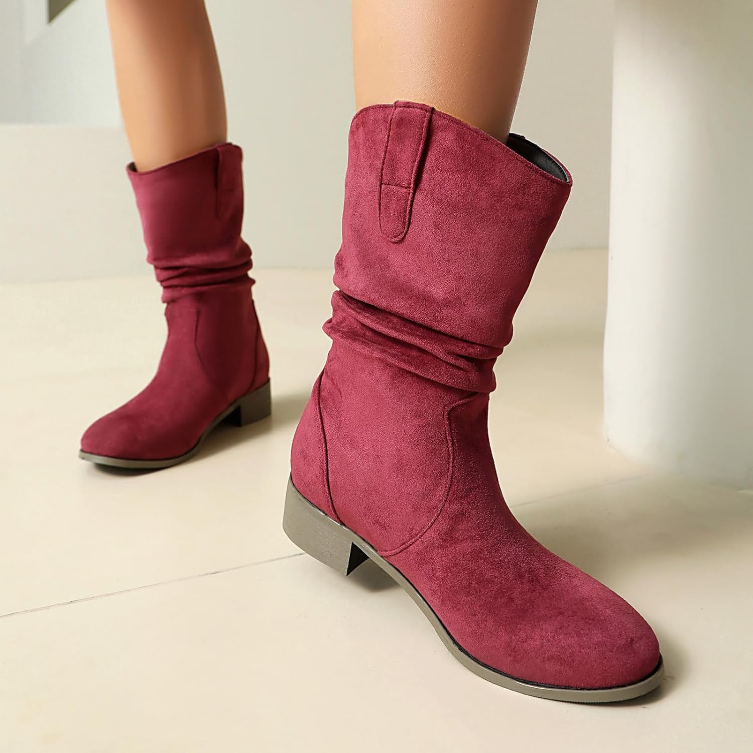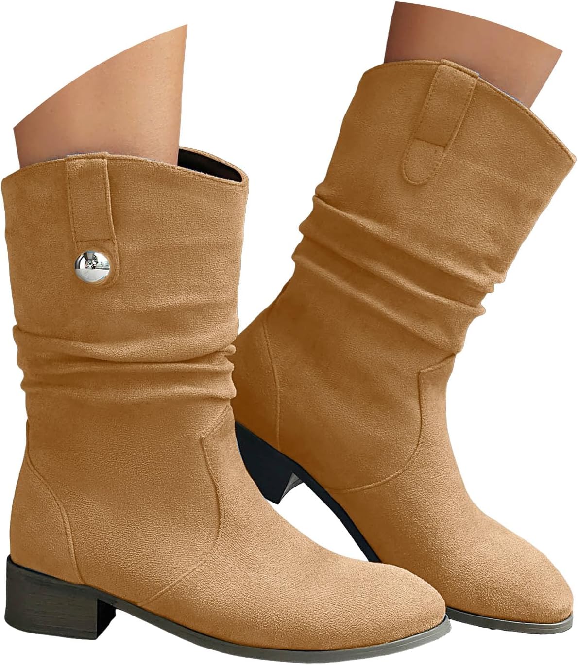 Crzidha Womens Western Suede Wide Width Boots Casual Round Toe Solid Color Pull on Shoes Fashion Slouchy Pleated Tall Shoes with Chunky Low Heel Fall Comfortable Lightweight Mid-Calf Short Booties