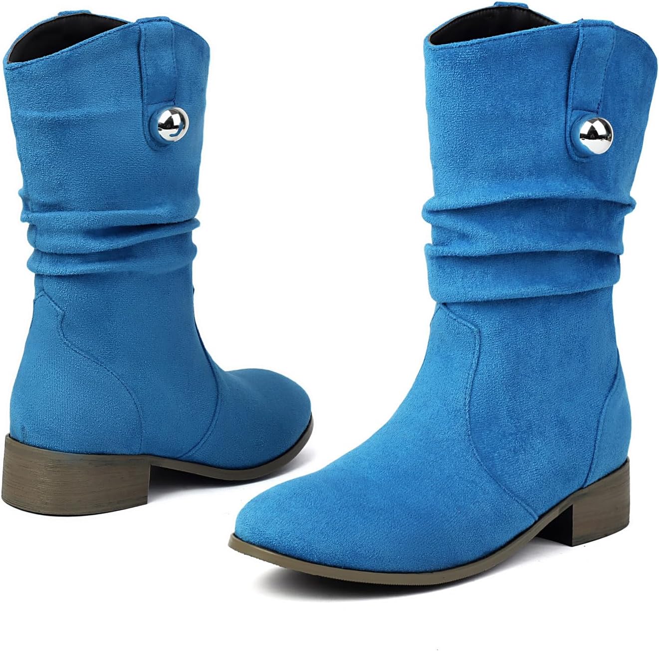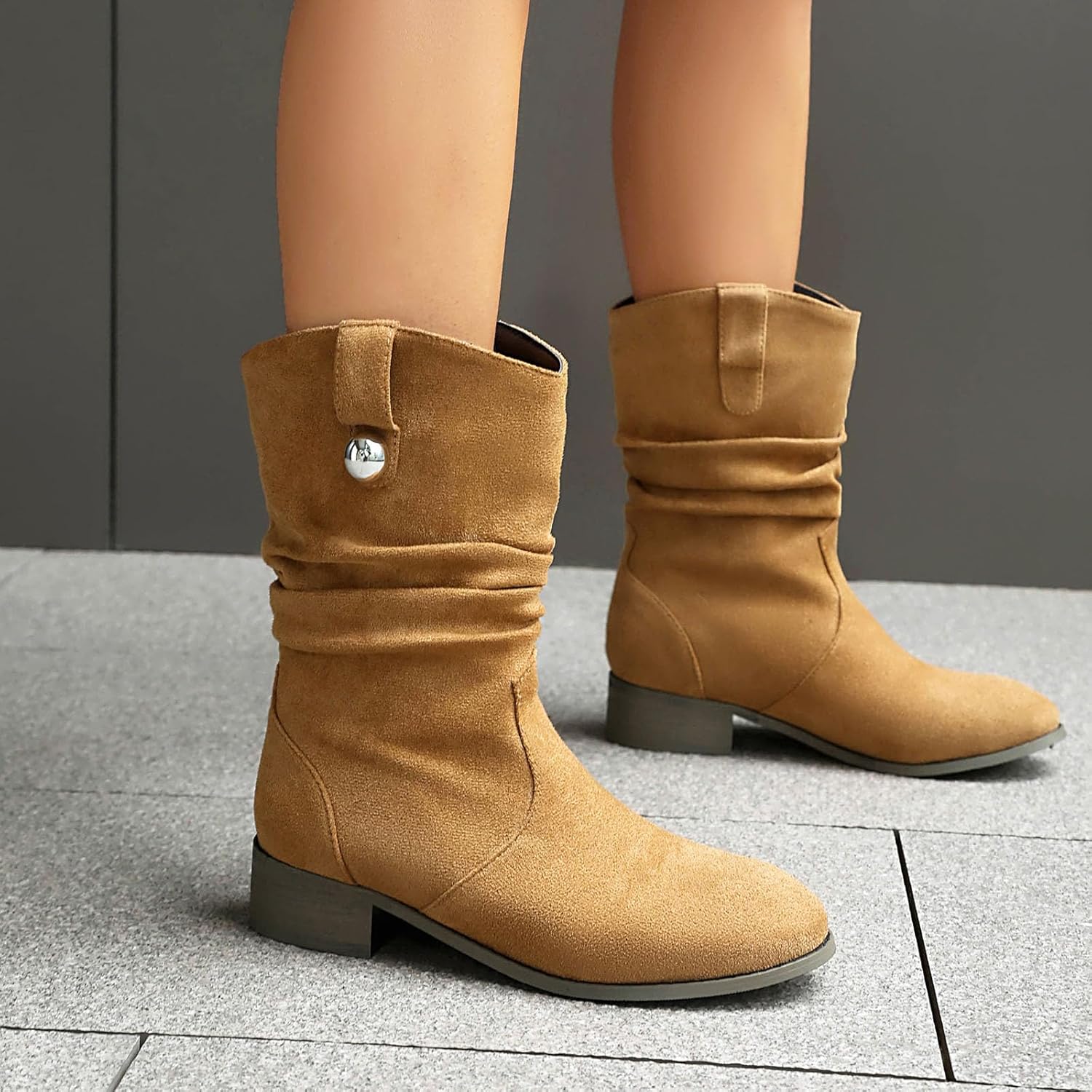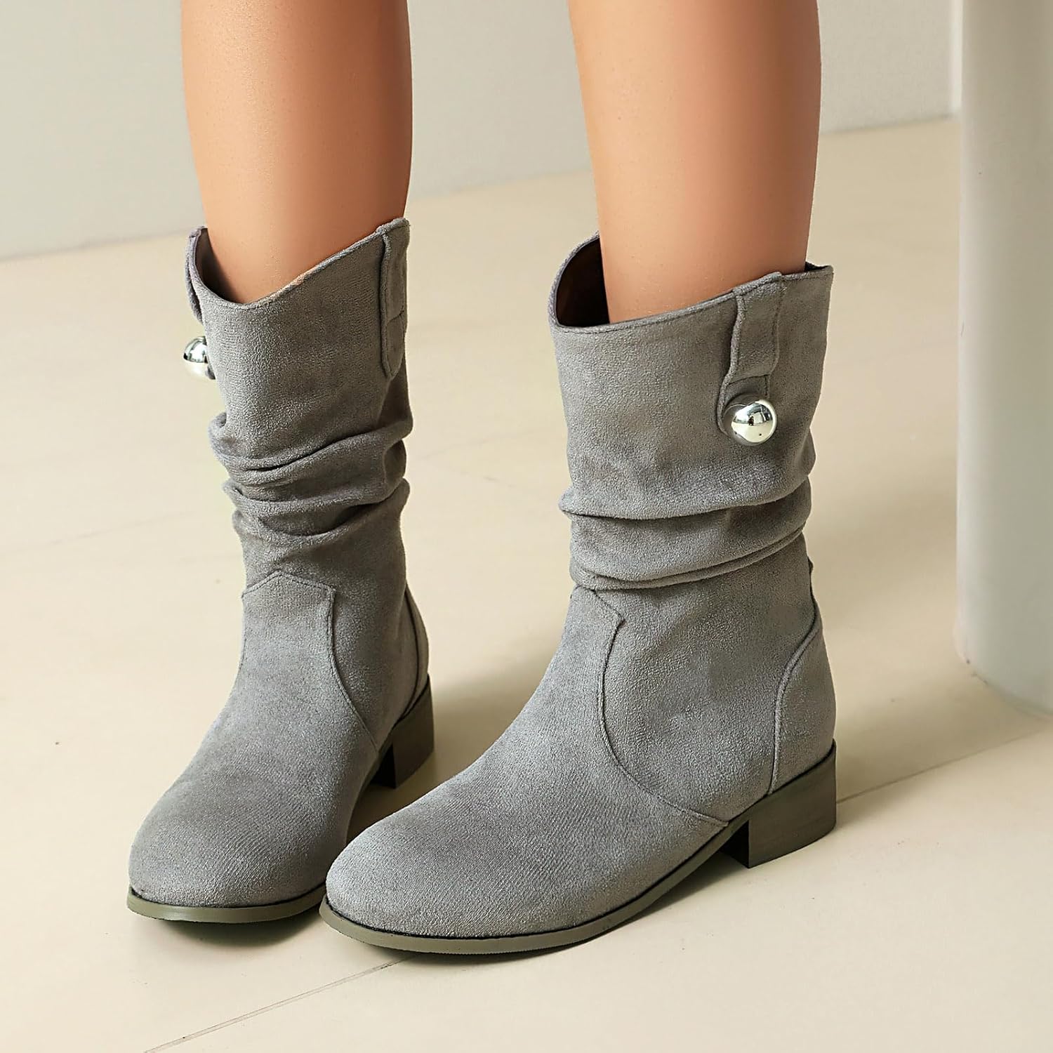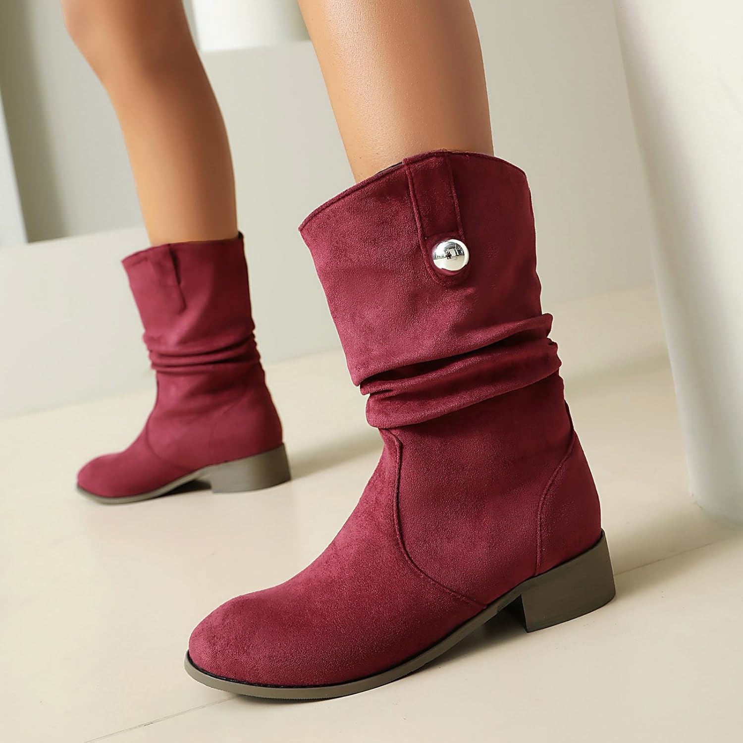 Crzidha Womens Western Suede Wide Width Boots Casual Round Toe Solid Color Pull on Shoes Fashion Slouchy Pleated Tall Shoes with Chunky Low Heel Fall Comfortable Lightweight Mid-Calf Short Booties