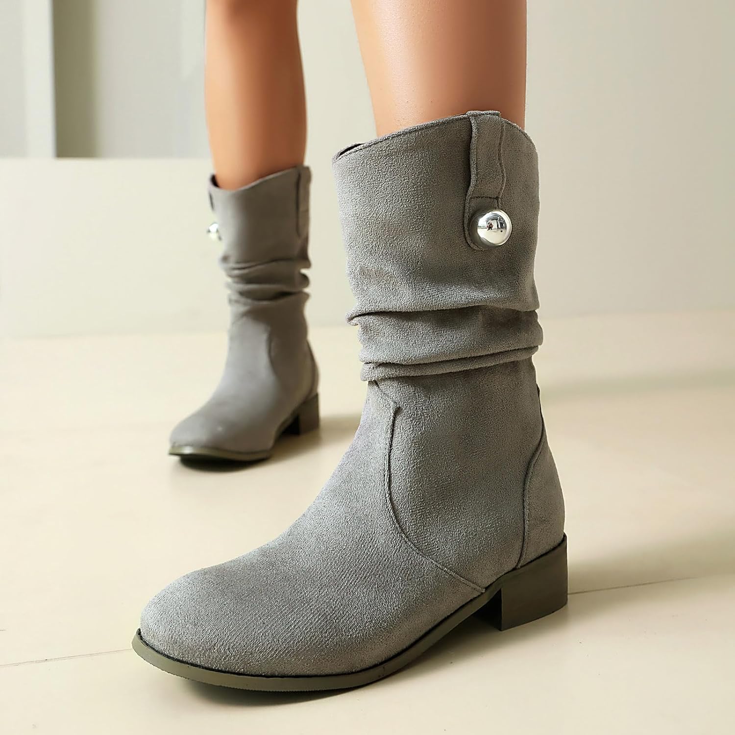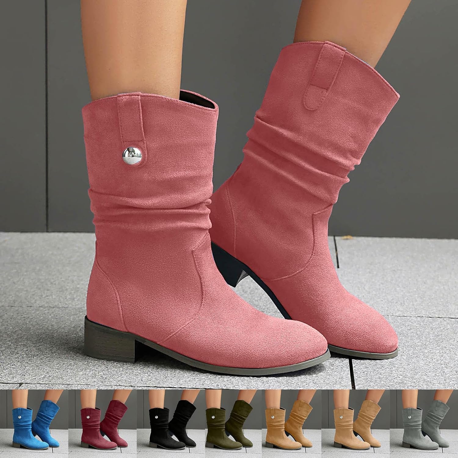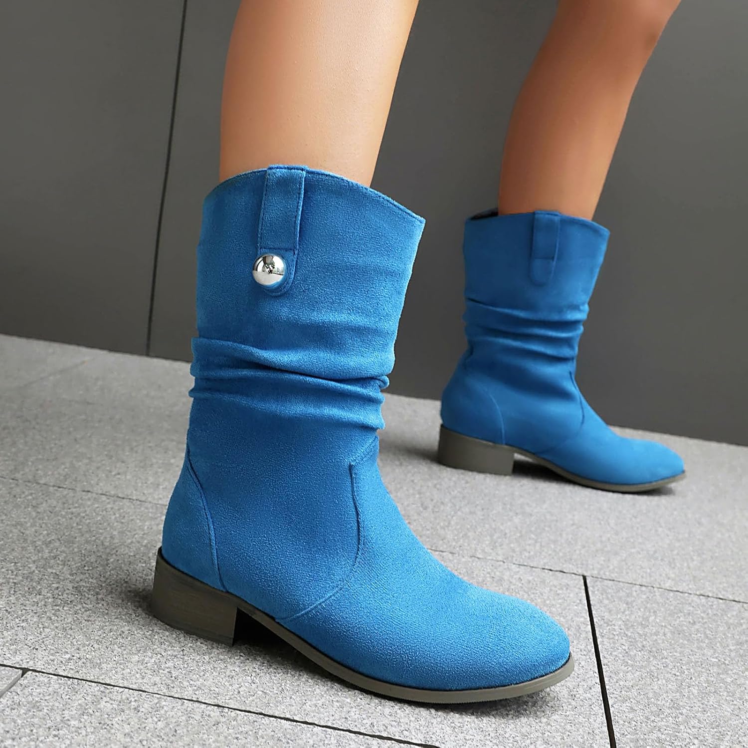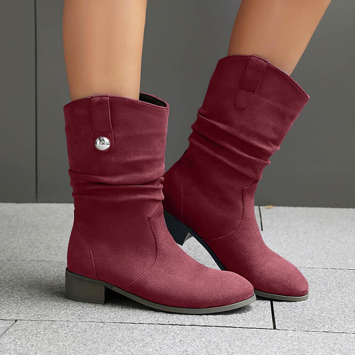 Crzidha Womens Western Suede Wide Width Boots Casual Round Toe Solid Color Pull on Shoes Fashion Slouchy Pleated Tall Shoes with Chunky Low Heel Fall Comfortable Lightweight Mid-Calf Short Booties