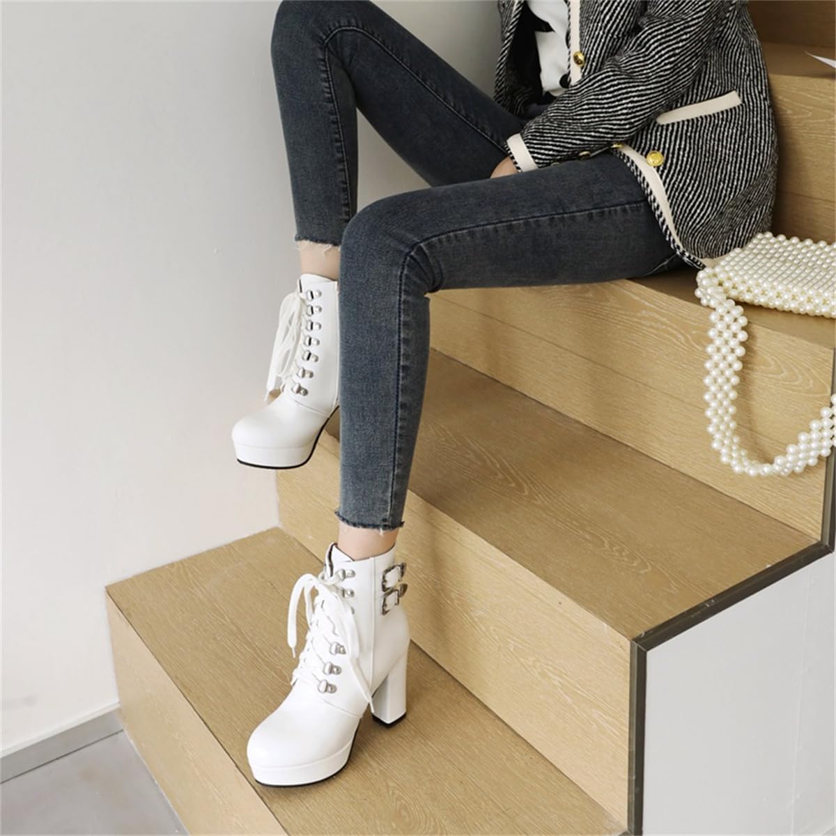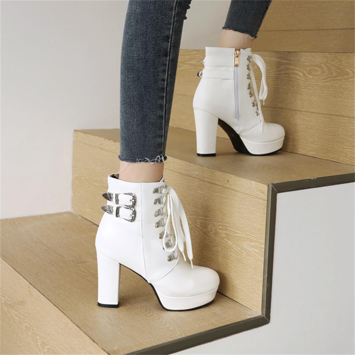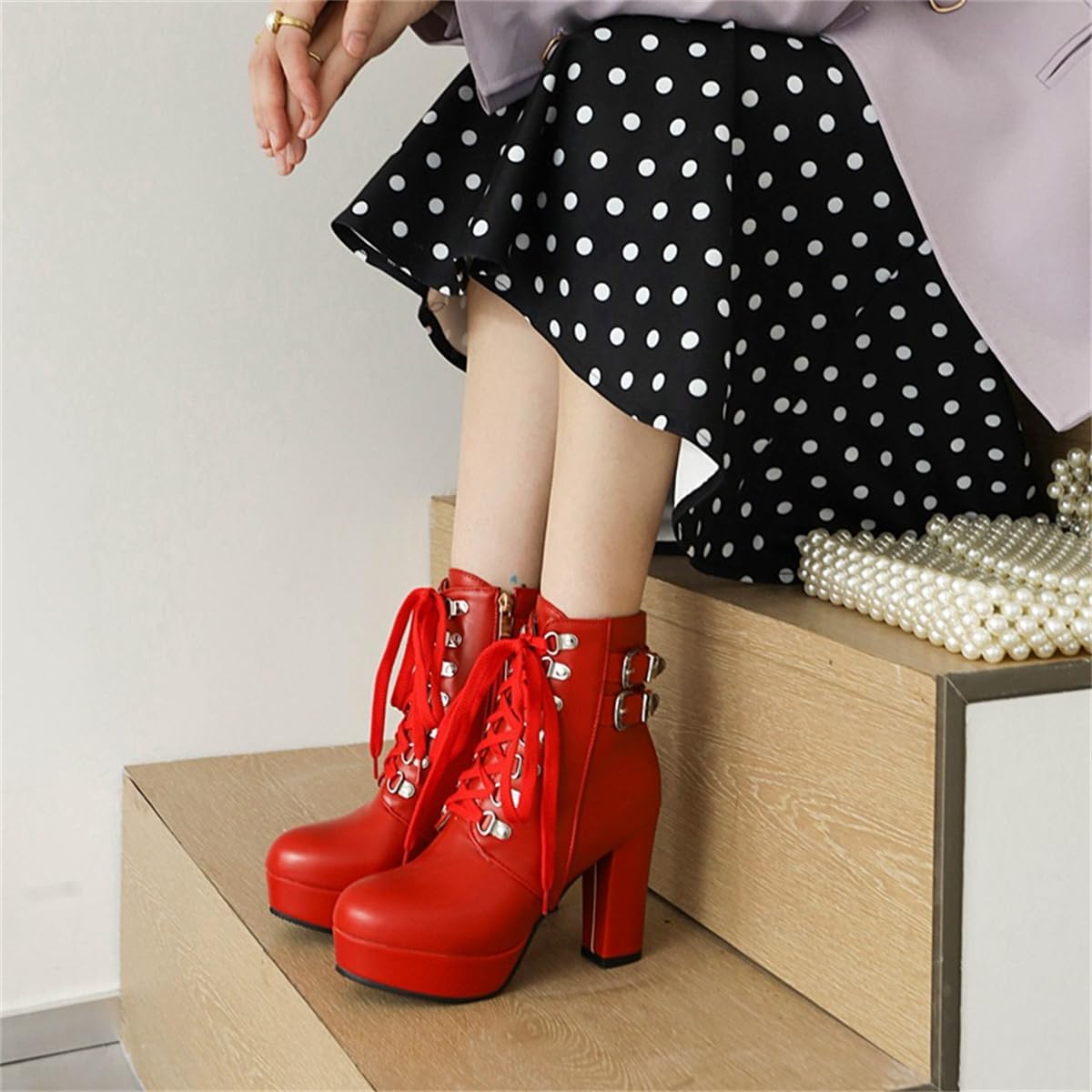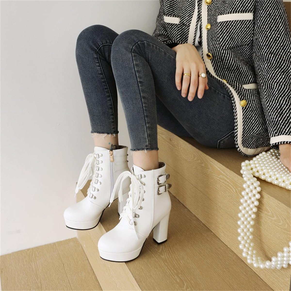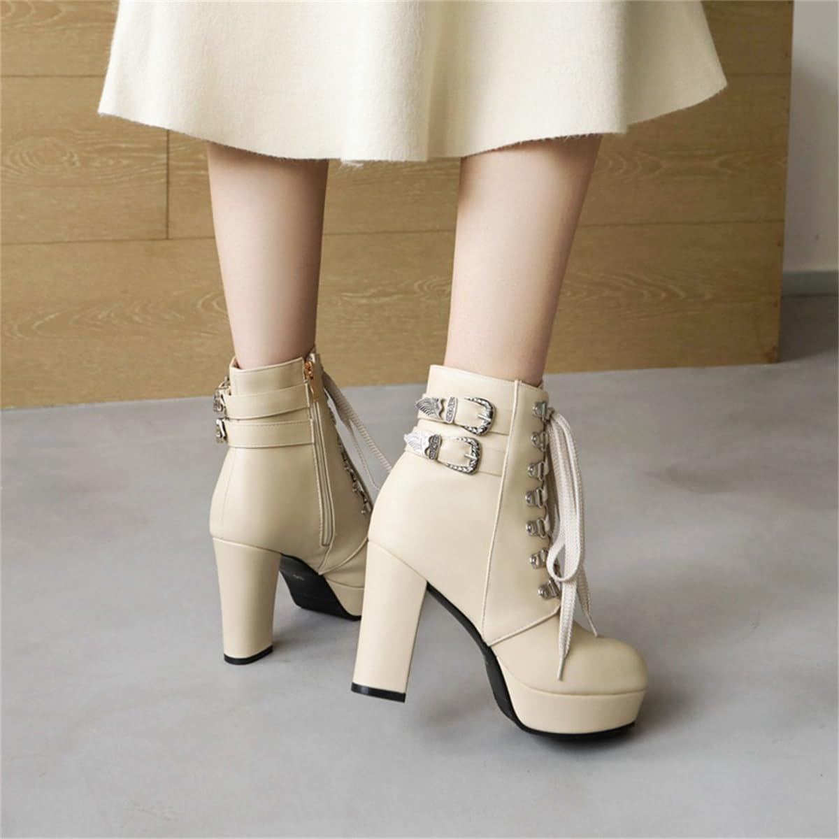 Inornever Lace Up Chunky Heel Ankle Boots for Women Side Zipper Closure Double Buckle Straps PU Leather Platform Womens Boots Beige White Red Pink Black Shoes