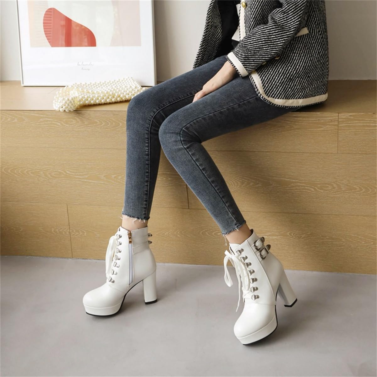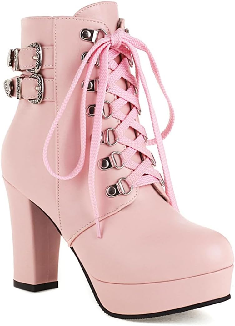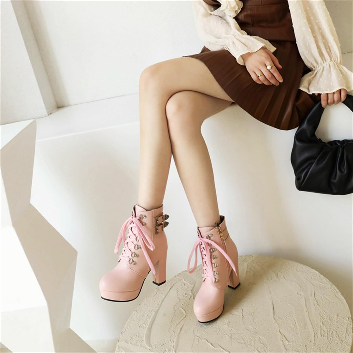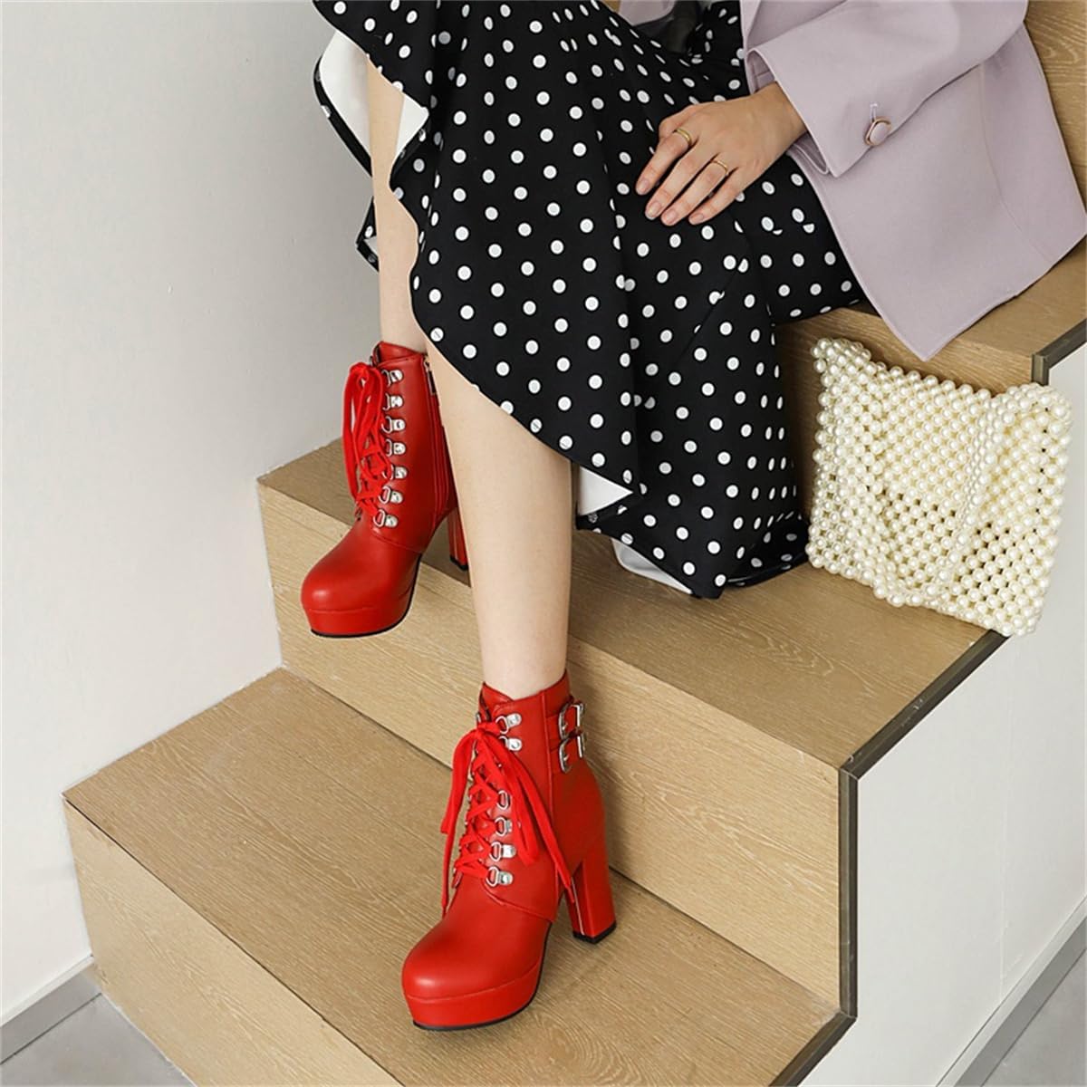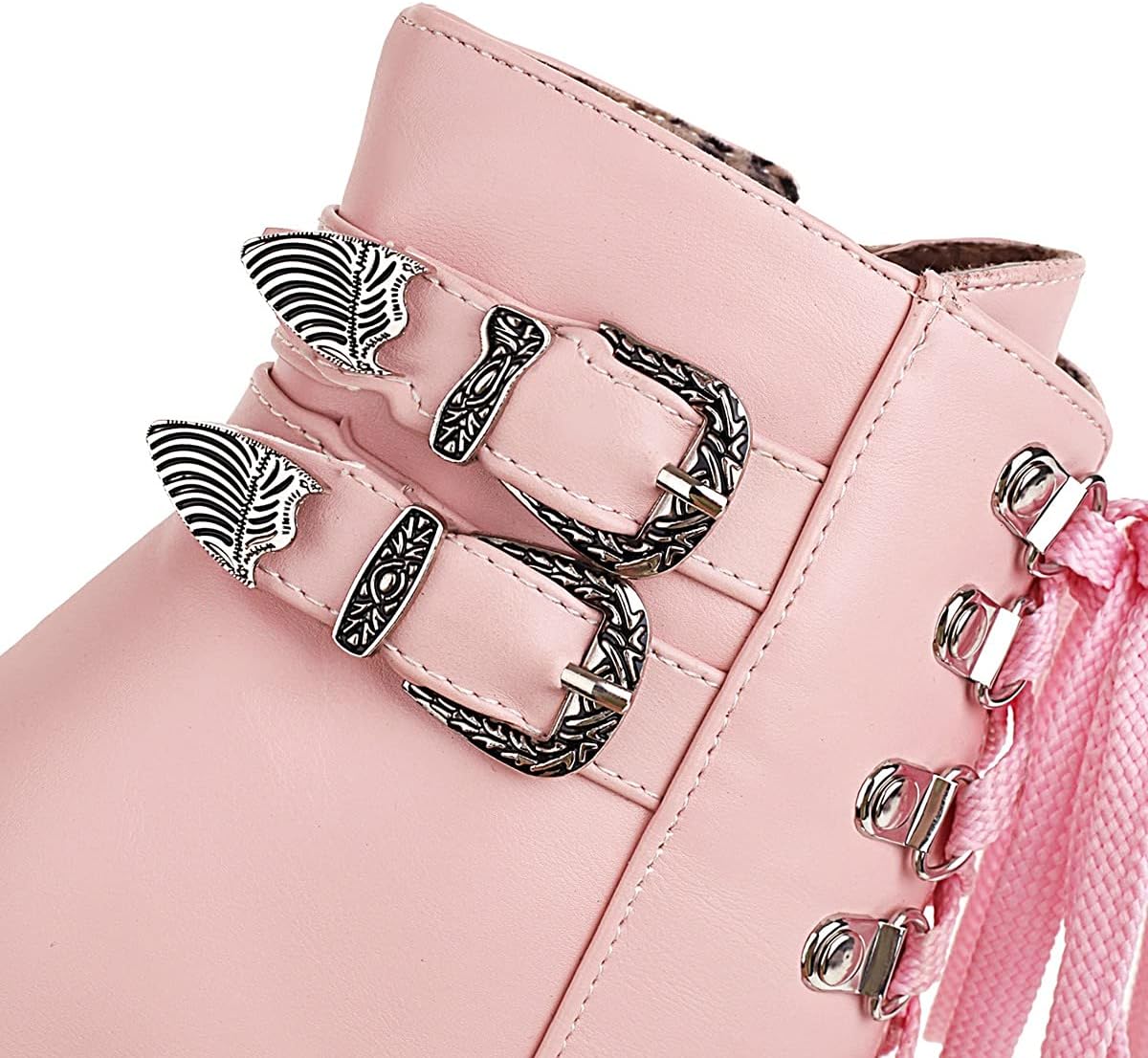 Inornever Lace Up Chunky Heel Ankle Boots for Women Side Zipper Closure Double Buckle Straps PU Leather Platform Womens Boots Beige White Red Pink Black Shoes