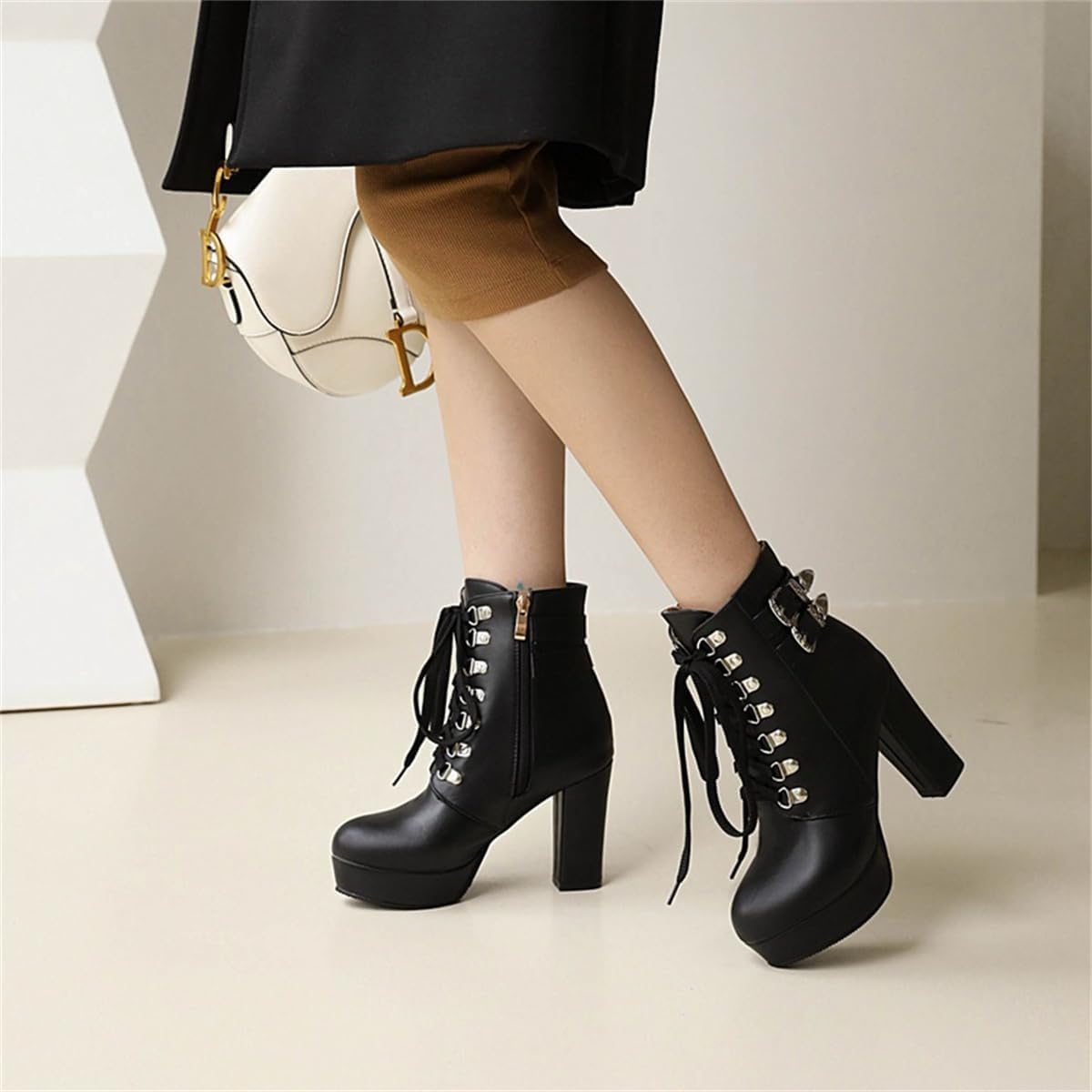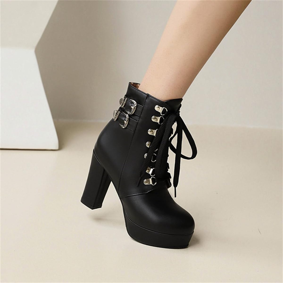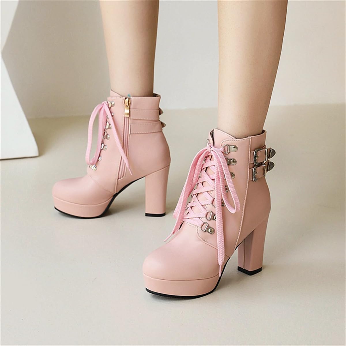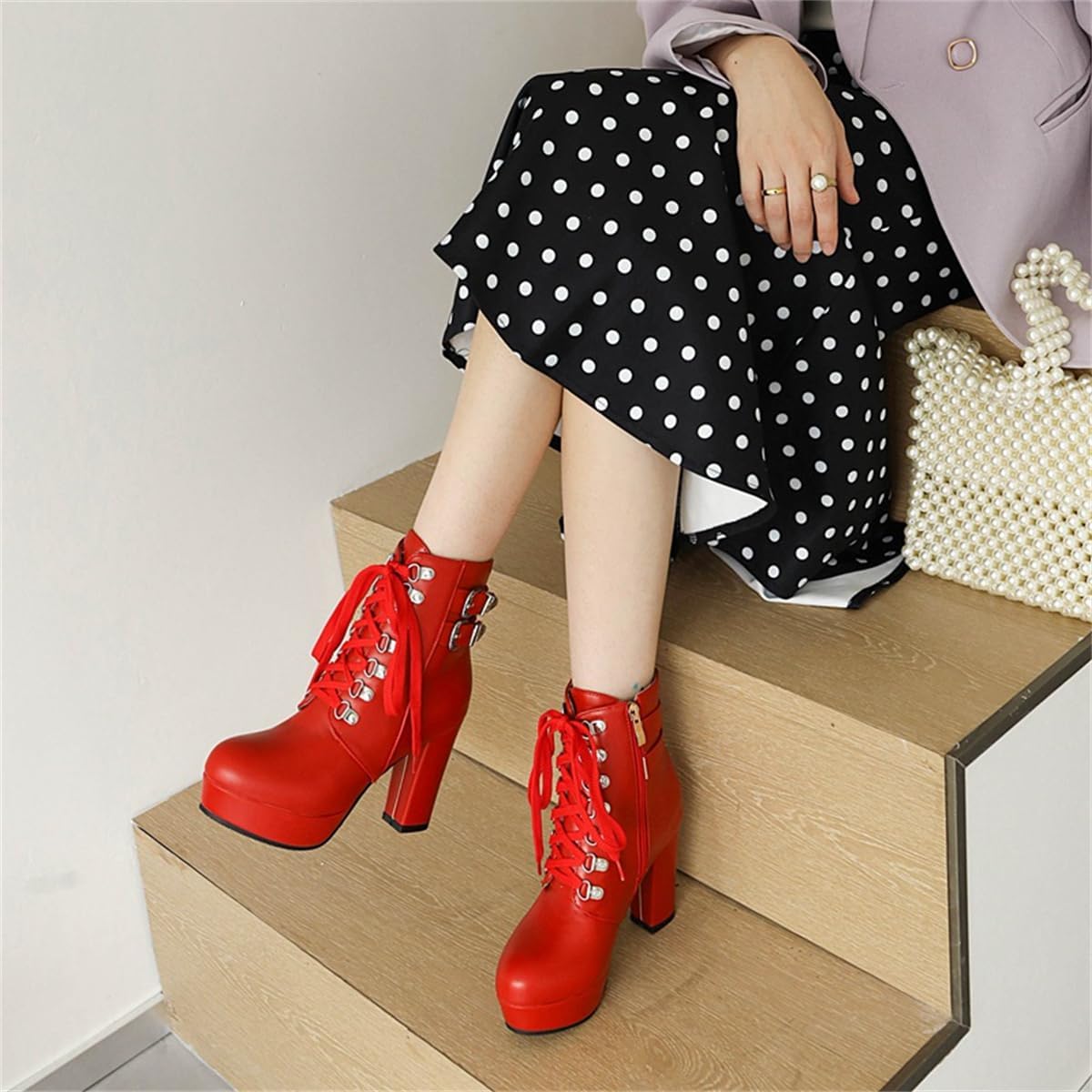 Inornever Lace Up Chunky Heel Ankle Boots for Women Side Zipper Closure Double Buckle Straps PU Leather Platform Womens Boots Beige White Red Pink Black Shoes