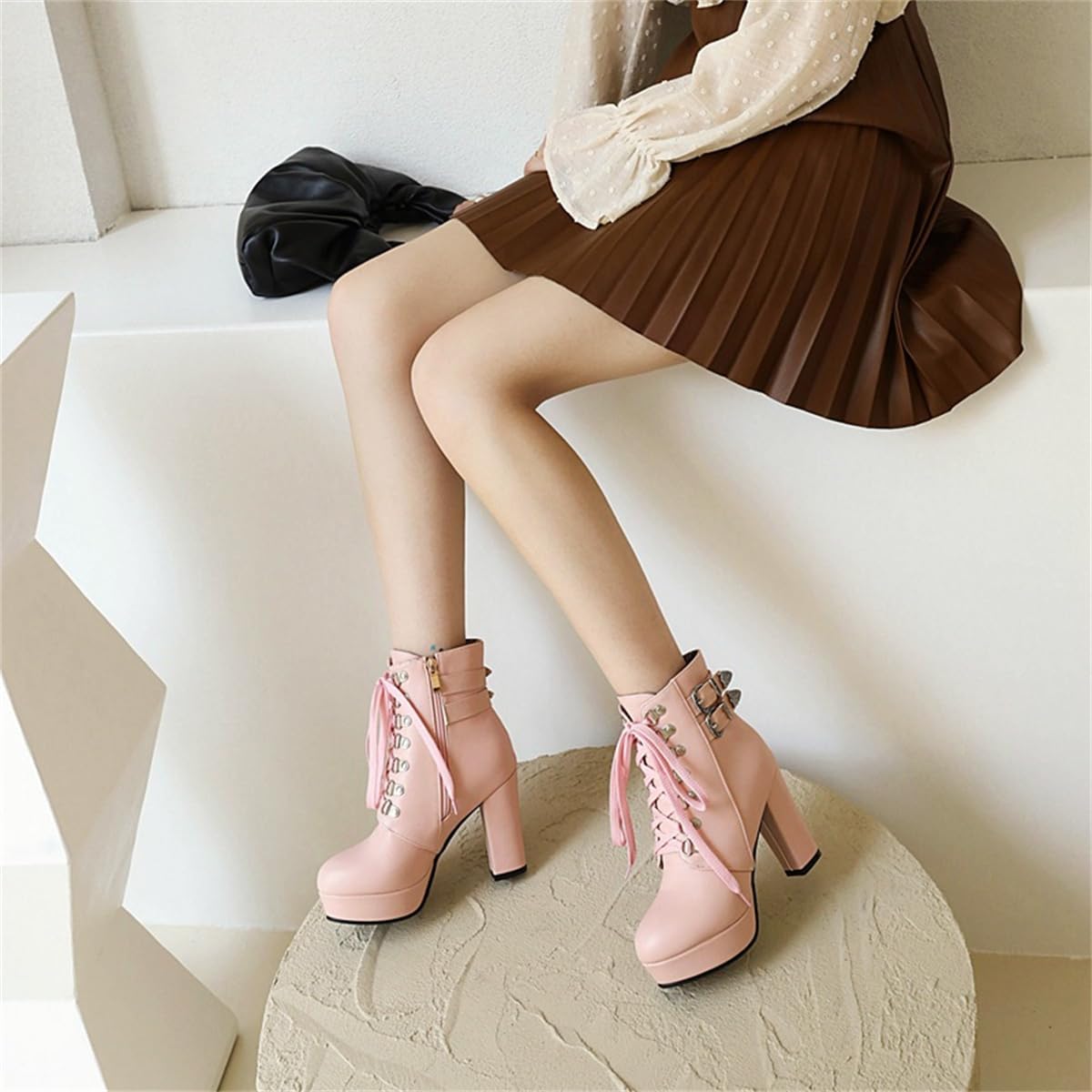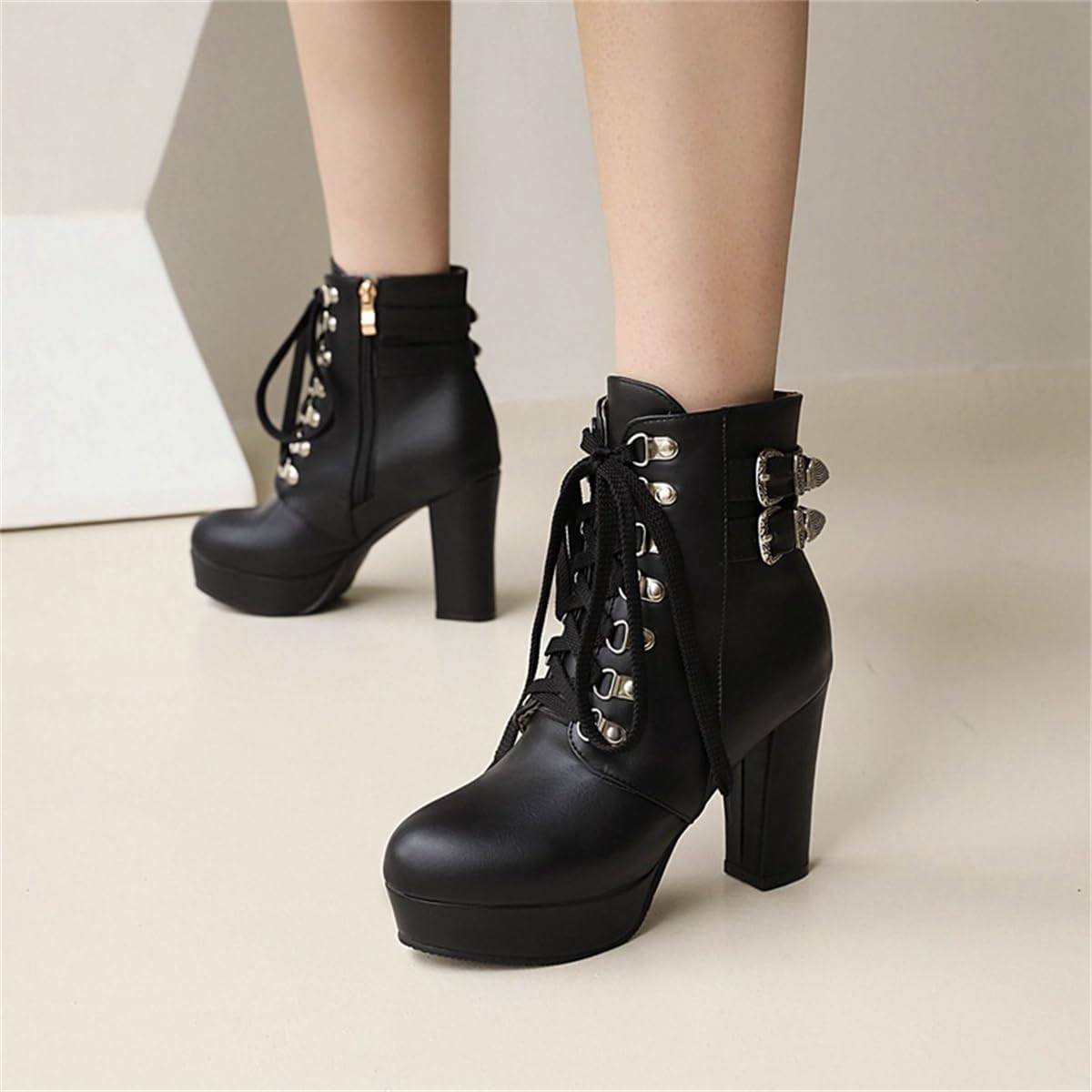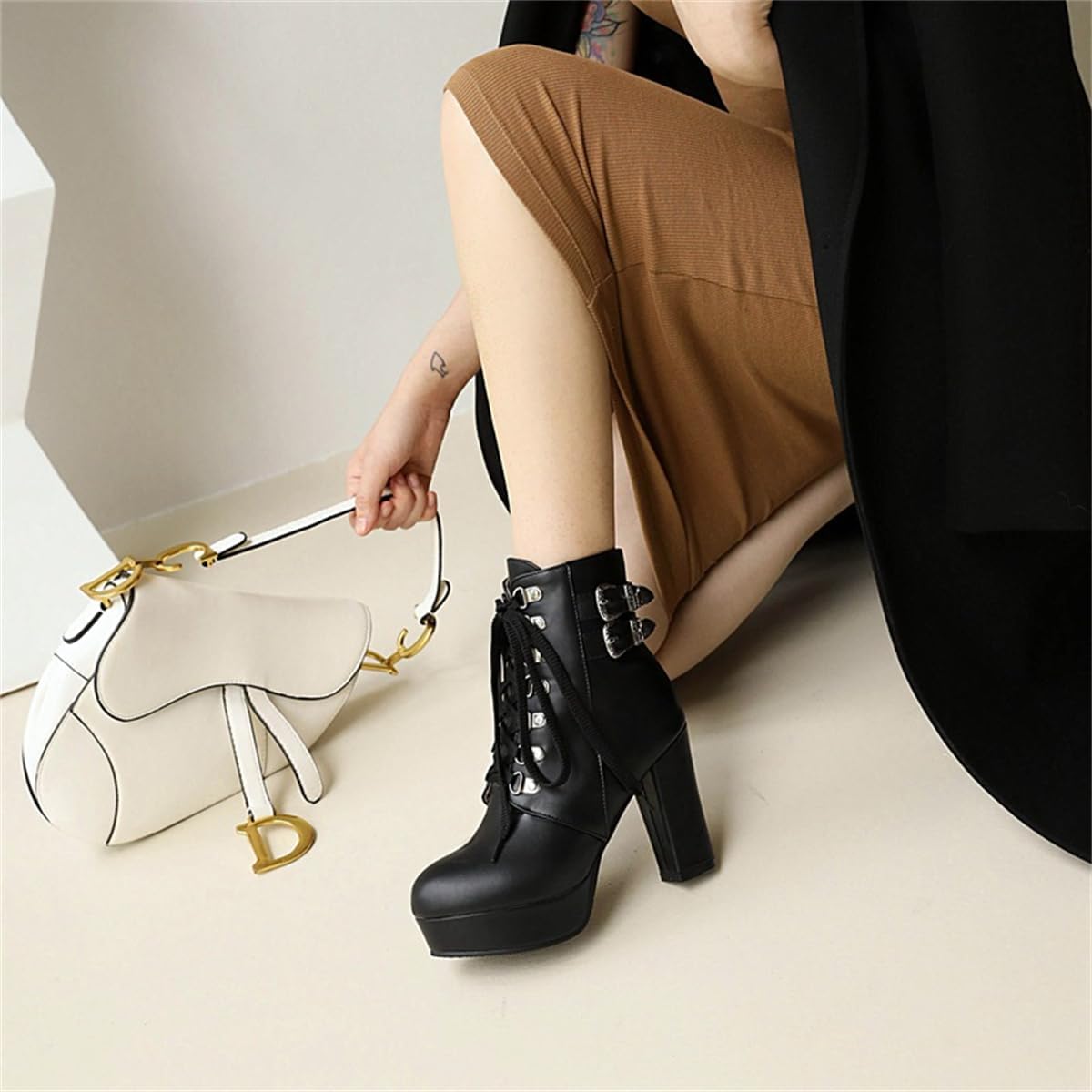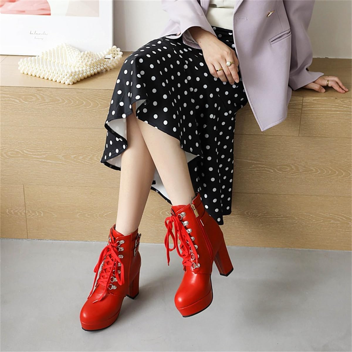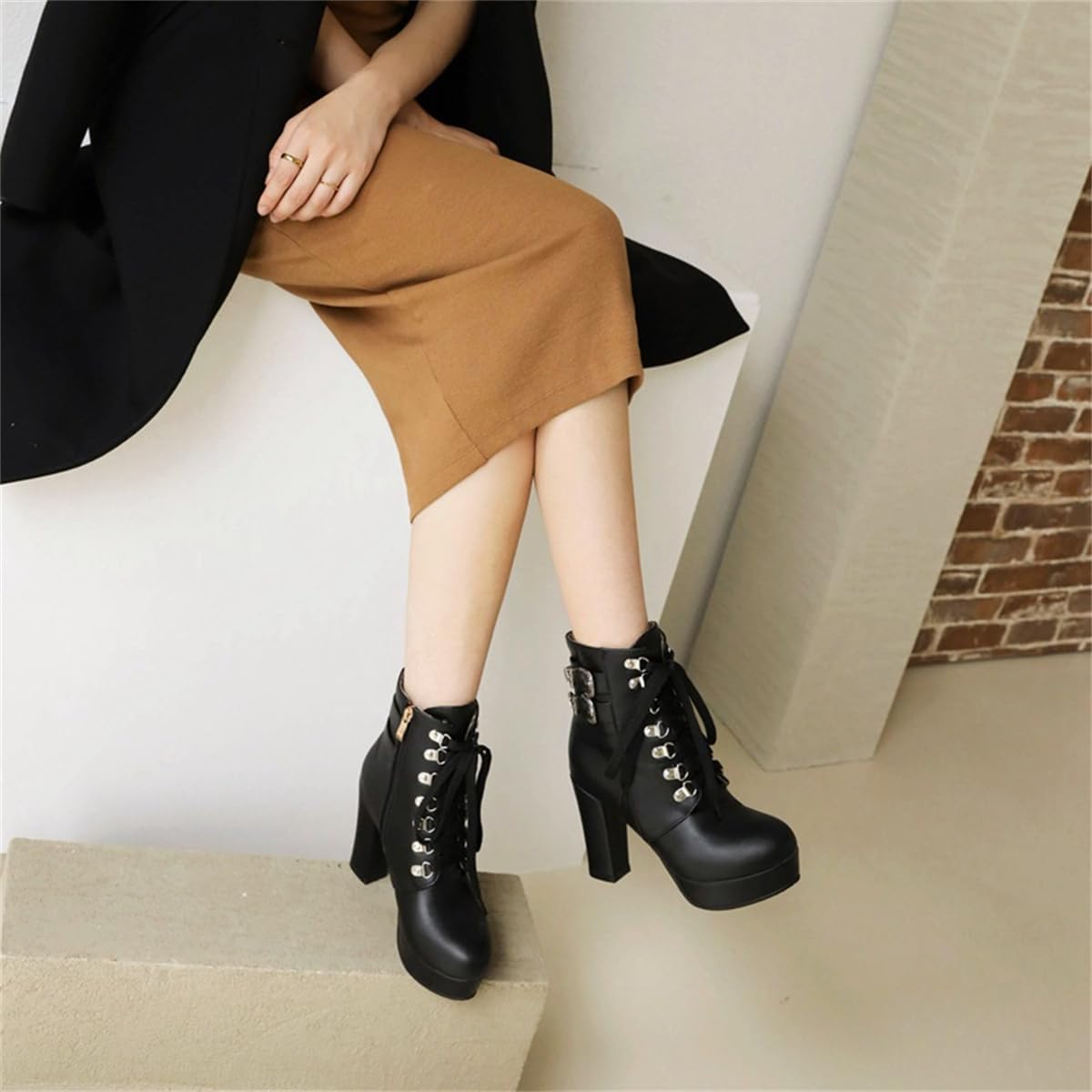 Inornever Lace Up Chunky Heel Ankle Boots for Women Side Zipper Closure Double Buckle Straps PU Leather Platform Womens Boots Beige White Red Pink Black Shoes