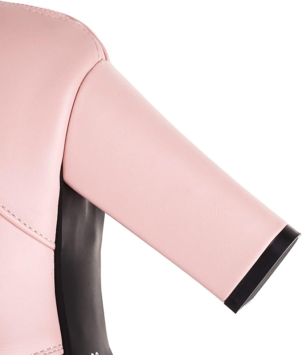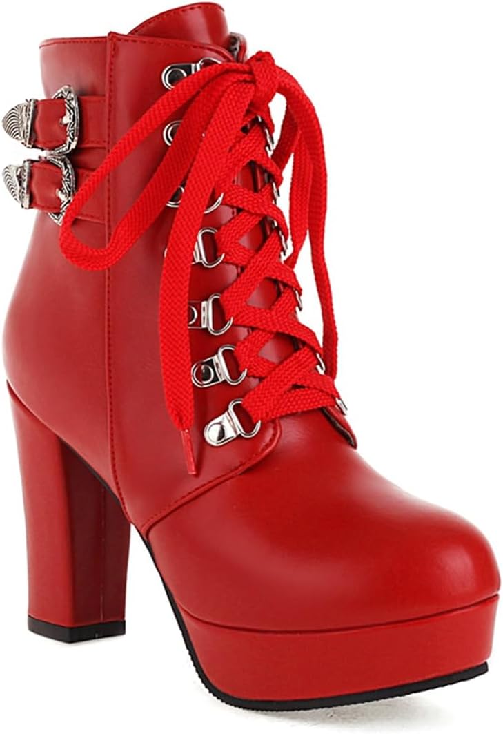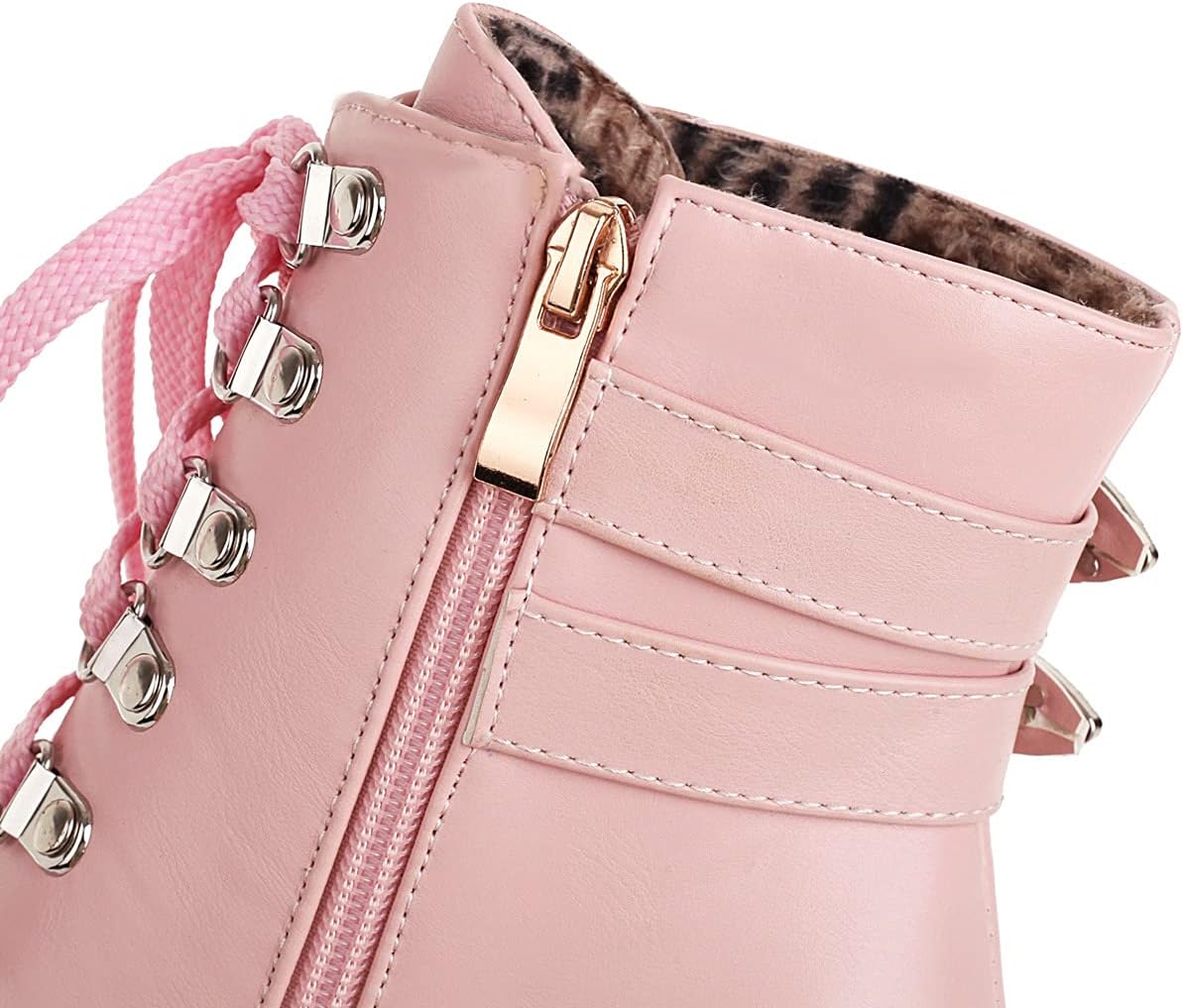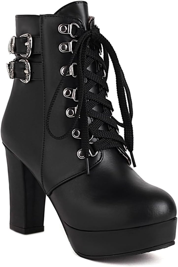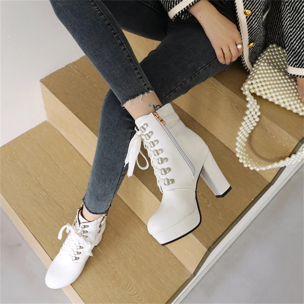 Inornever Lace Up Chunky Heel Ankle Boots for Women Side Zipper Closure Double Buckle Straps PU Leather Platform Womens Boots Beige White Red Pink Black Shoes