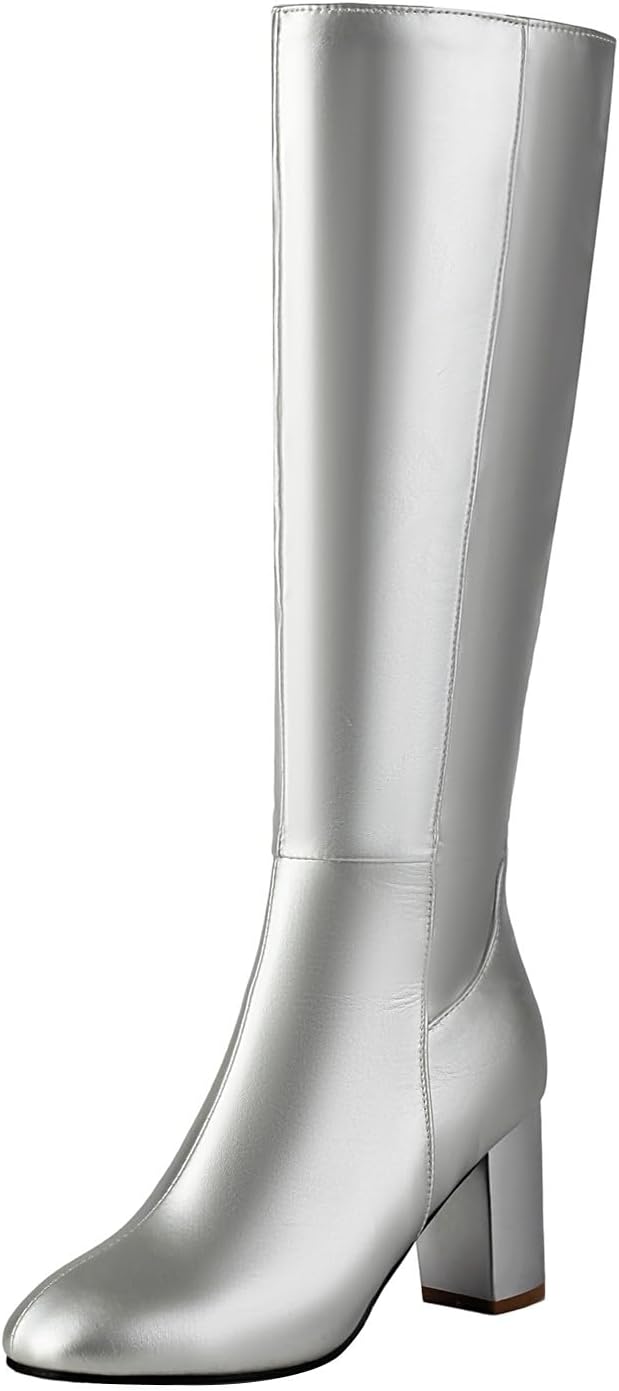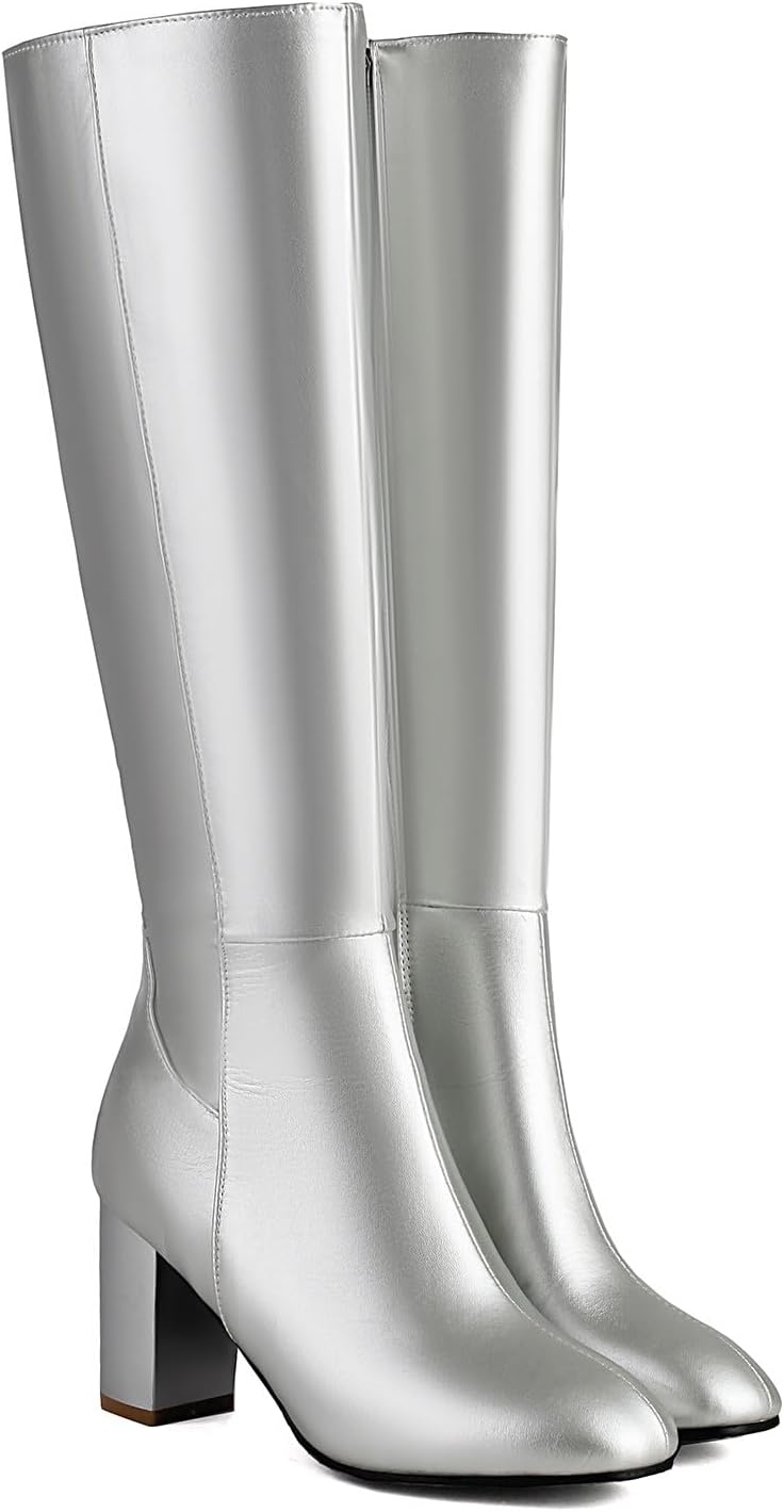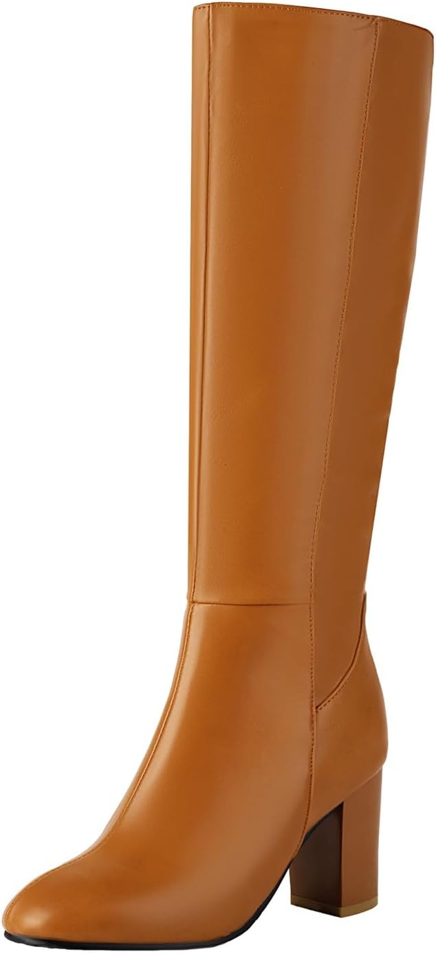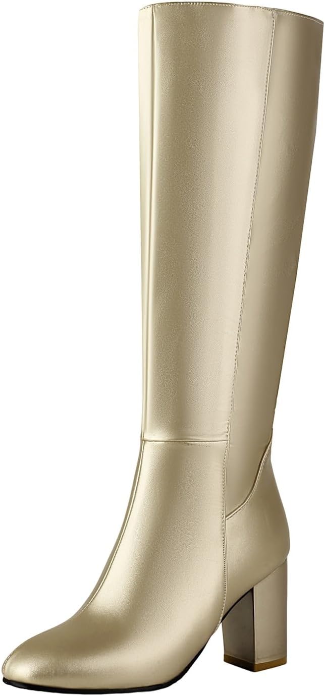 Platform Chunky High Heel Knee High Boots for Women Comfy Side Zipper Waterproof Pull on Long Boots Fashion Comfortable Almond Round Toe Solid Color Shoes Classic Motorcycle Knight Riding Tall Shoes
