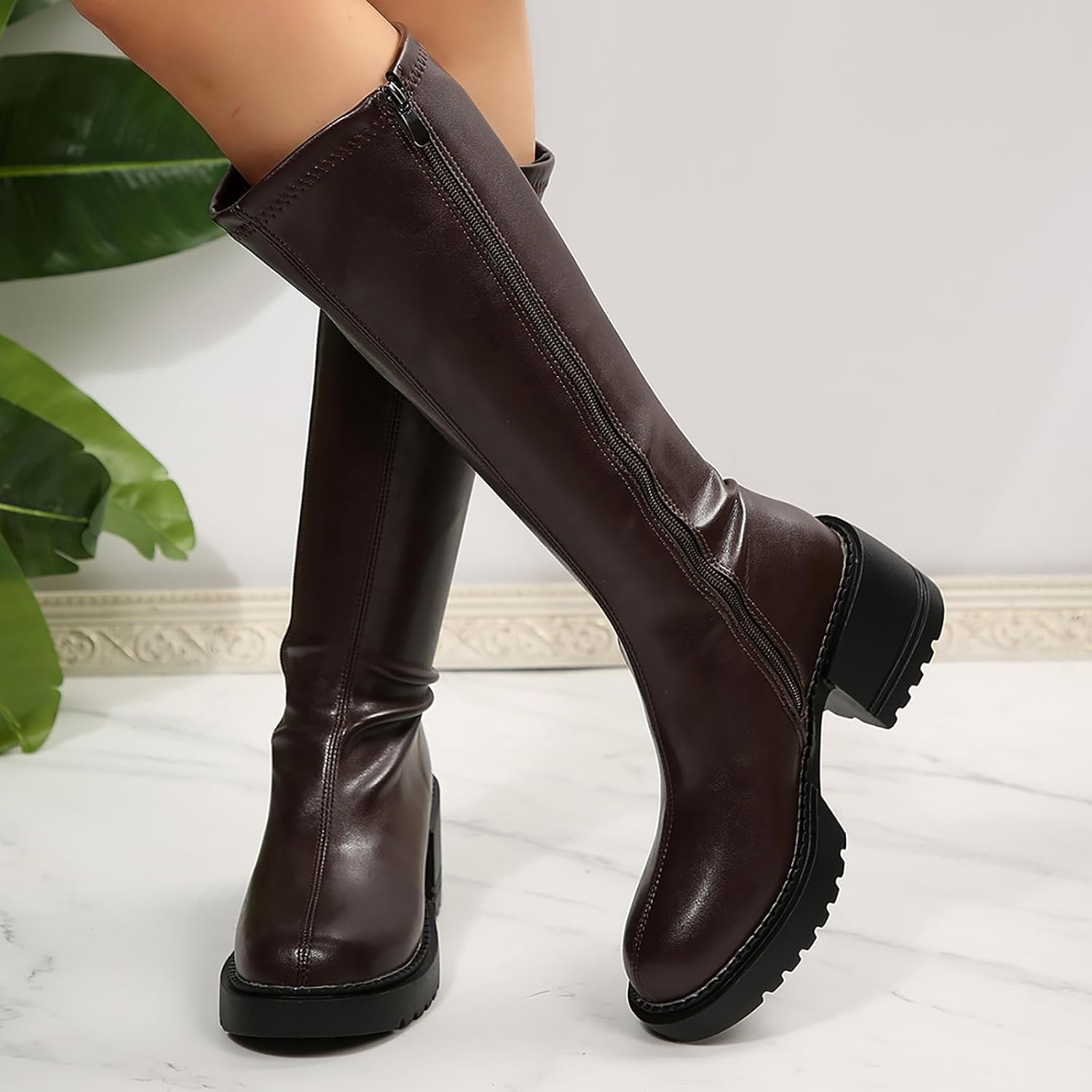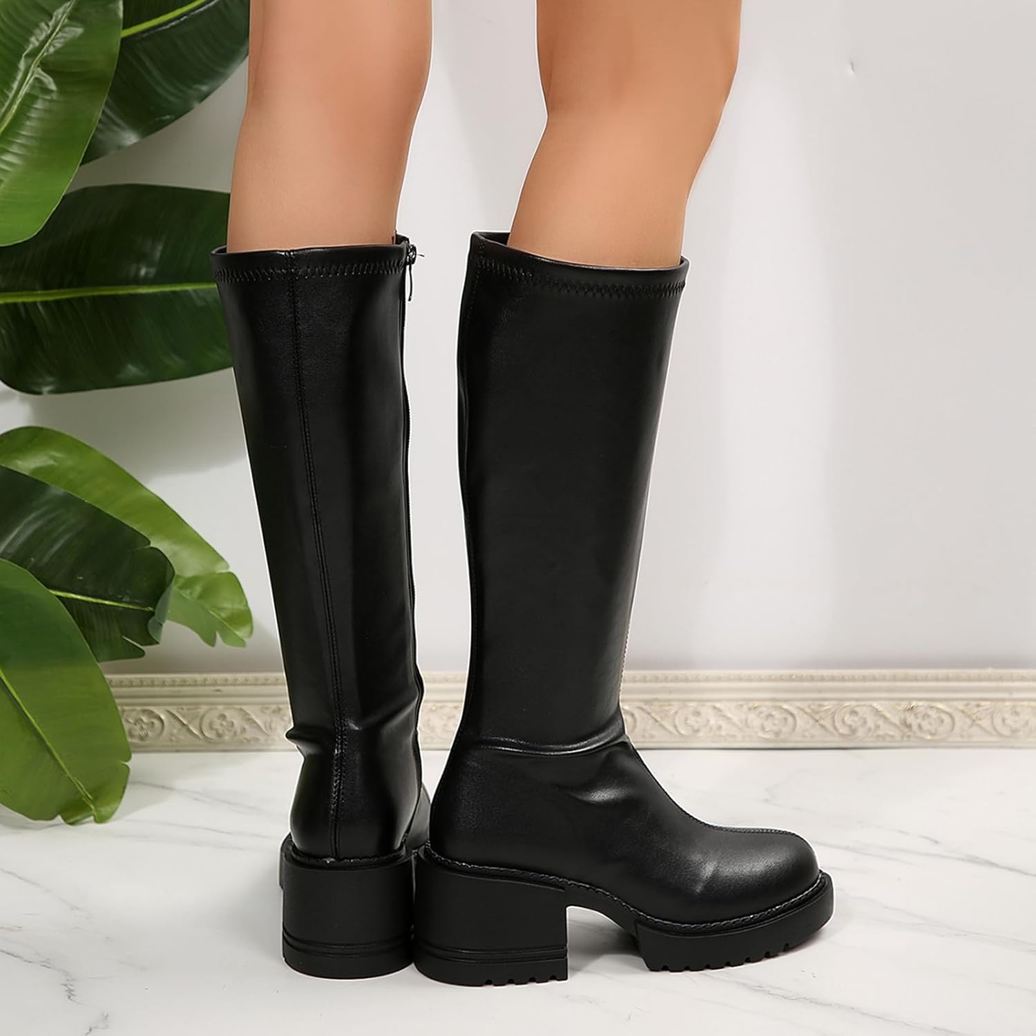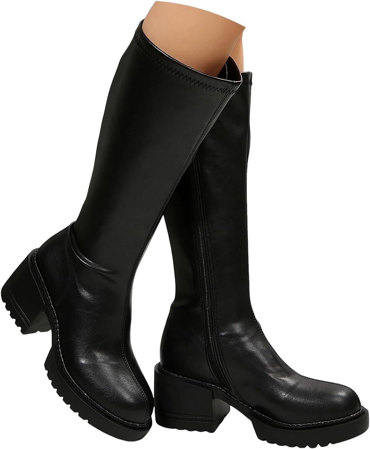 Women Platforms Knee High Boots Leather Chunky Block High Heel Round Toe Solid Color Side Zipper Lug Sole Booties Waterproof Breathable Motorcycle Combat Punk Riding Hiking Shoes