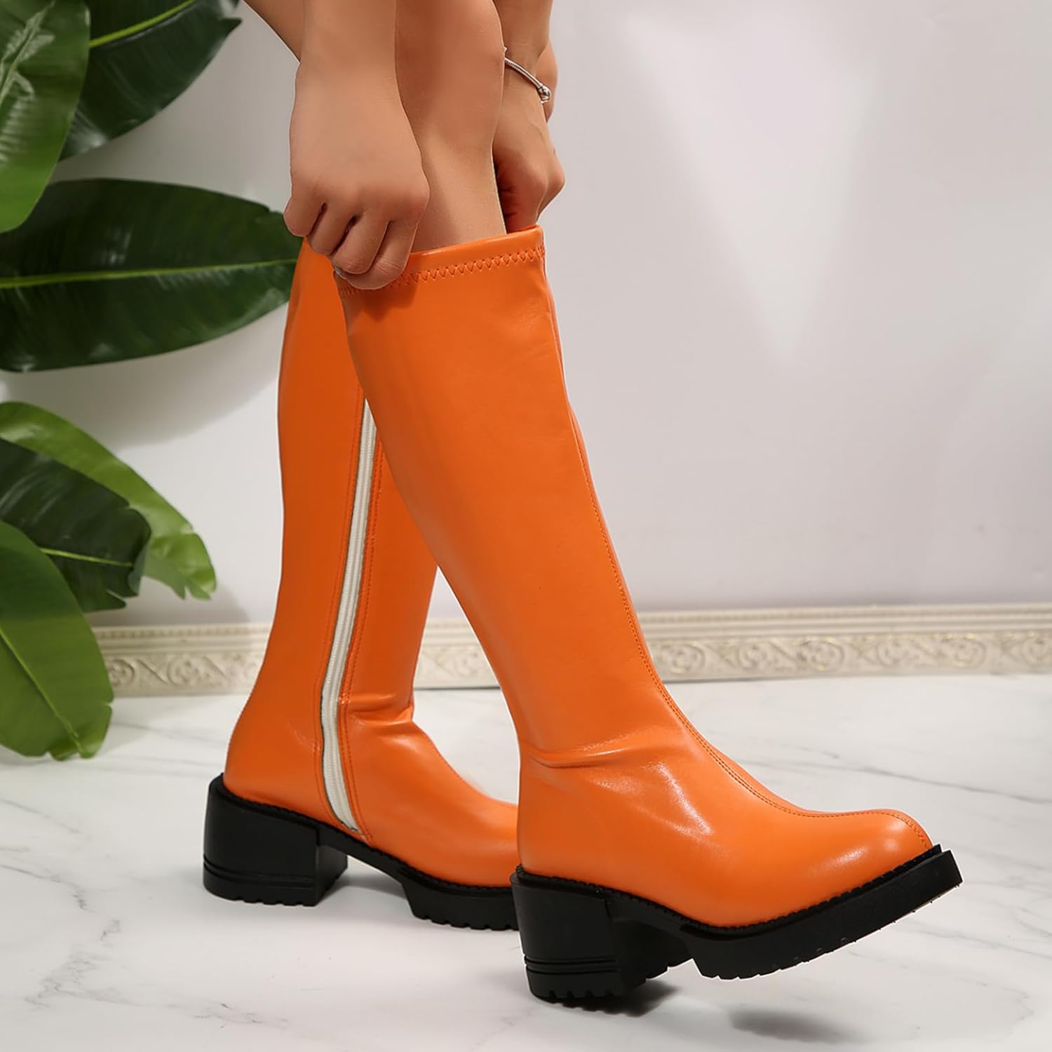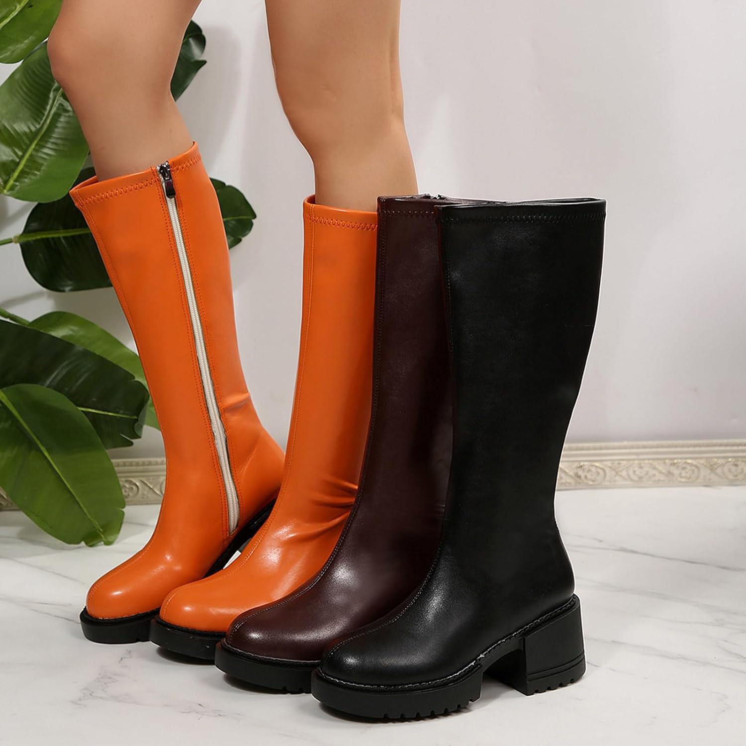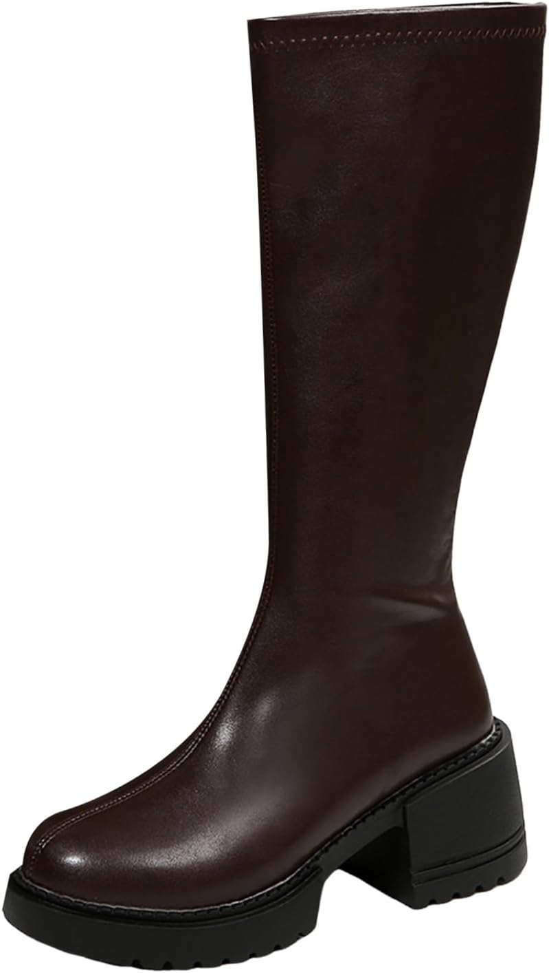 Women Platforms Knee High Boots Leather Chunky Block High Heel Round Toe Solid Color Side Zipper Lug Sole Booties Waterproof Breathable Motorcycle Combat Punk Riding Hiking Shoes