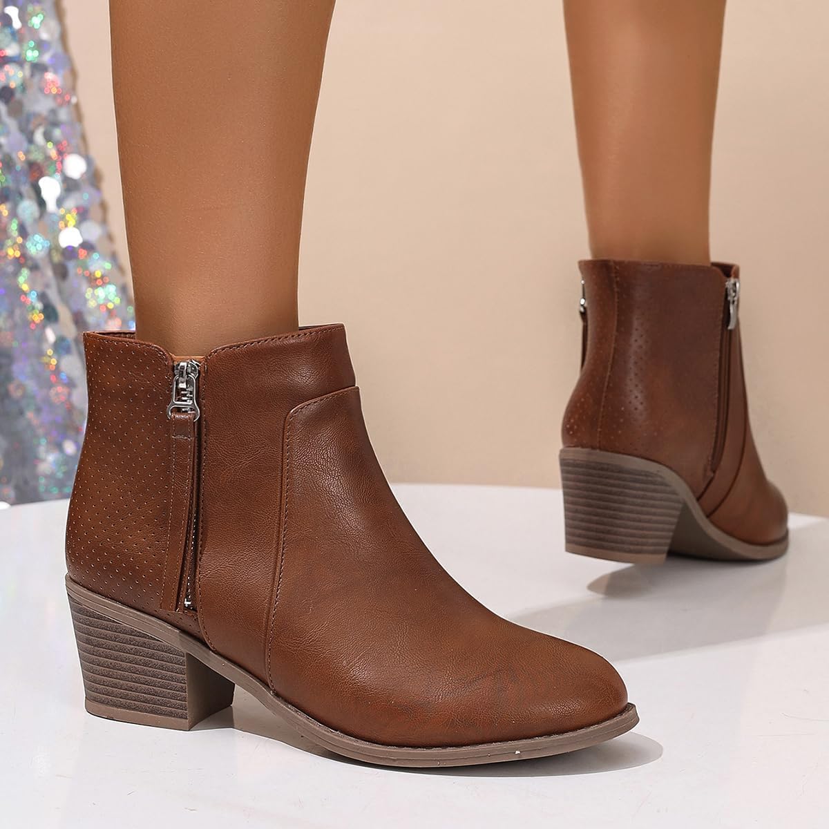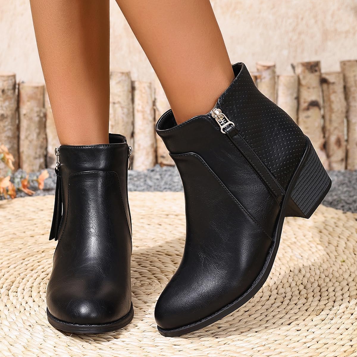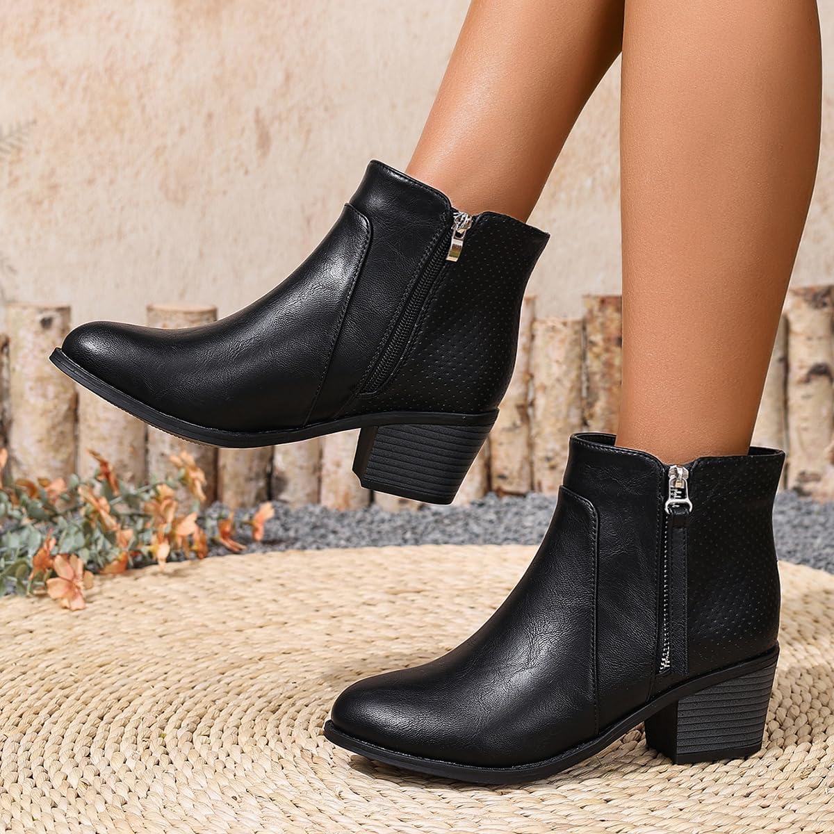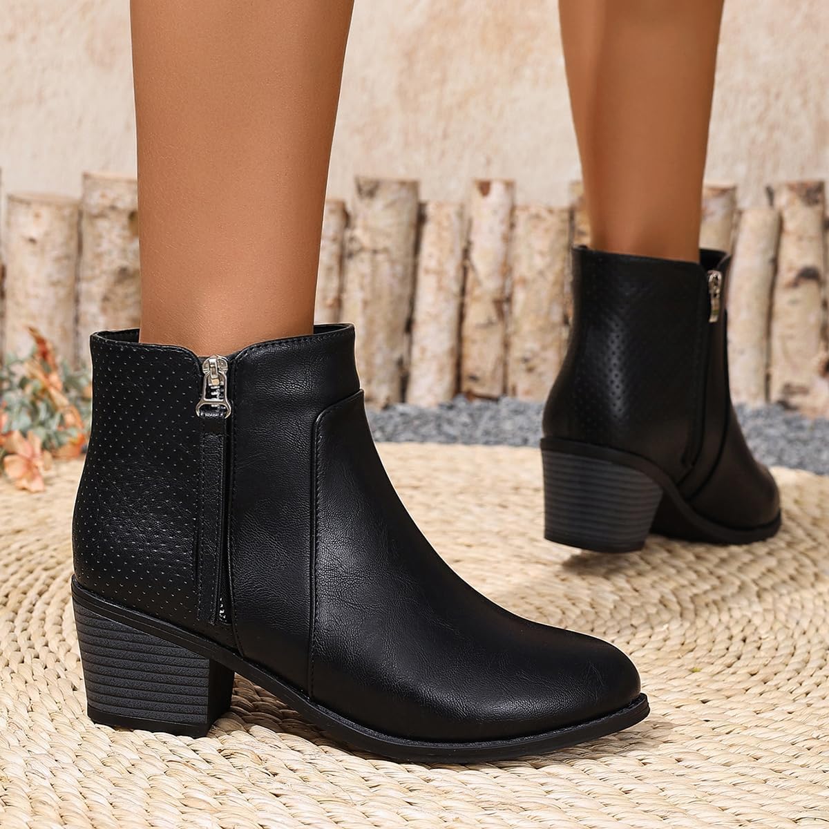 Women’s Black Faux Leather Mid-Calf Boots – Low Block Heel with Side Zipper & Perforated Detail, Round Toe Comfort Booties for Fall/Winter (9.7cm Shaft, 5.7cm Heel)