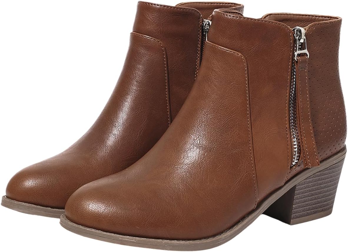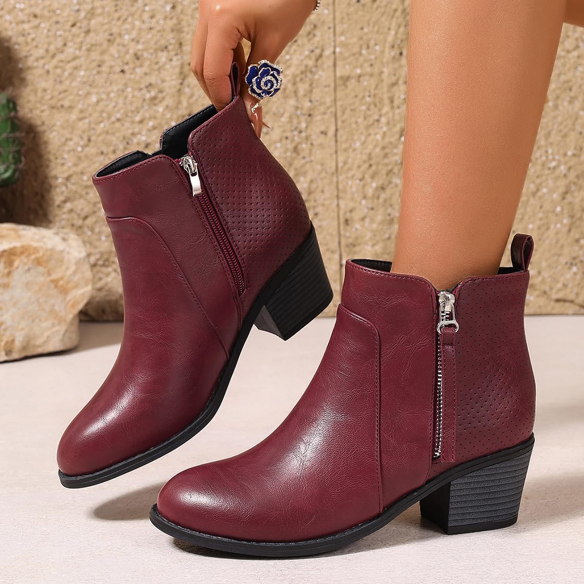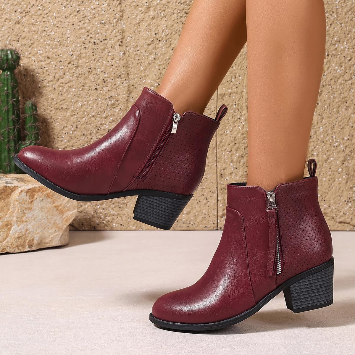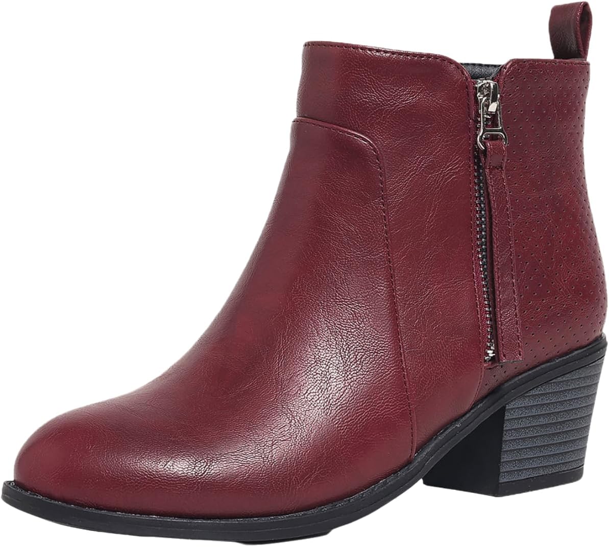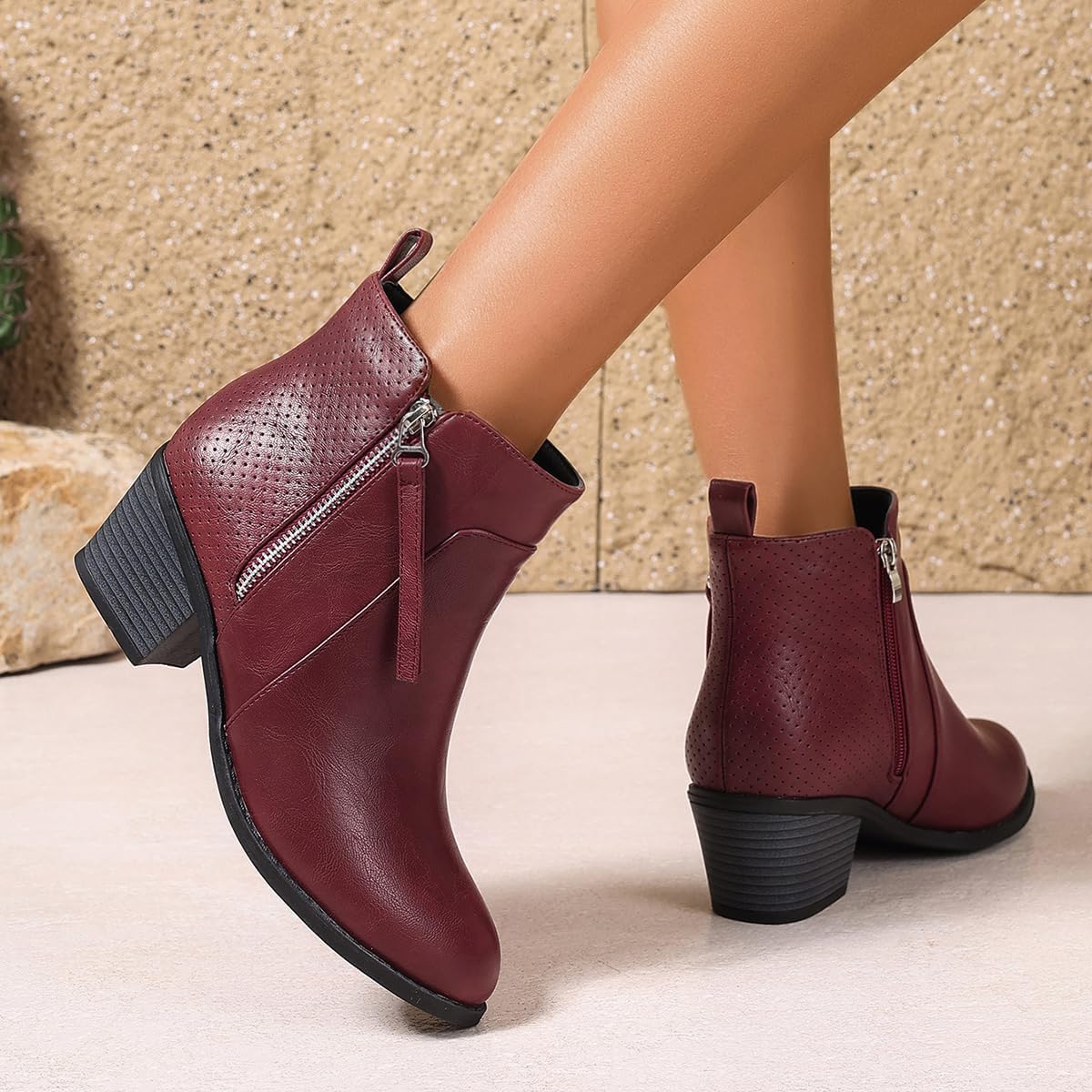 Women’s Black Faux Leather Mid-Calf Boots – Low Block Heel with Side Zipper & Perforated Detail, Round Toe Comfort Booties for Fall/Winter (9.7cm Shaft, 5.7cm Heel)