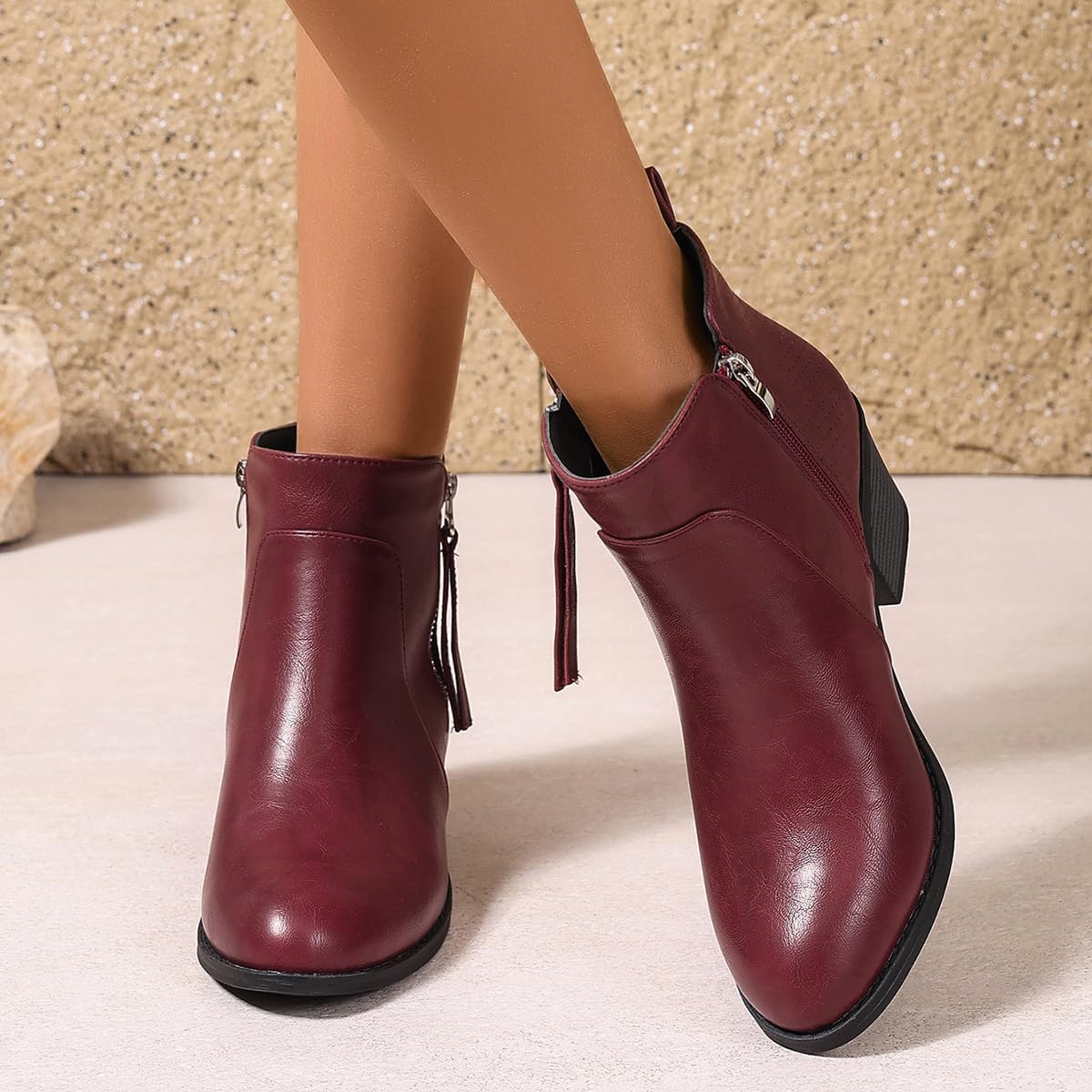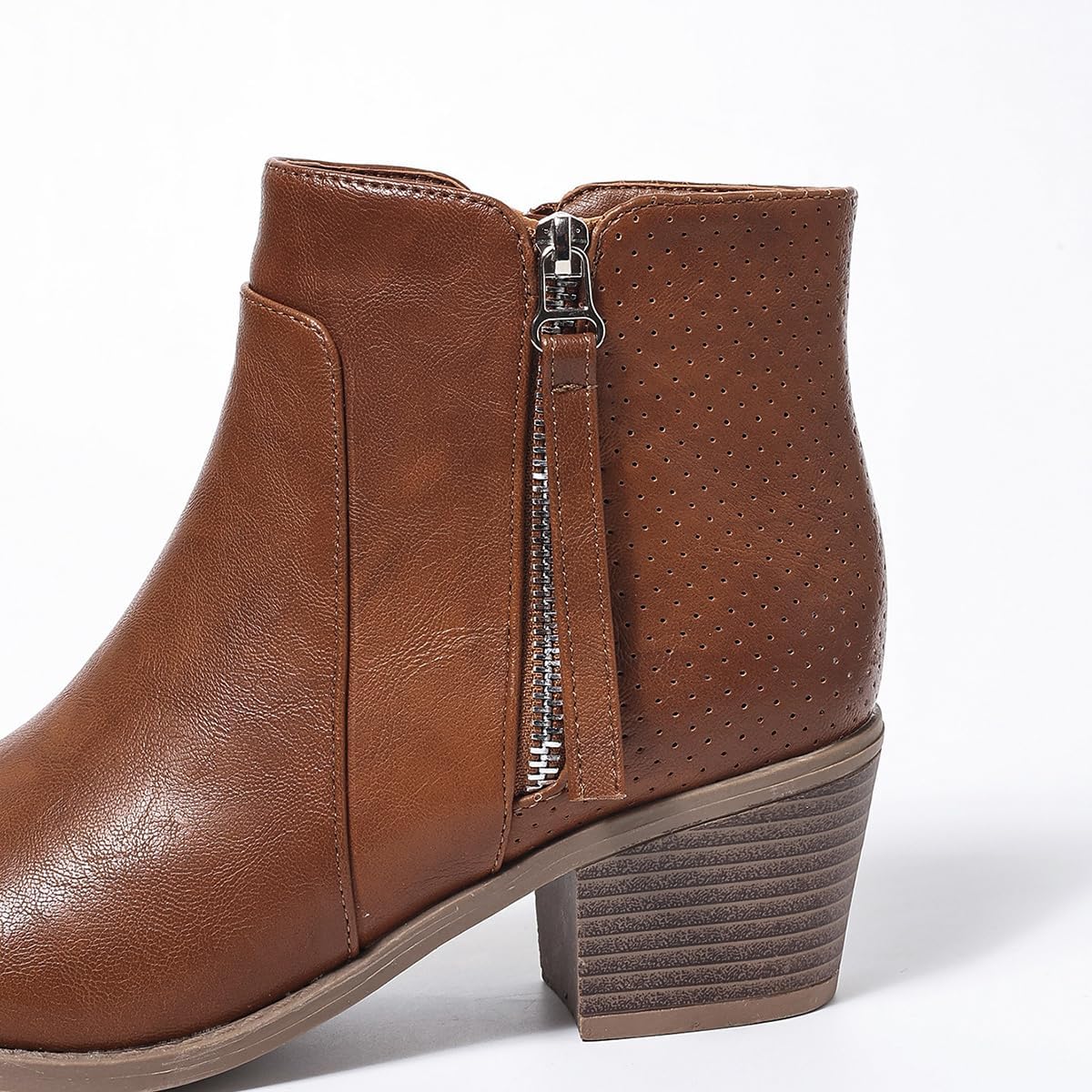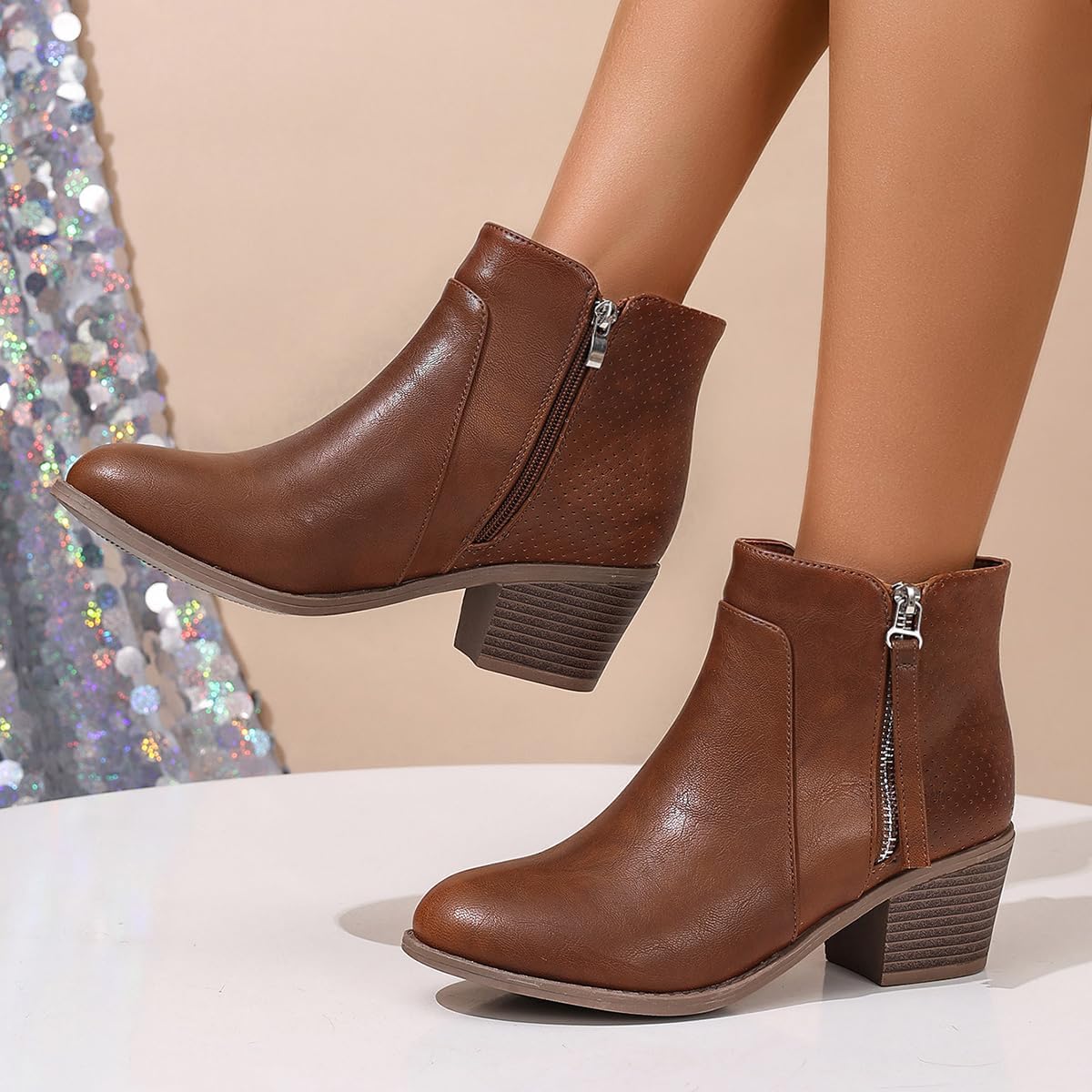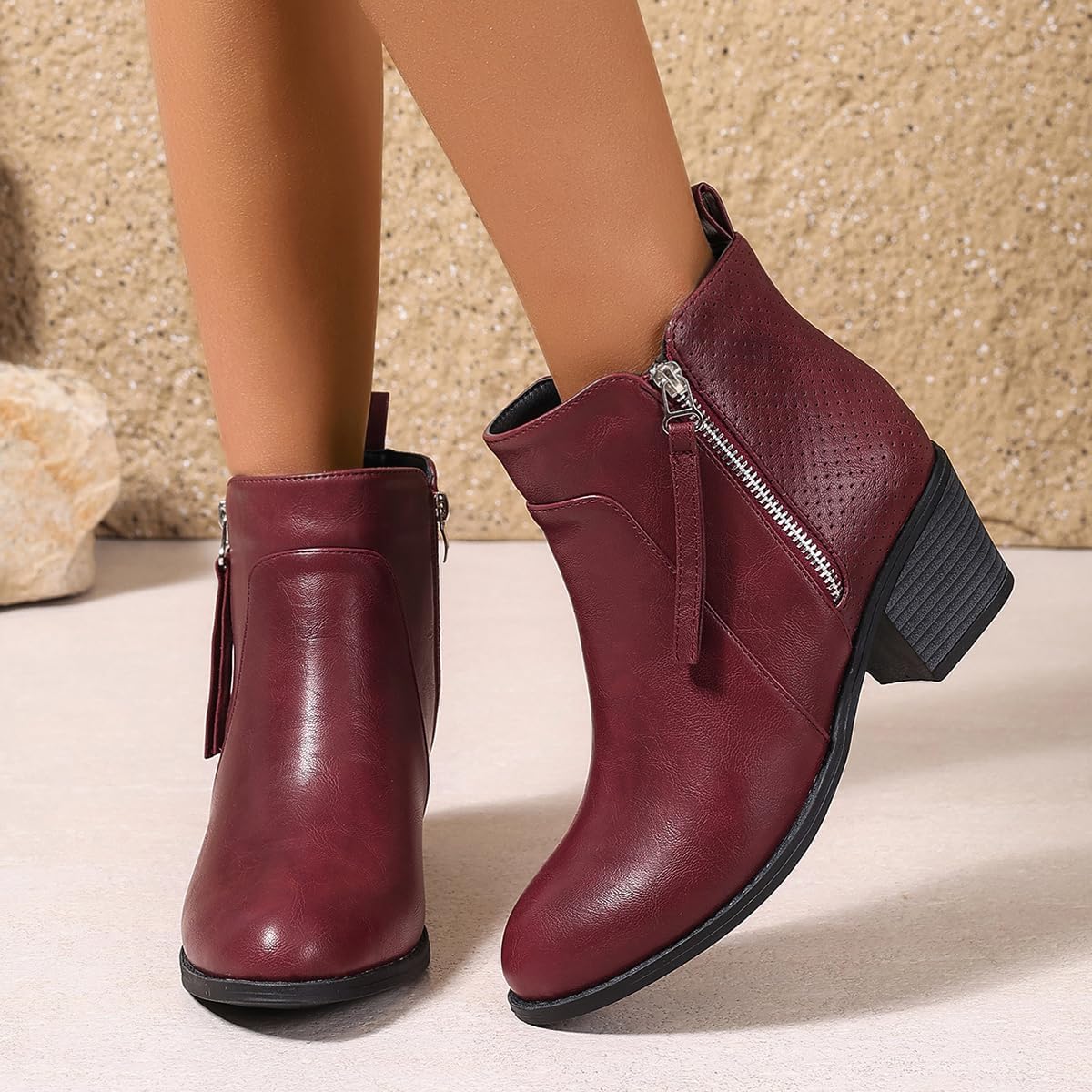 Women’s Black Faux Leather Mid-Calf Boots – Low Block Heel with Side Zipper & Perforated Detail, Round Toe Comfort Booties for Fall/Winter (9.7cm Shaft, 5.7cm Heel)