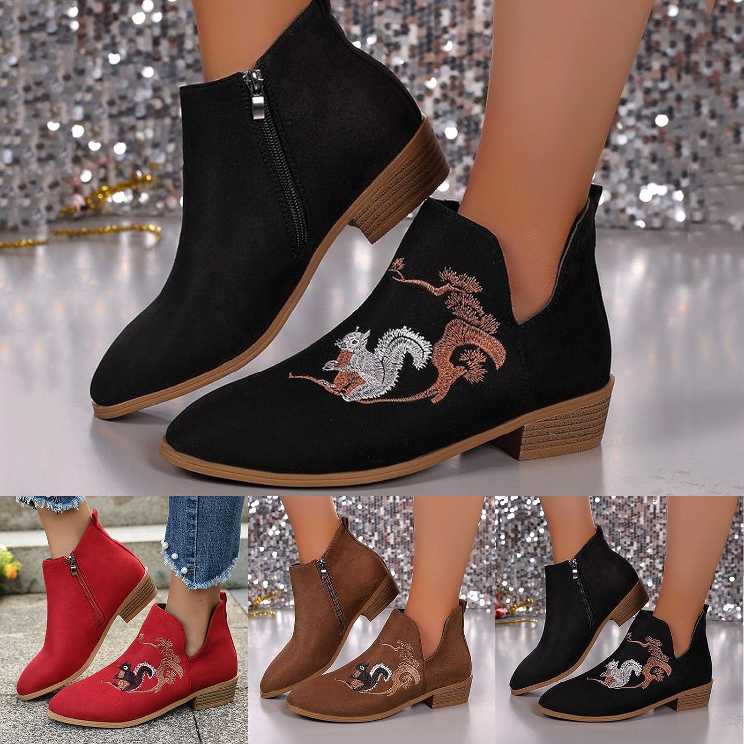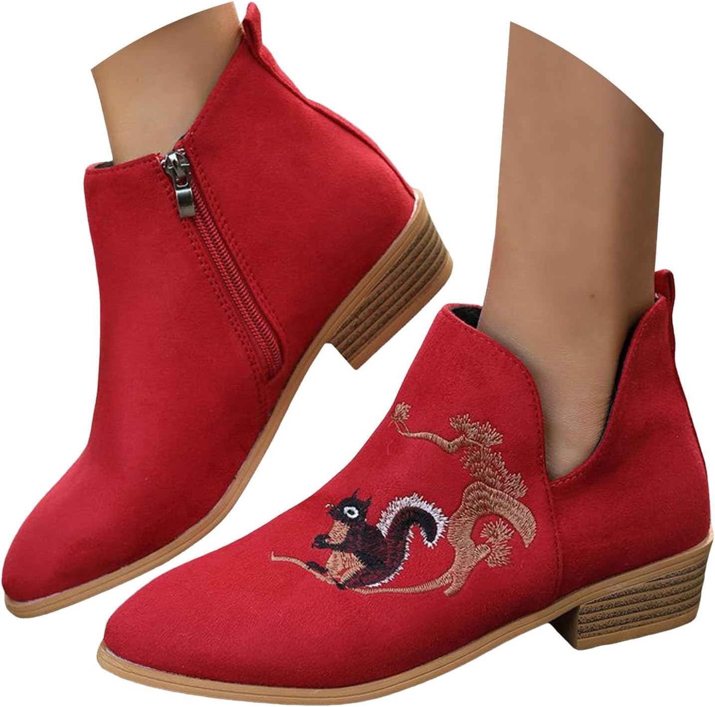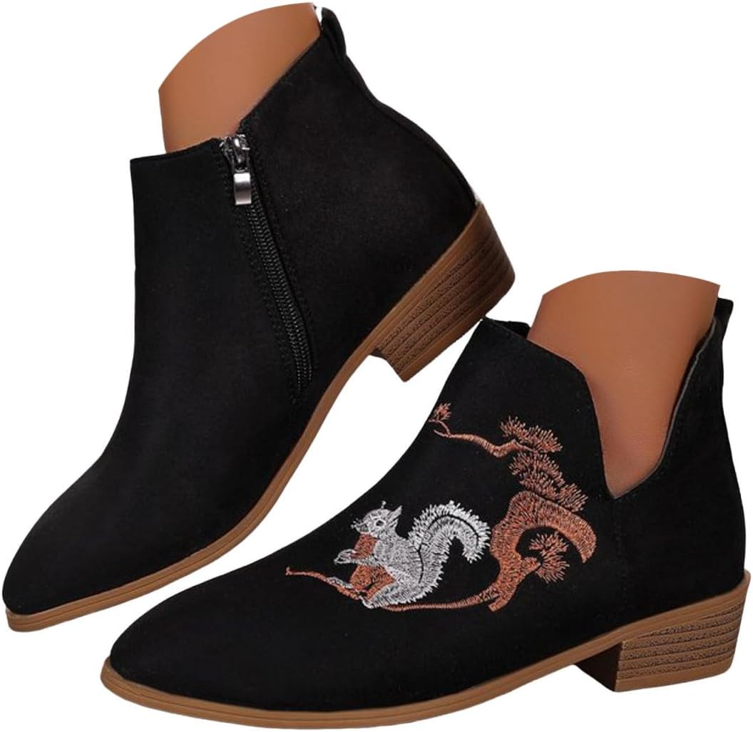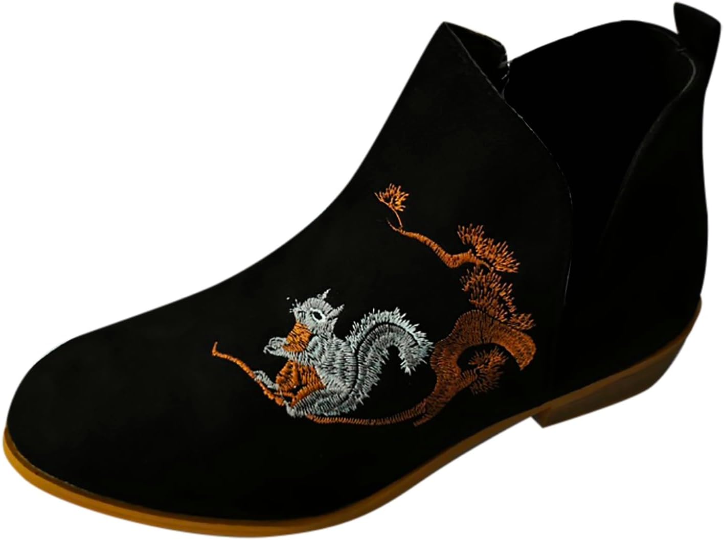 Womens Short Boots 2025 V Cutout Ankle Booties Vintage Slip on Round Toe Side Zipper Chunky Block Low Heel Booties Fashion Embroidery Casual Western Boots Comfortable Outdoor Shoes
