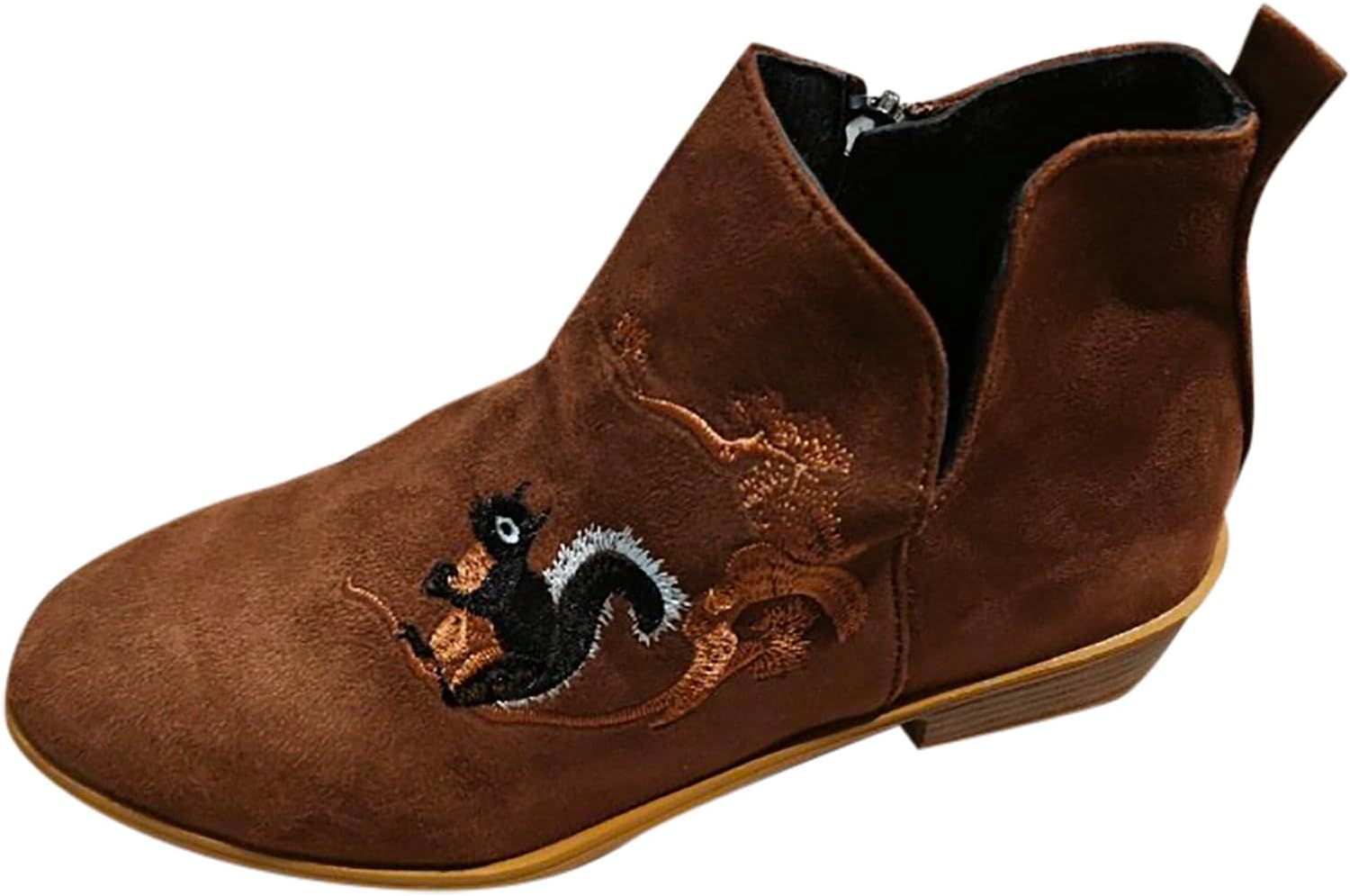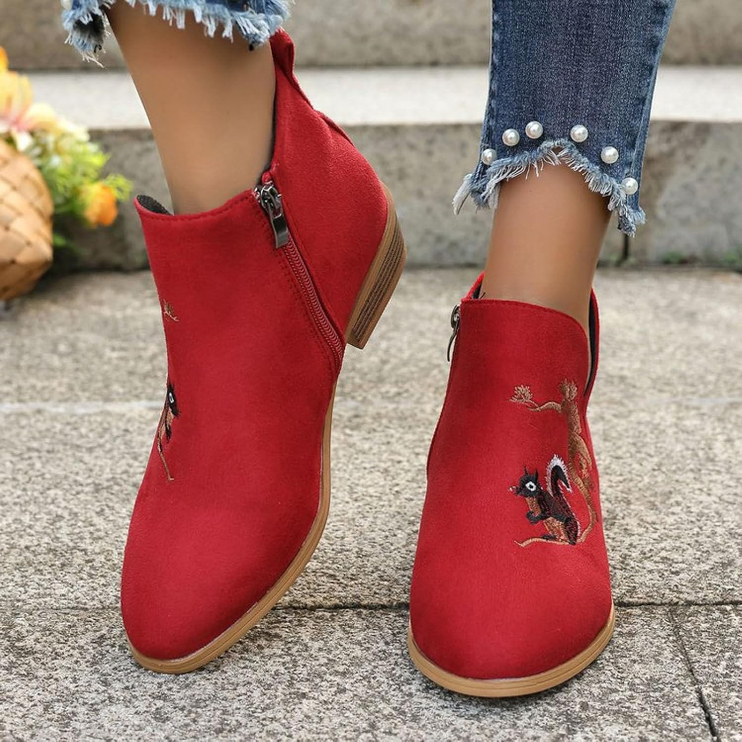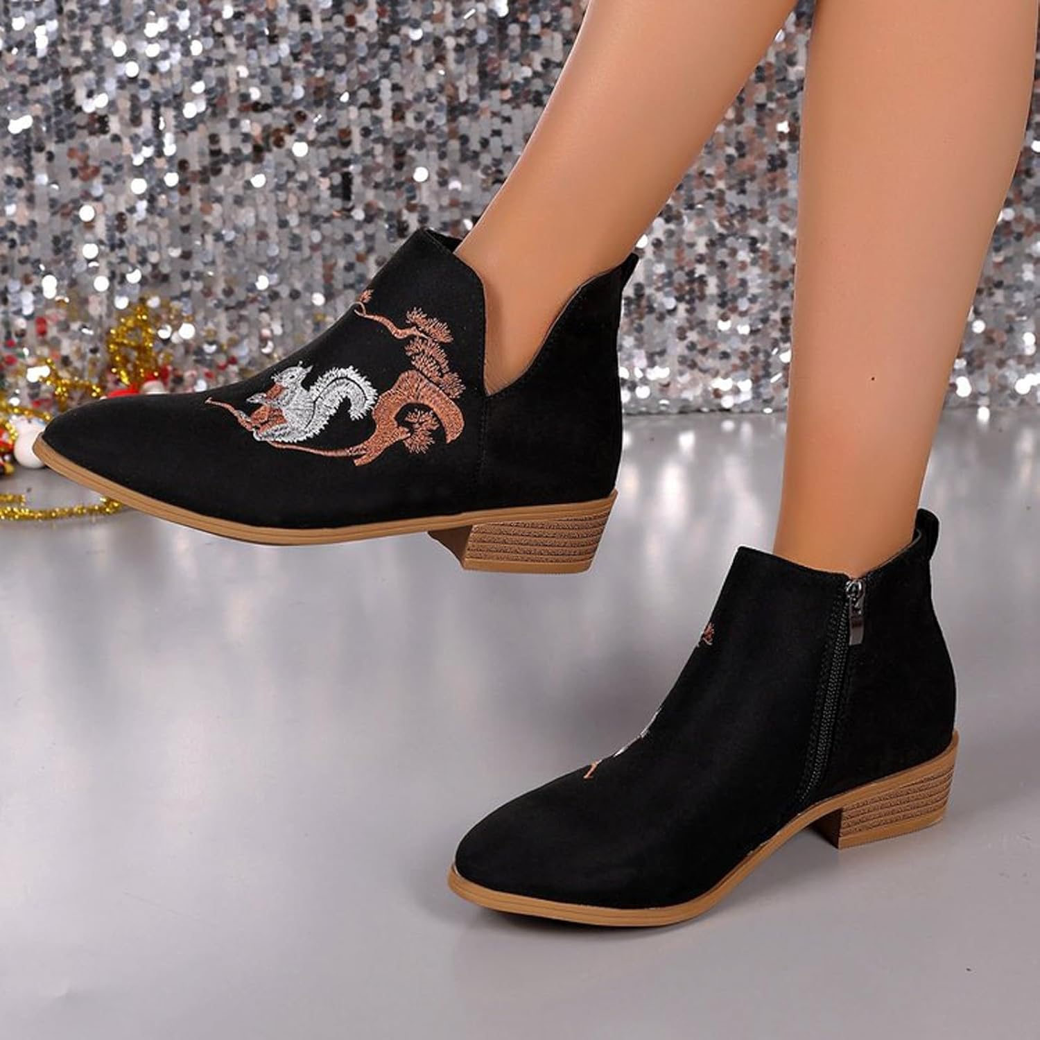 Womens Short Boots 2025 V Cutout Ankle Booties Vintage Slip on Round Toe Side Zipper Chunky Block Low Heel Booties Fashion Embroidery Casual Western Boots Comfortable Outdoor Shoes