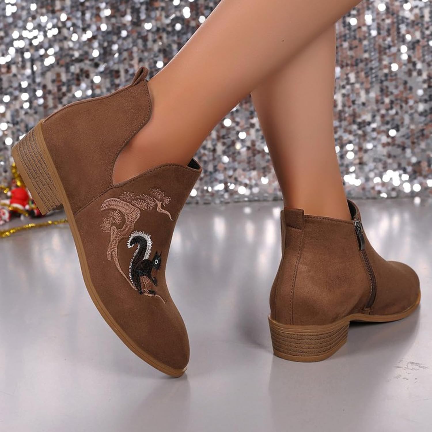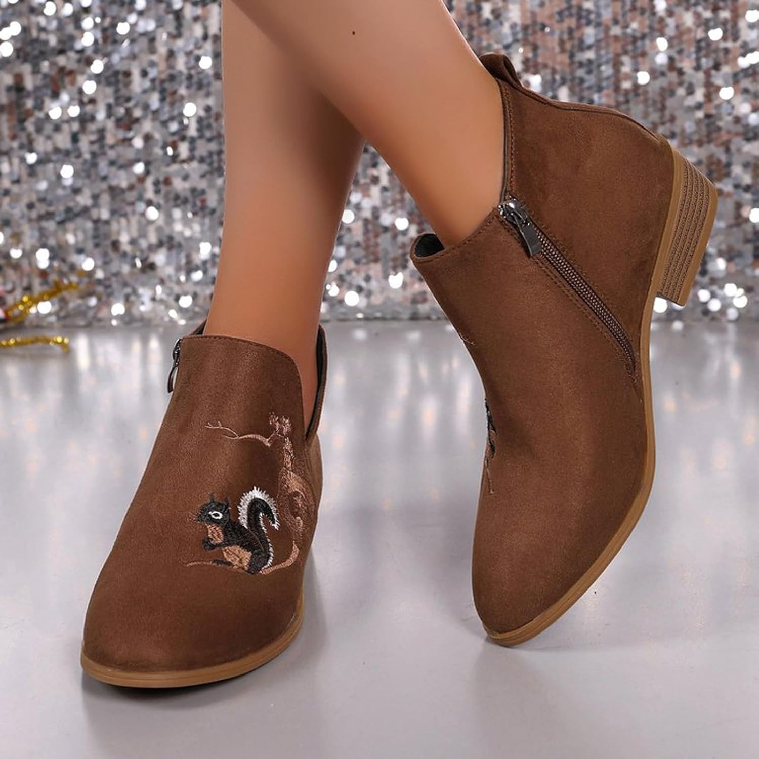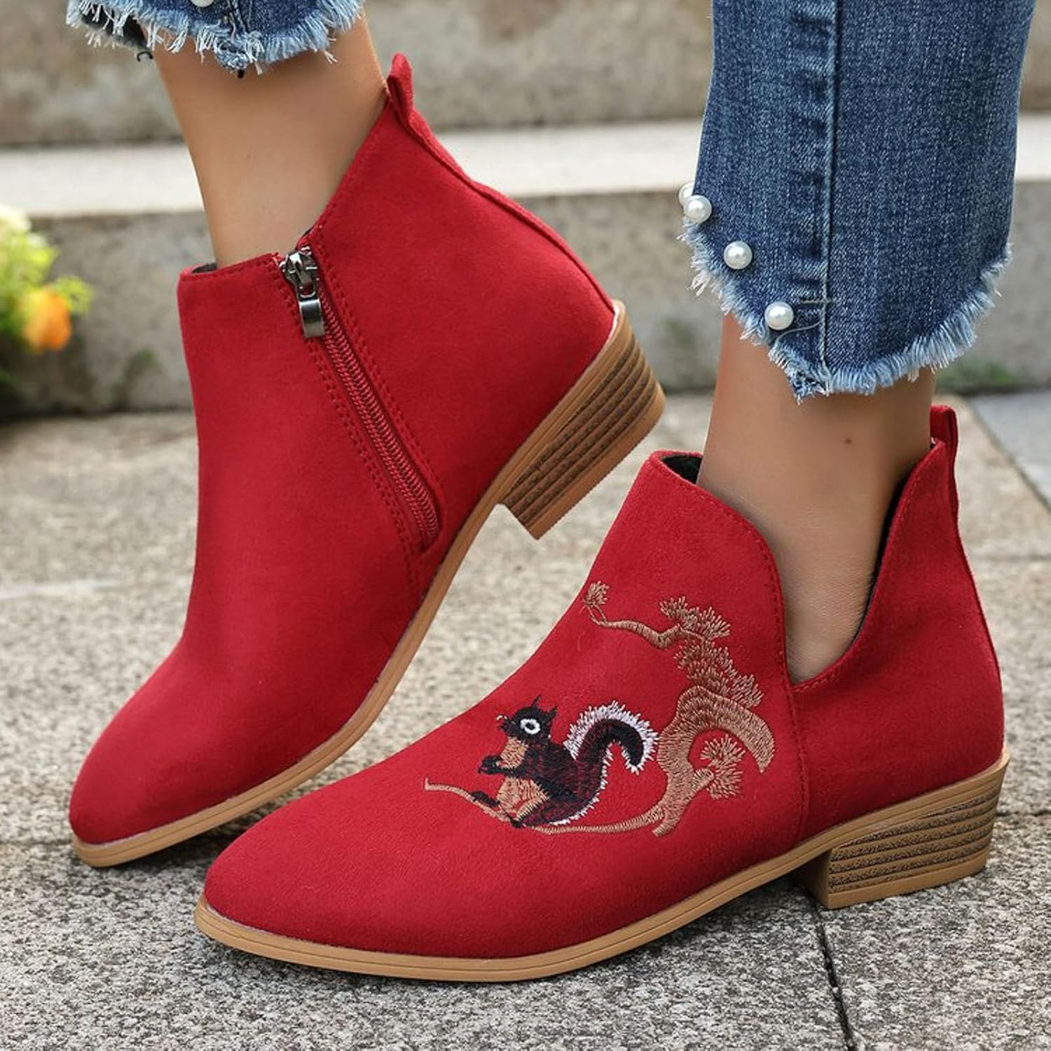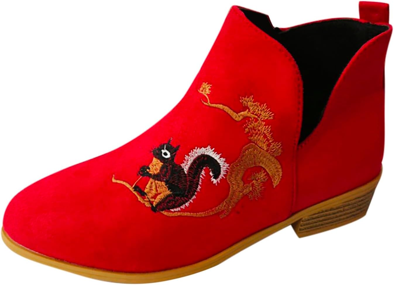 Womens Short Boots 2025 V Cutout Ankle Booties Vintage Slip on Round Toe Side Zipper Chunky Block Low Heel Booties Fashion Embroidery Casual Western Boots Comfortable Outdoor Shoes
