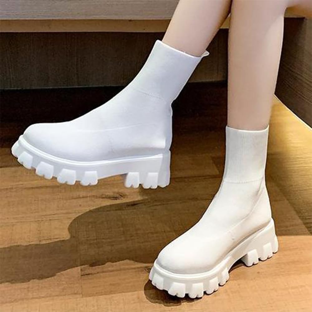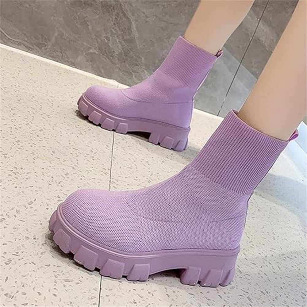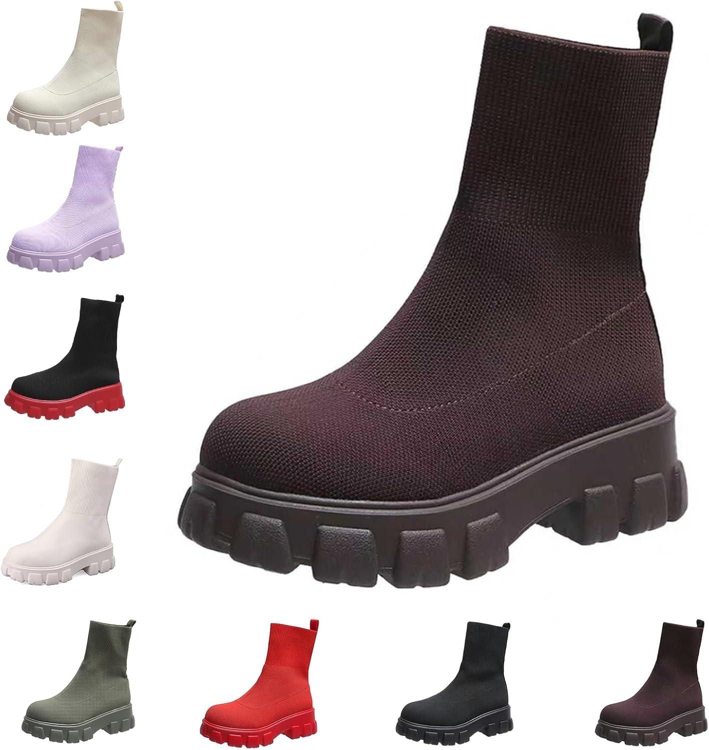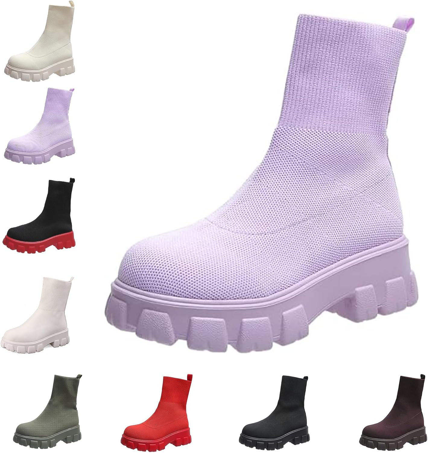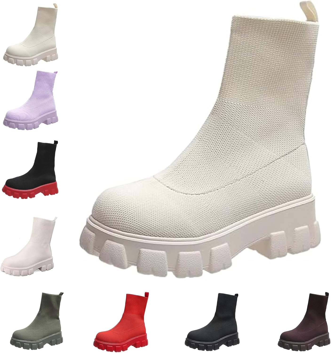 Women’s Stretch Knit Boots Platform Sole Chunky Heeled Round Toe Elastic Breathable Mid Heel Slip-on Socks Boots Chelsea Ankle Booties