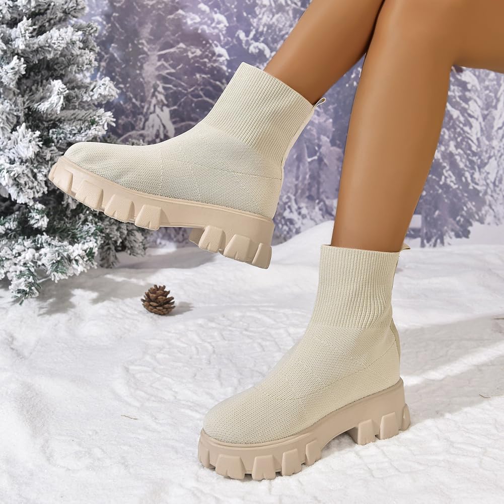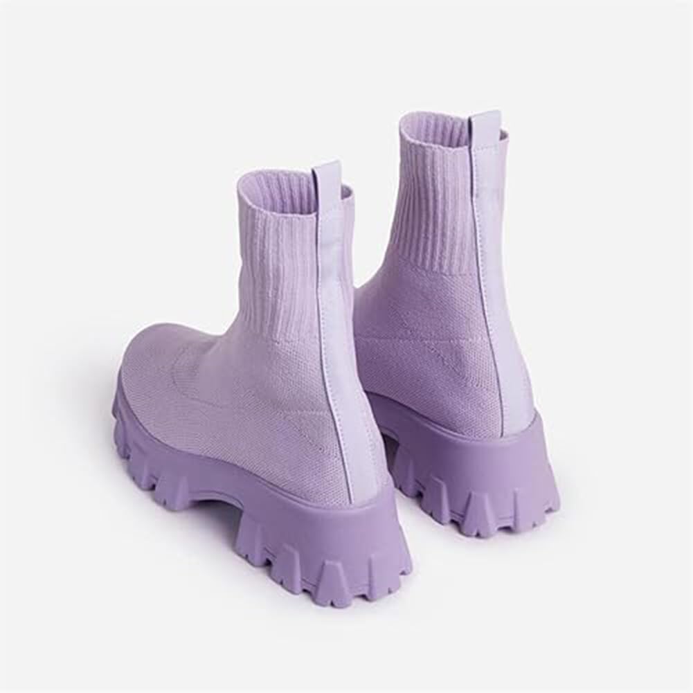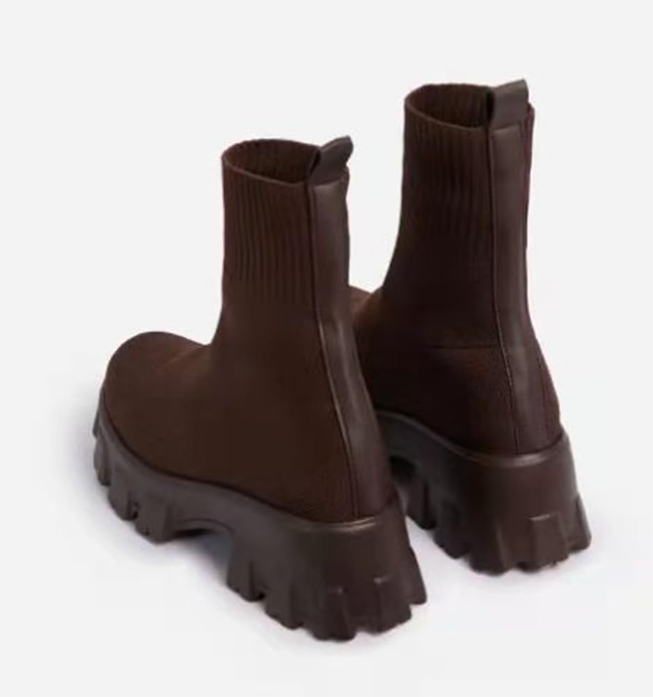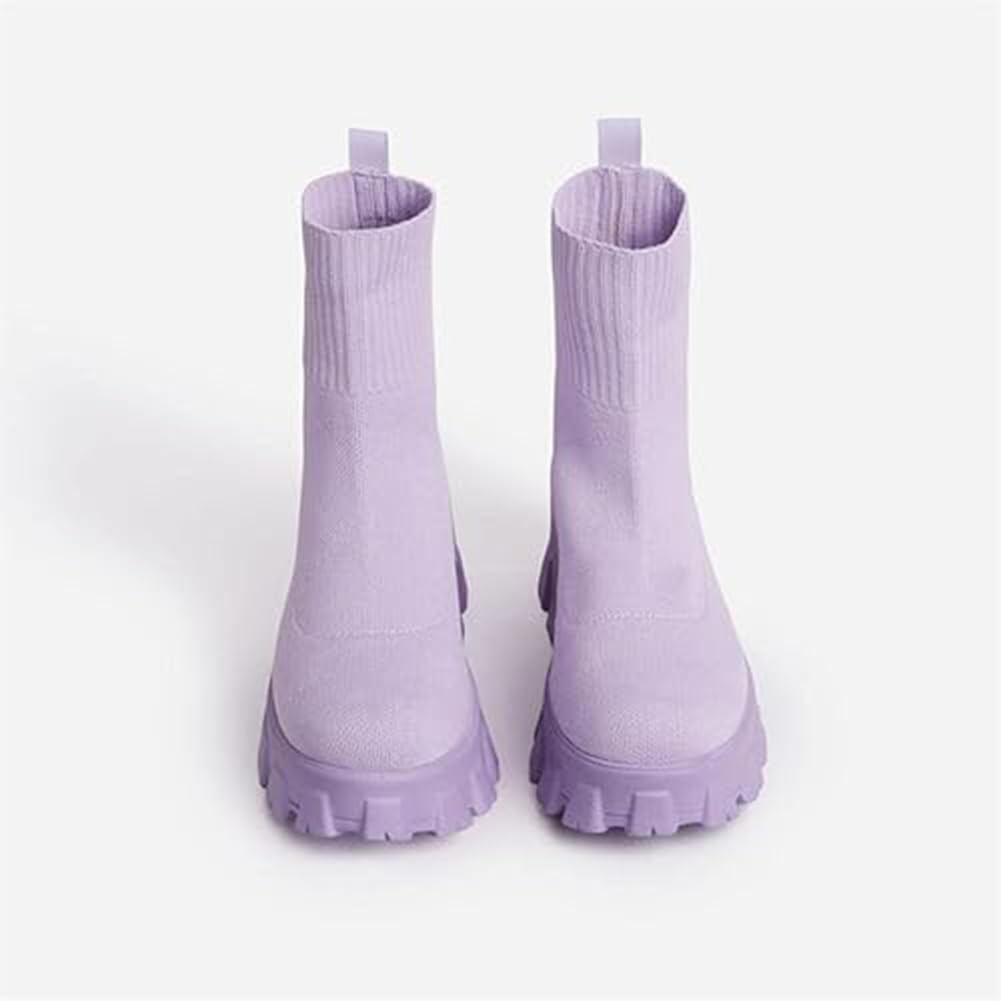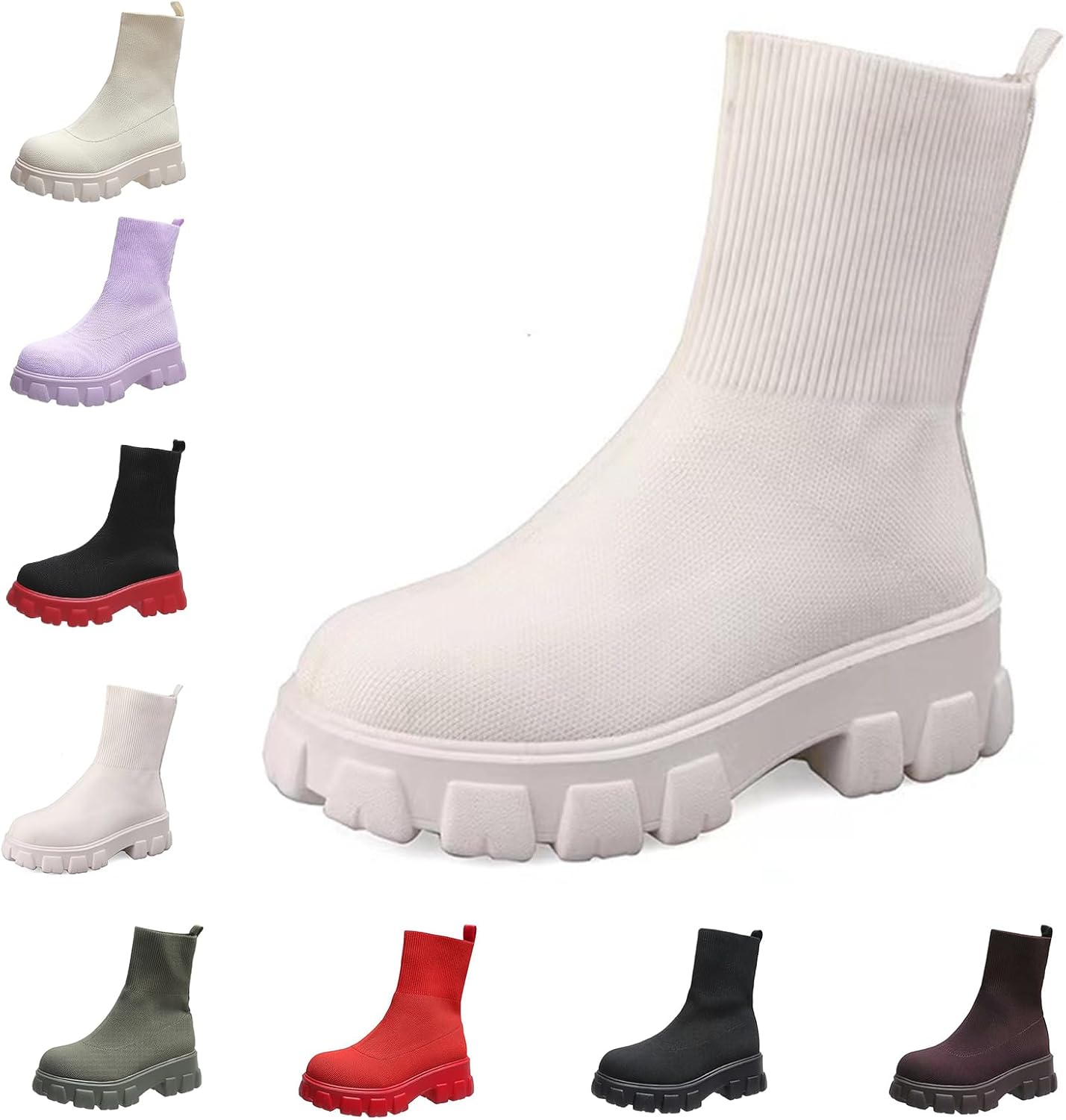 Women’s Stretch Knit Boots Platform Sole Chunky Heeled Round Toe Elastic Breathable Mid Heel Slip-on Socks Boots Chelsea Ankle Booties
