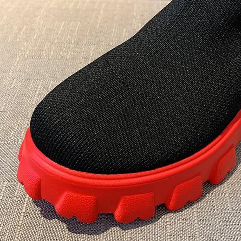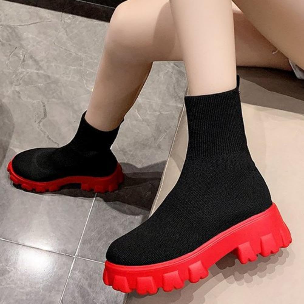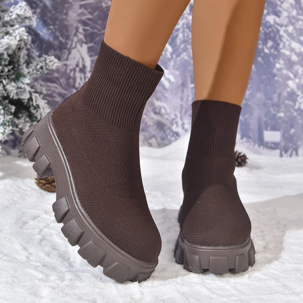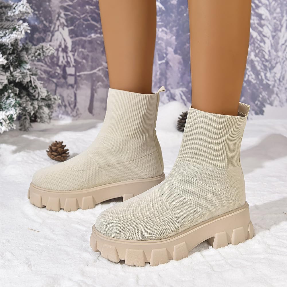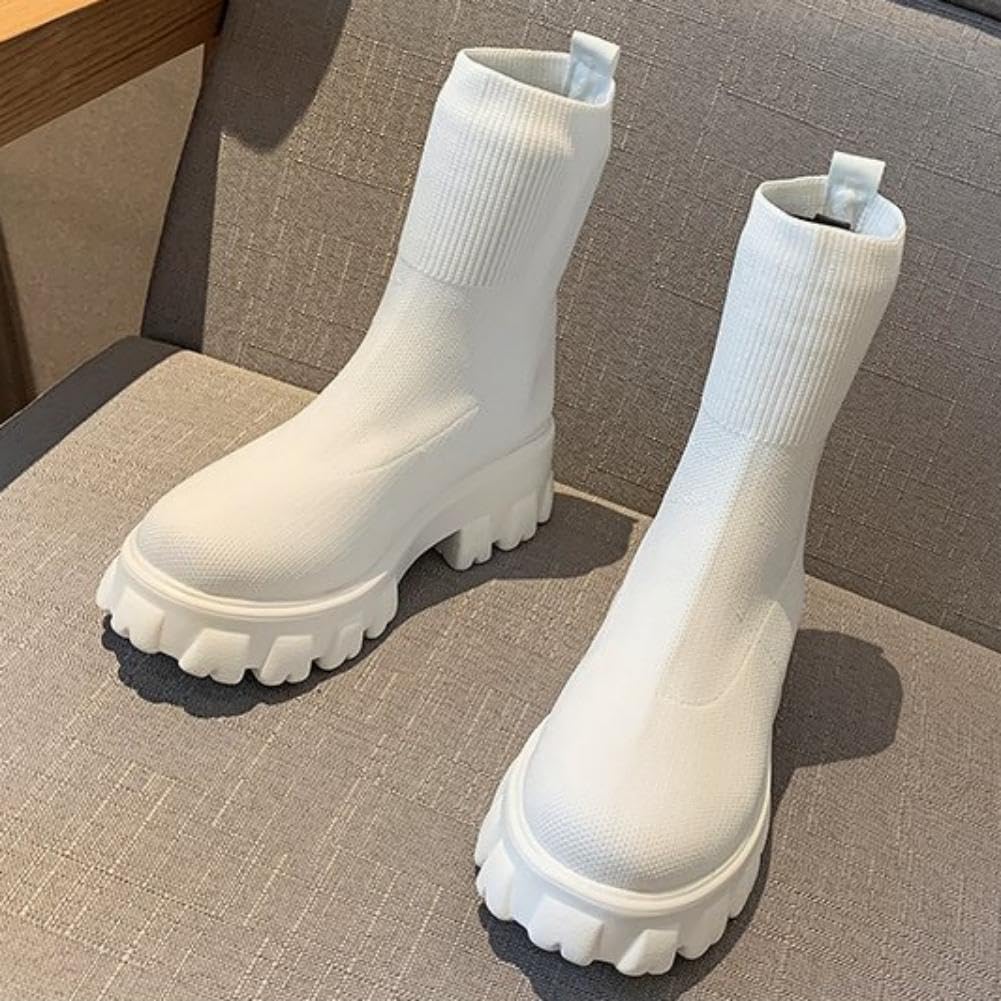 Women’s Stretch Knit Boots Platform Sole Chunky Heeled Round Toe Elastic Breathable Mid Heel Slip-on Socks Boots Chelsea Ankle Booties