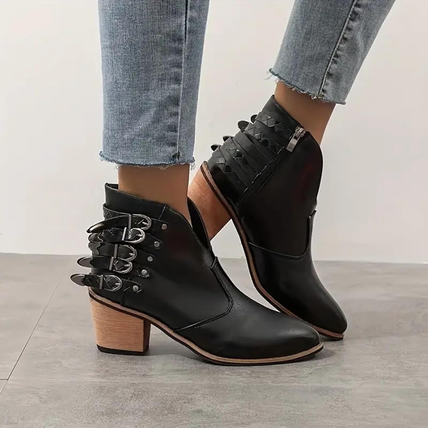 Women’s V Cut Out Stacked Heel Retro Ankle Boots with Belt Buckle Side Zipper Block Low Heel Pointed Toe Goth Punk Boot Women Chunky Heels Fall Winter Leather Short Booties Shoes
