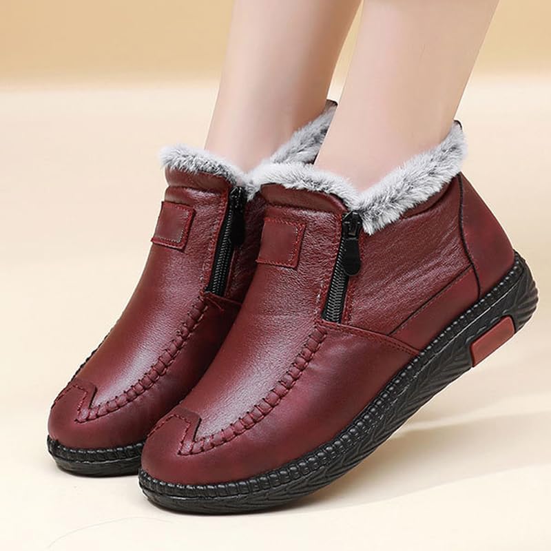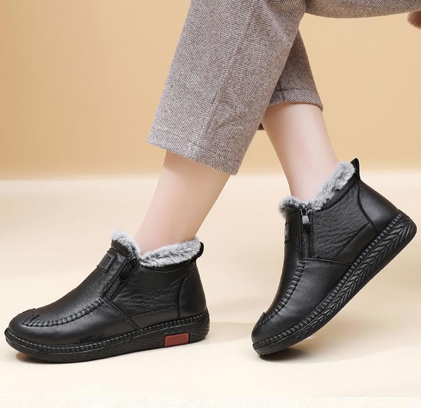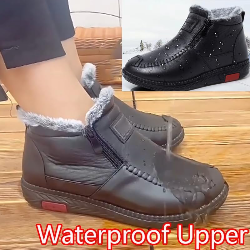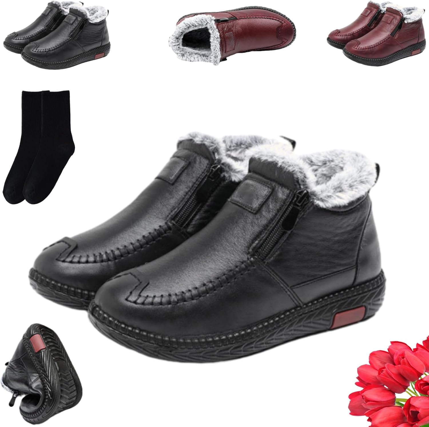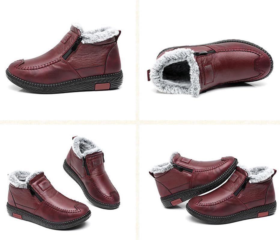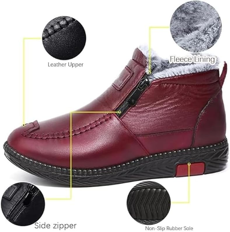 Women’s Waterproof Non-Slip Cotton Leather Boots with Side Zipper, Older Women Winter Warm Comfortable Fur Lined Ankle Booties, Lightweight Anti-Slip Walking Snow Shoes